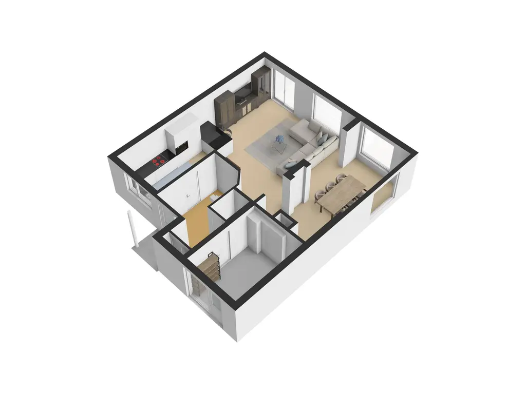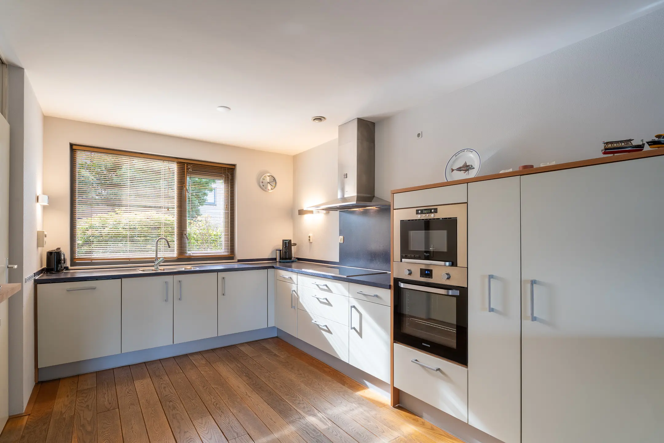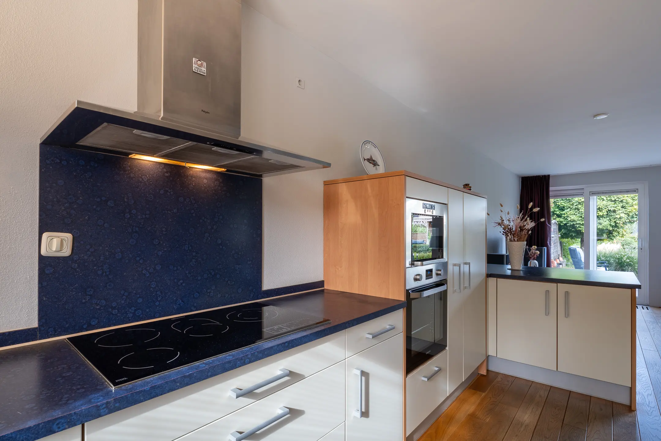 De aan de voorzijde gelegen open keuken is opgesteld in een L-vorm, voorzien van diverse onderkasten en een apothekerskast. De aanwezige apparatuur bestaat uit een 4 pits keramische kookplaat, een vaatwasser, een koelkast, vriezer, een spoelbak en een magnetron en aparte oven. Het schiereiland biedt extra werkruimte én bergruimte.
