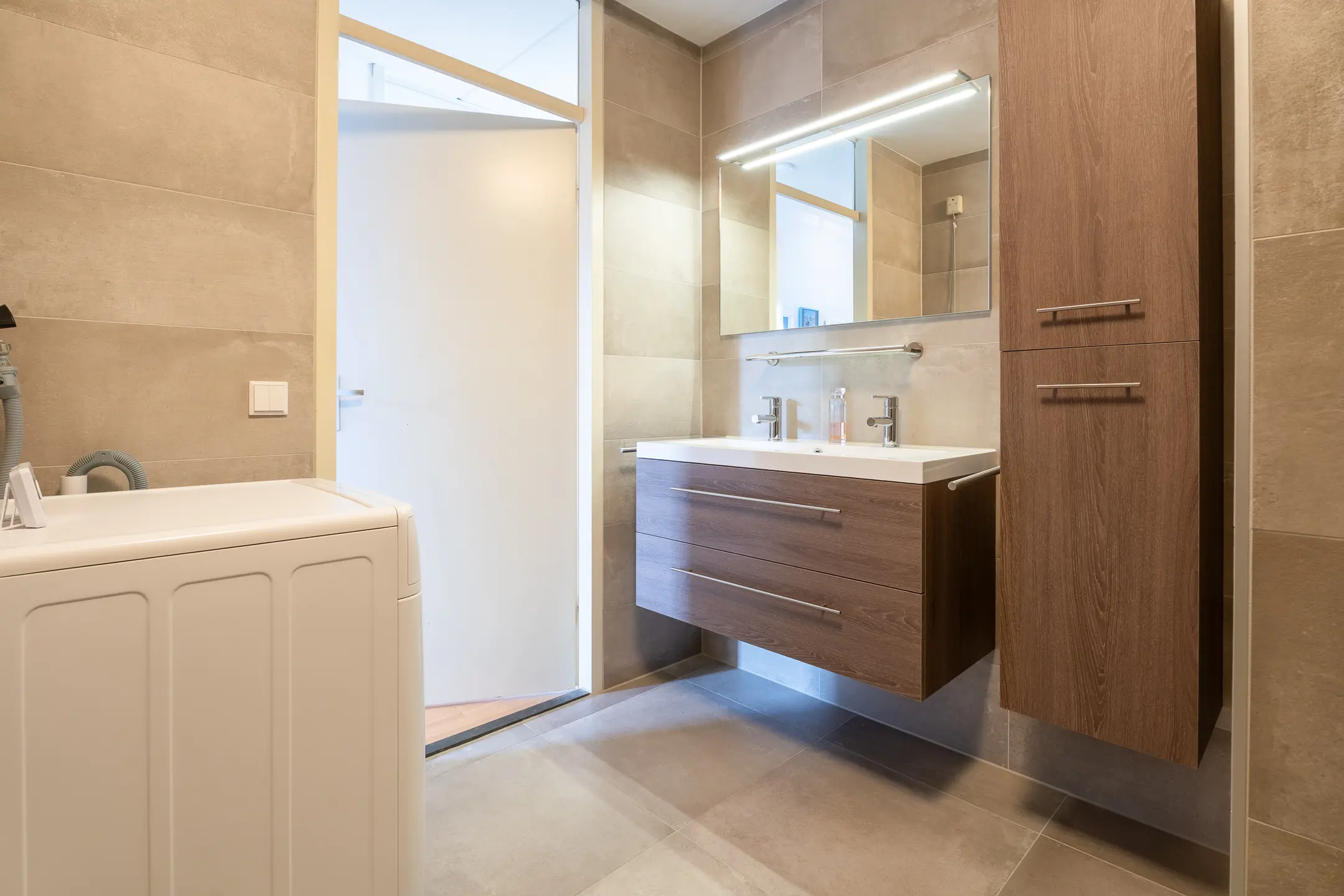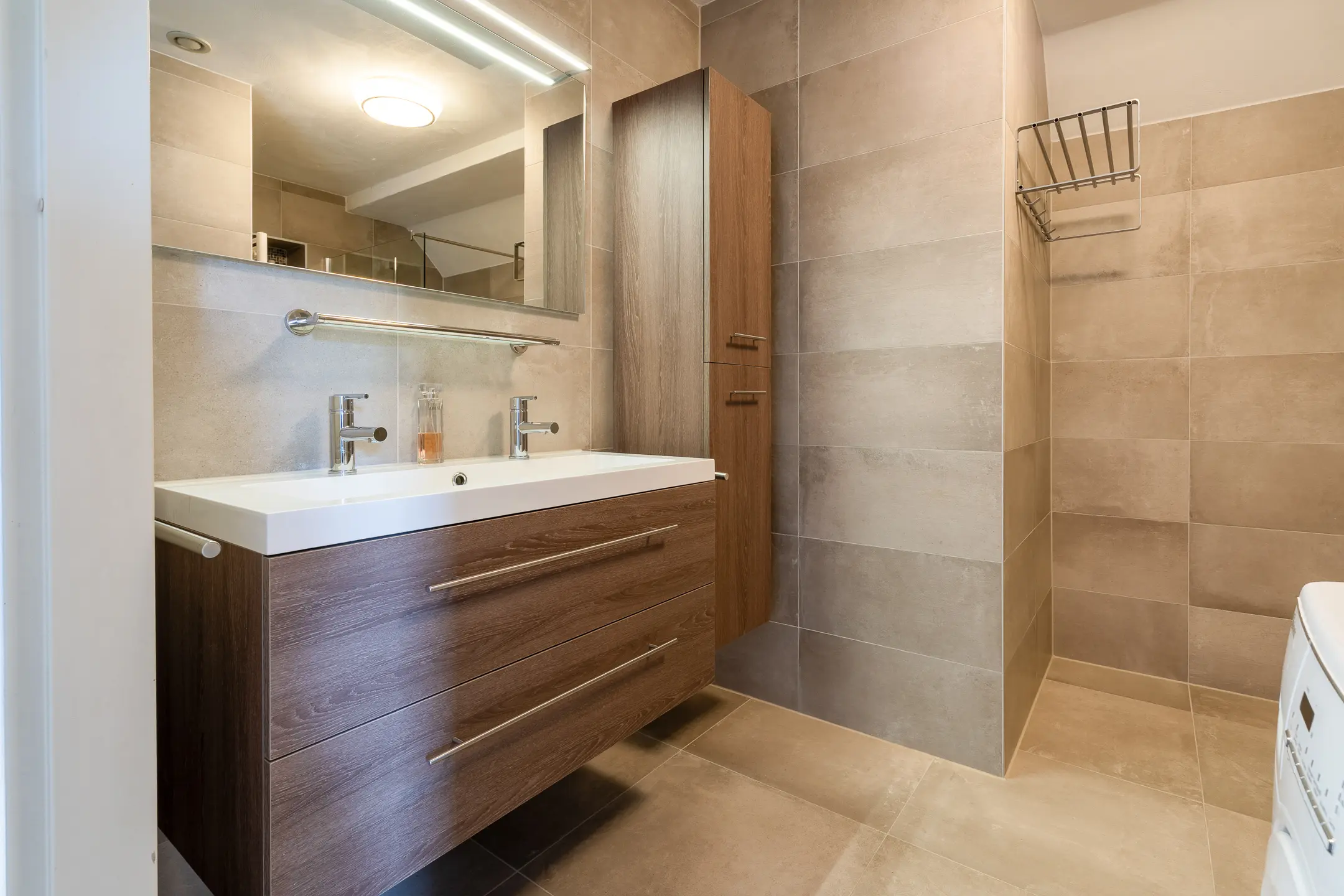 De compleet uitgeruste badkamer is volledig betegeld. Er is een inloopdouche, een wastafelmeubel, en een toilet aanwezig. De aansluiting voor de wasmachine is momenteel in de badkamer maar deze is eventueel te verplaatsen naar bijvoorbeeld de zolder of beneden naar de berging. De badkamer is toegankelijk via de overloop.