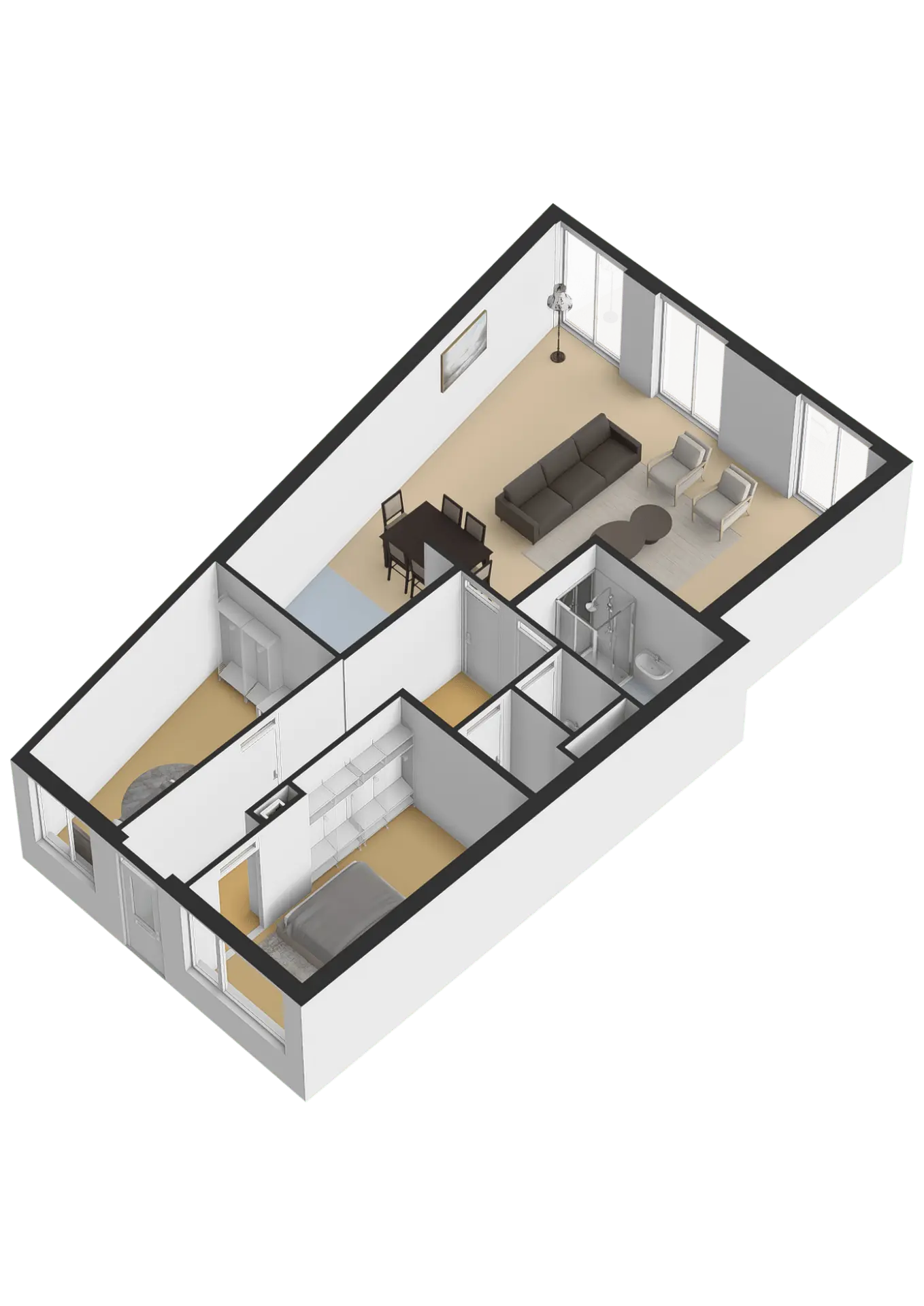 Het appartement biedt ruimte voor twee slaapkamers, ideaal als hoofdslaapkamer en een extra werk-, logeer- of kinderkamer.