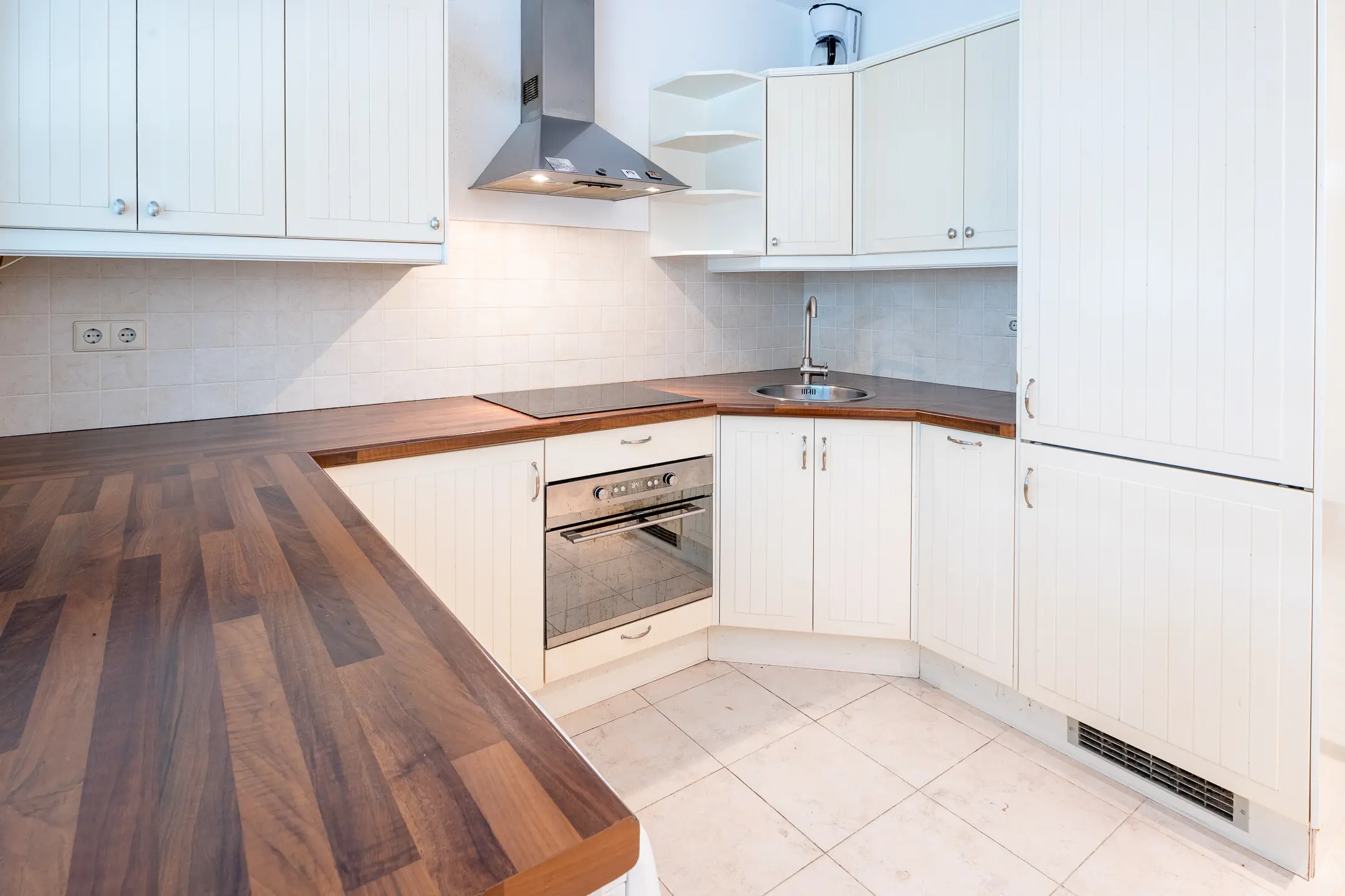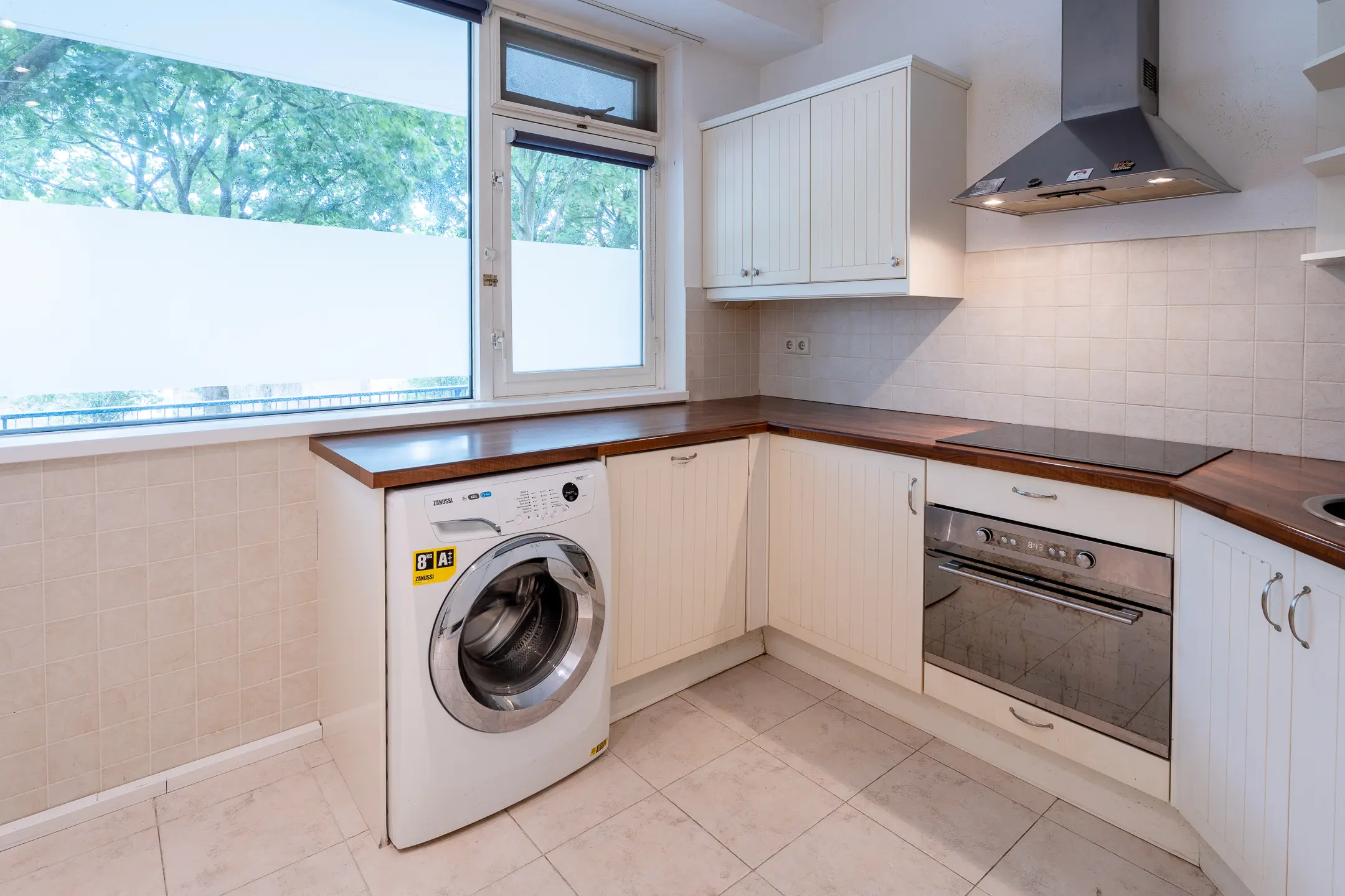Ruime woonkamer (33m²) met grote raampartij, laminaatvloer en geschilderde wanden. De keuken heeft een keukenblok in U-opstelling en volop kastruimte en inbouwapparatuur, zoals: inductie kookplaat, koel-vriescombinatie en combi-oven. In de keuken is ook de opstelling voor de was-apparatuur (wasmachine aanwezig) en is er een elektrische boiler (eigendom) voor het warme water.