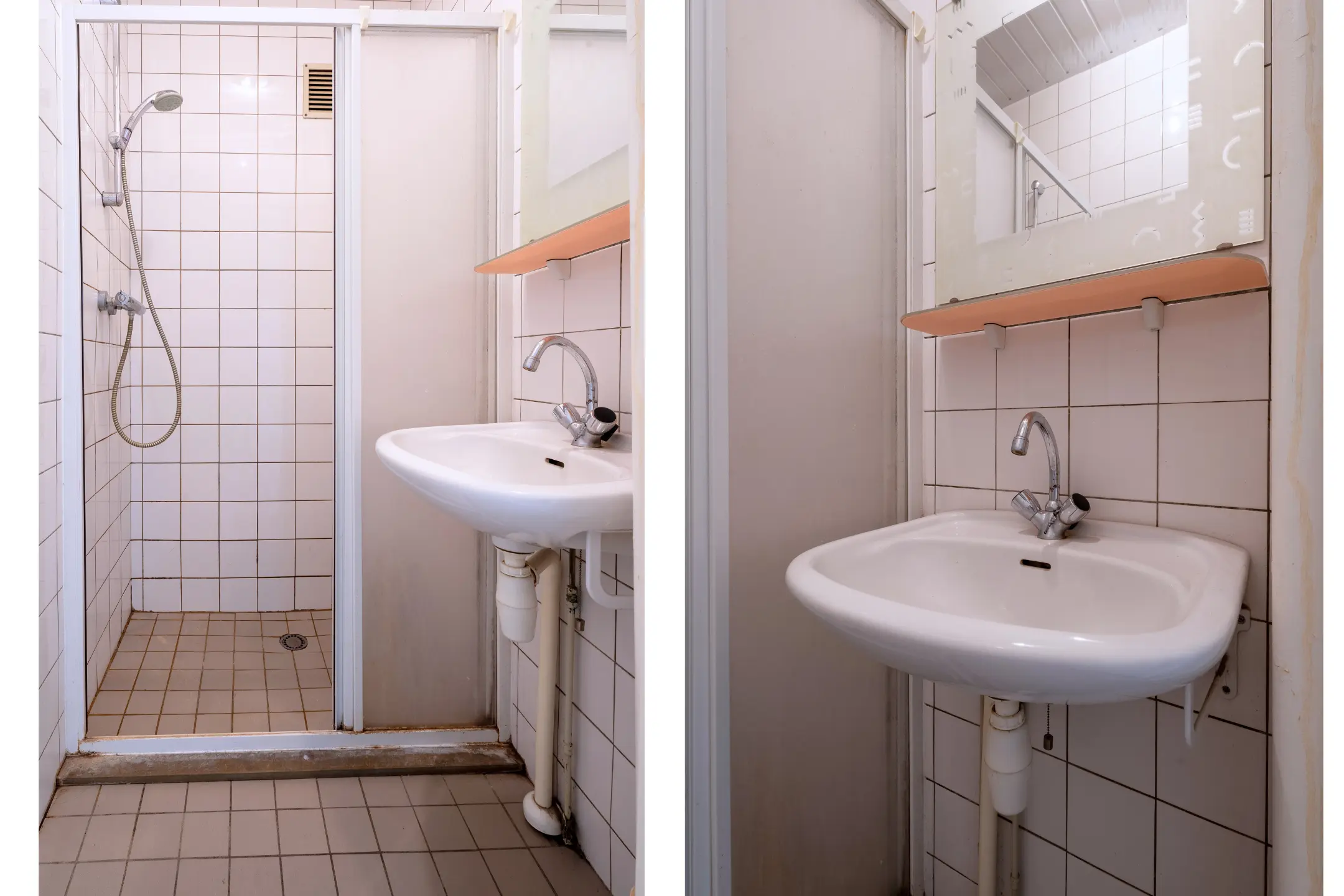 De badkamer is ingericht met een douche en wastafel en het toilet is betegeld en voorzien van fonteintje.