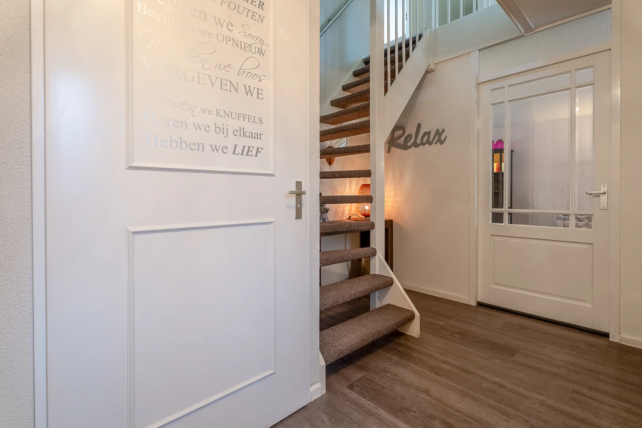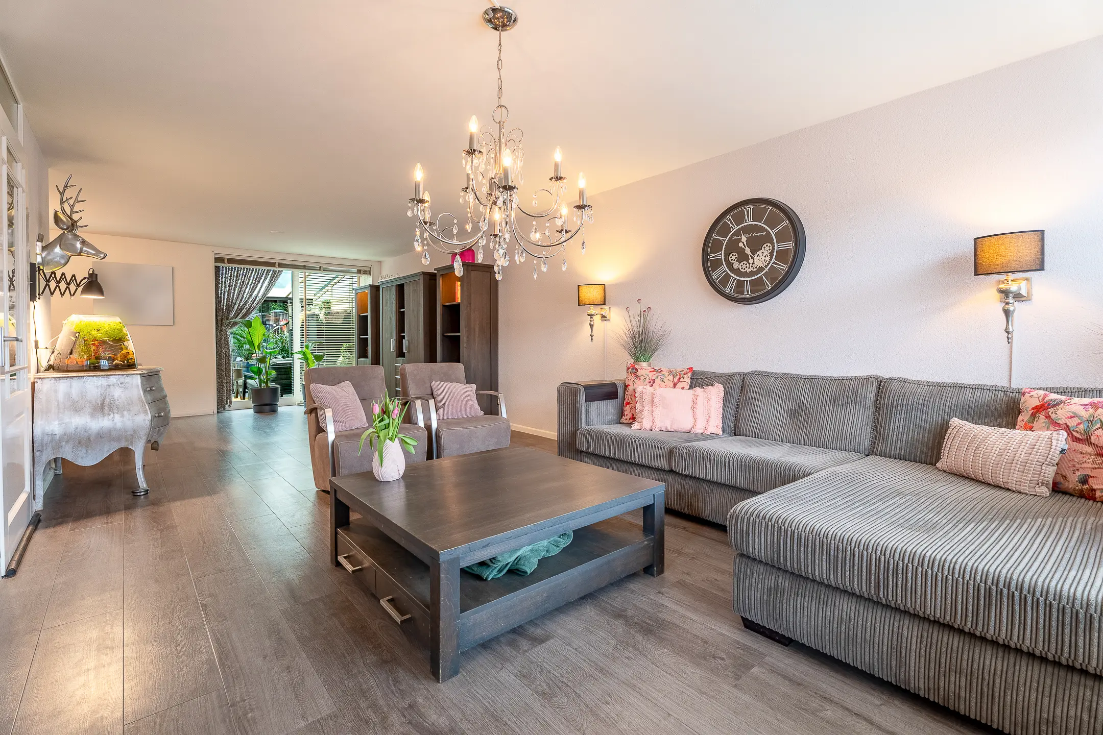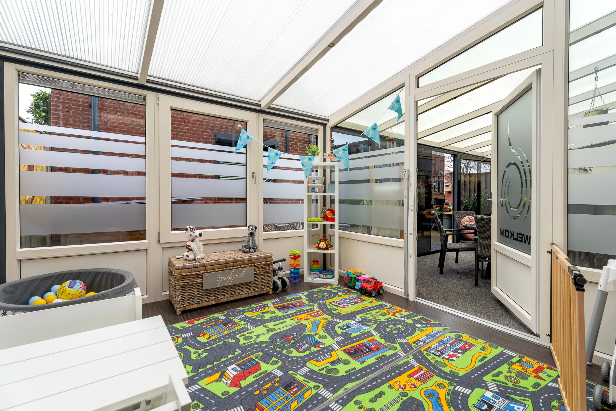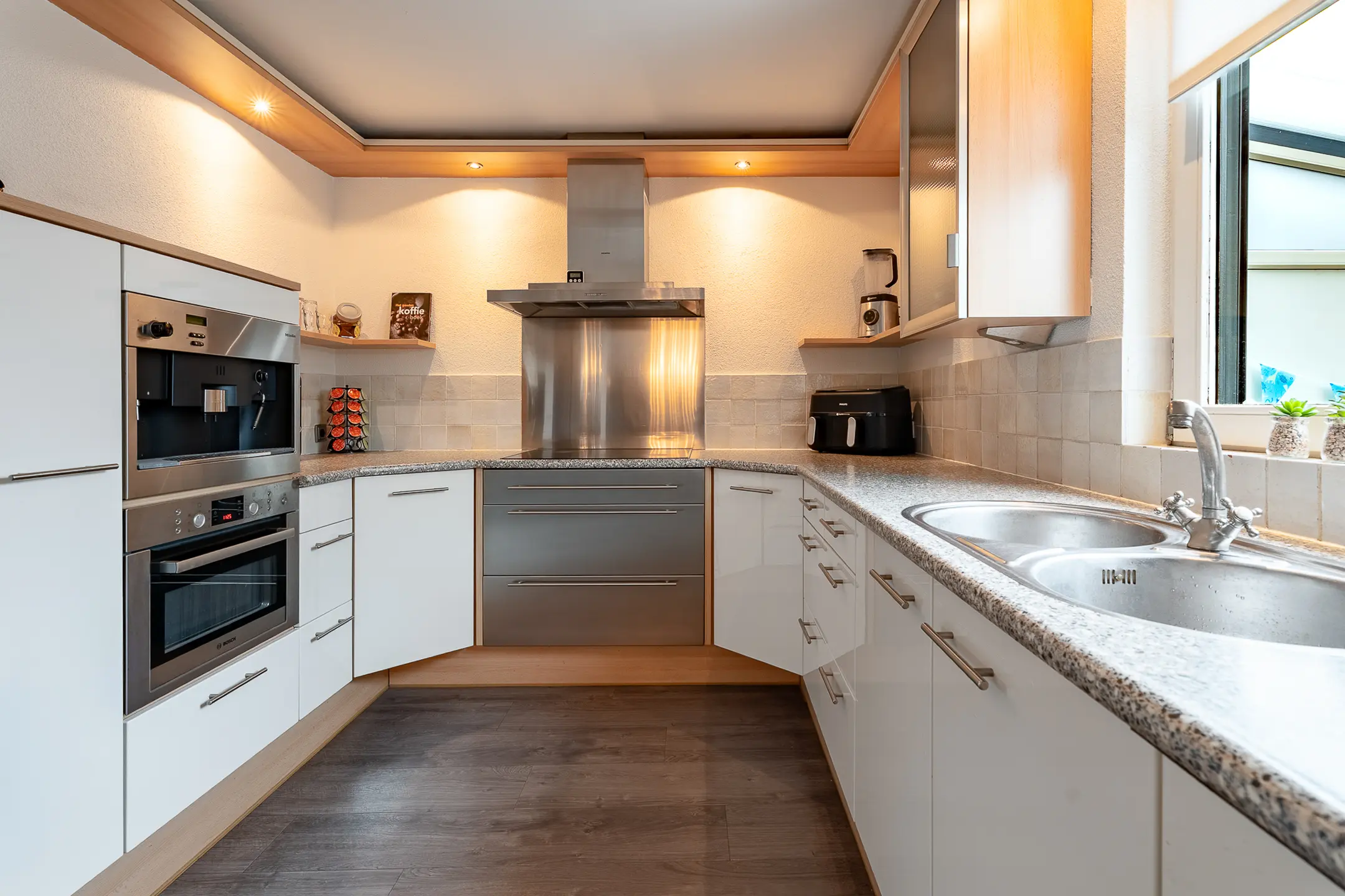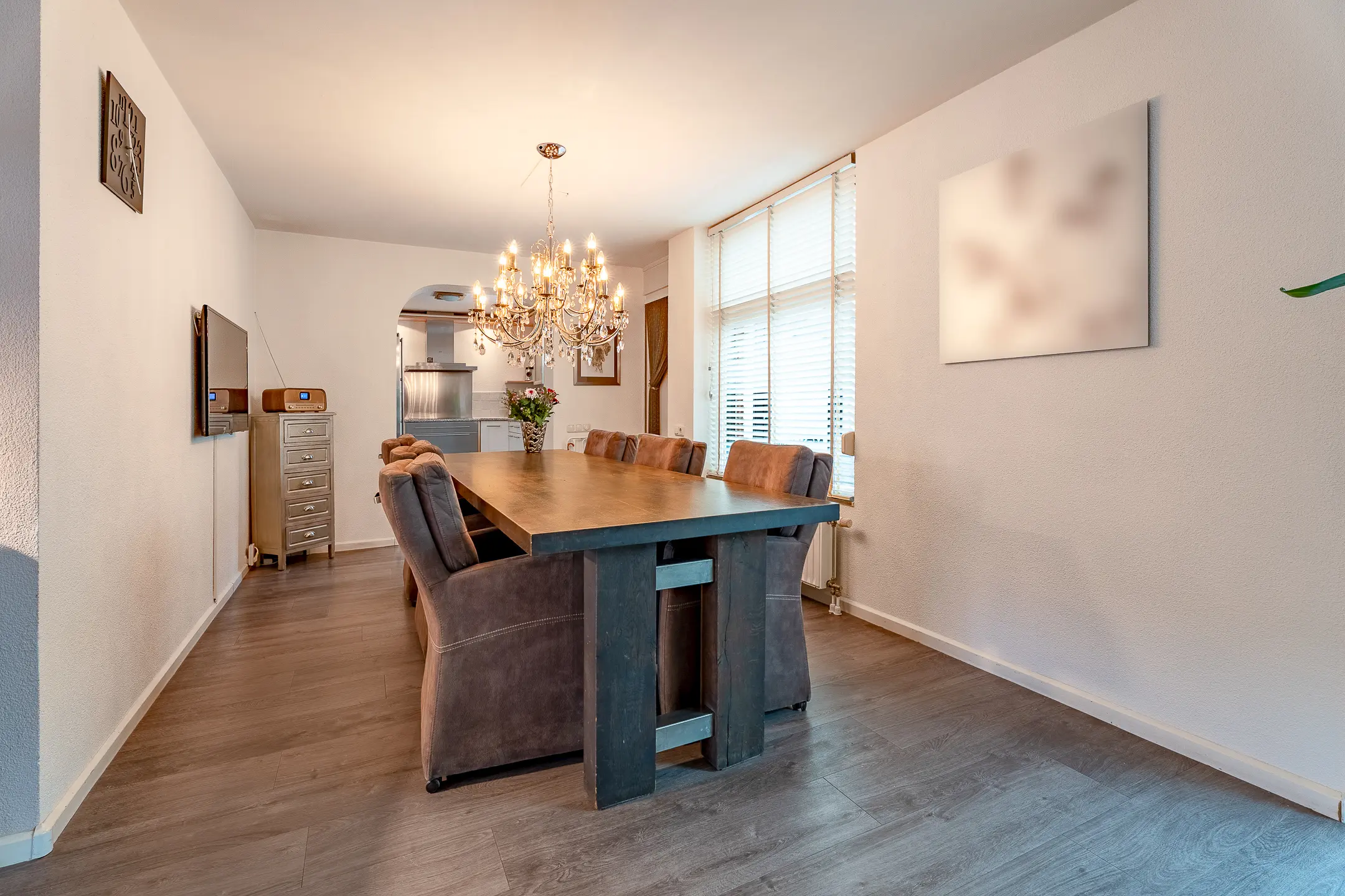 Entree, hal met meterkast, toilet, trapopgang en toegang tot de woonkamer. Van oorsprong was er een garage mogelijk, maar eigenaren hebben gekozen deze te splitsen in een werkruimte (aan de voorzijde van de woning) en een keuken (aan de achterzijde van de woning). Hierdoor is een magnifieke woonkamer ontstaan van 50m², een keuken van ruim 9m² en tel je daar dan nog de serre bij op, dan heb je een leefruimte van maar liefst 103m²!!! Keurig ingericht met lichte pvc vloer en gestukadoorde wand en plafondafwerking. De keuken is in een royale hoekopstelling met volop kastruimte en inbouwapparatuur; vaatwasmachine, keramisch koken, combi-oven, ingebouwde koffiemachine en vrijstaande Amerikaanse koel- vriescombinatie. Aansluitend de serre van aluminium en kunststof met glazen schuifpanelen en opgedeeld in twee ruimtes. De serre is aan de buitenzijde voorzien van screens. De kleine ruimte, voorzien van plissé raambekleding tegen het dak, kun je verwarmen en koelen met de airco-unit en de grote ruimte kun je middels de schuifpanelen in de zomer bij je tuin betrekken.