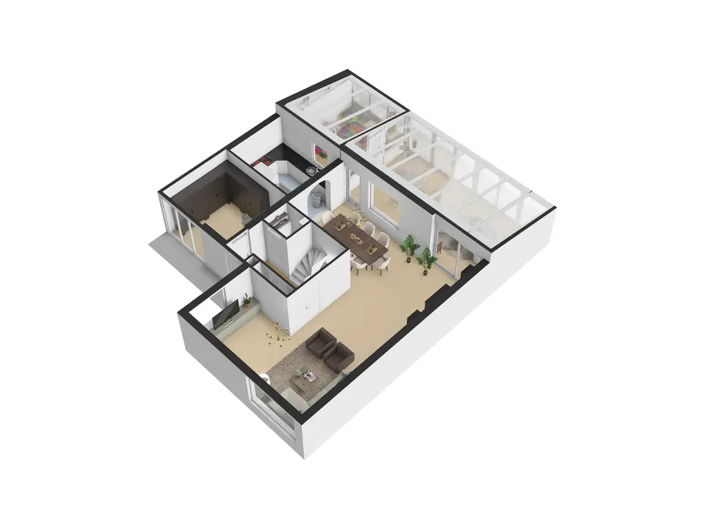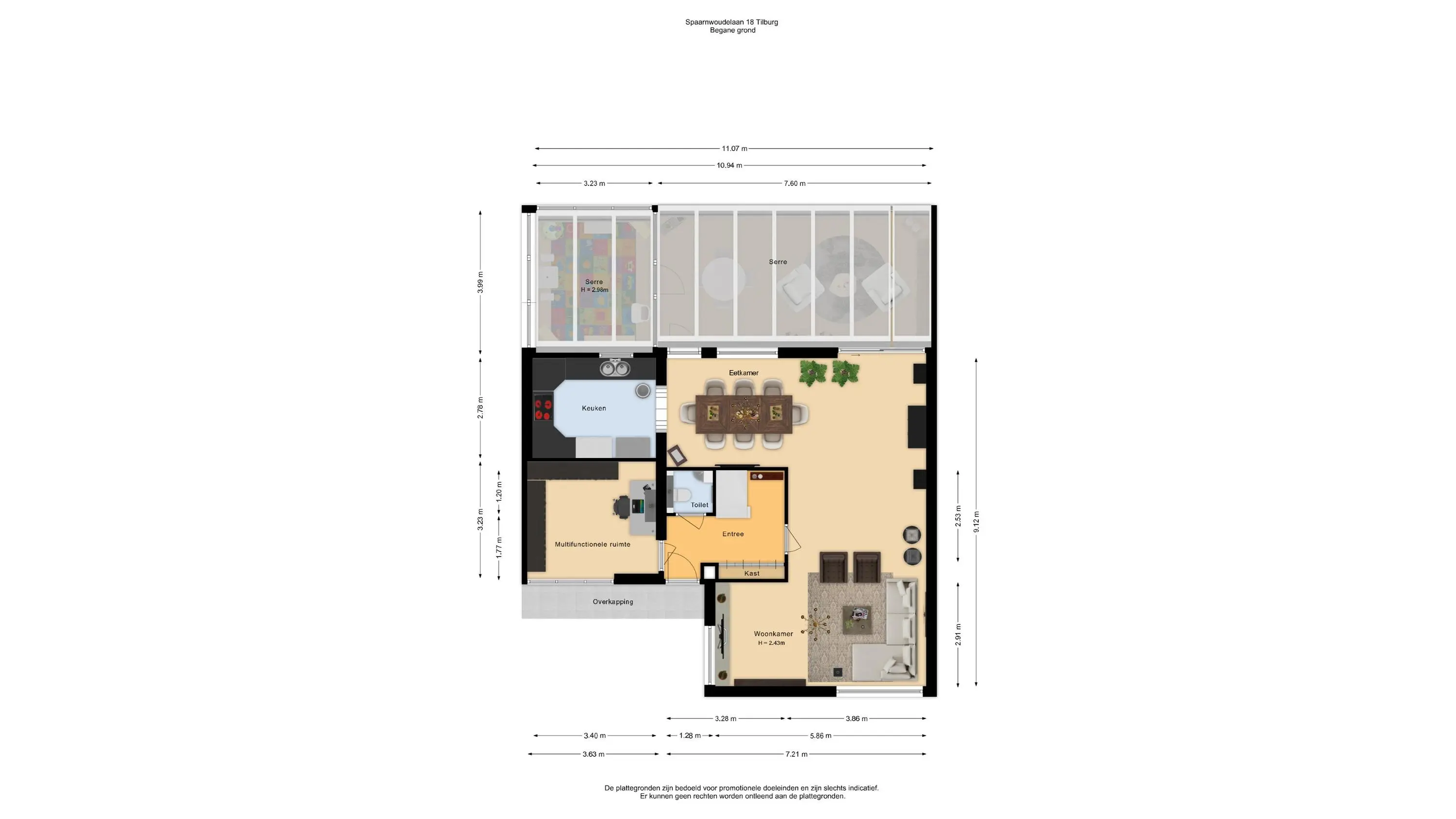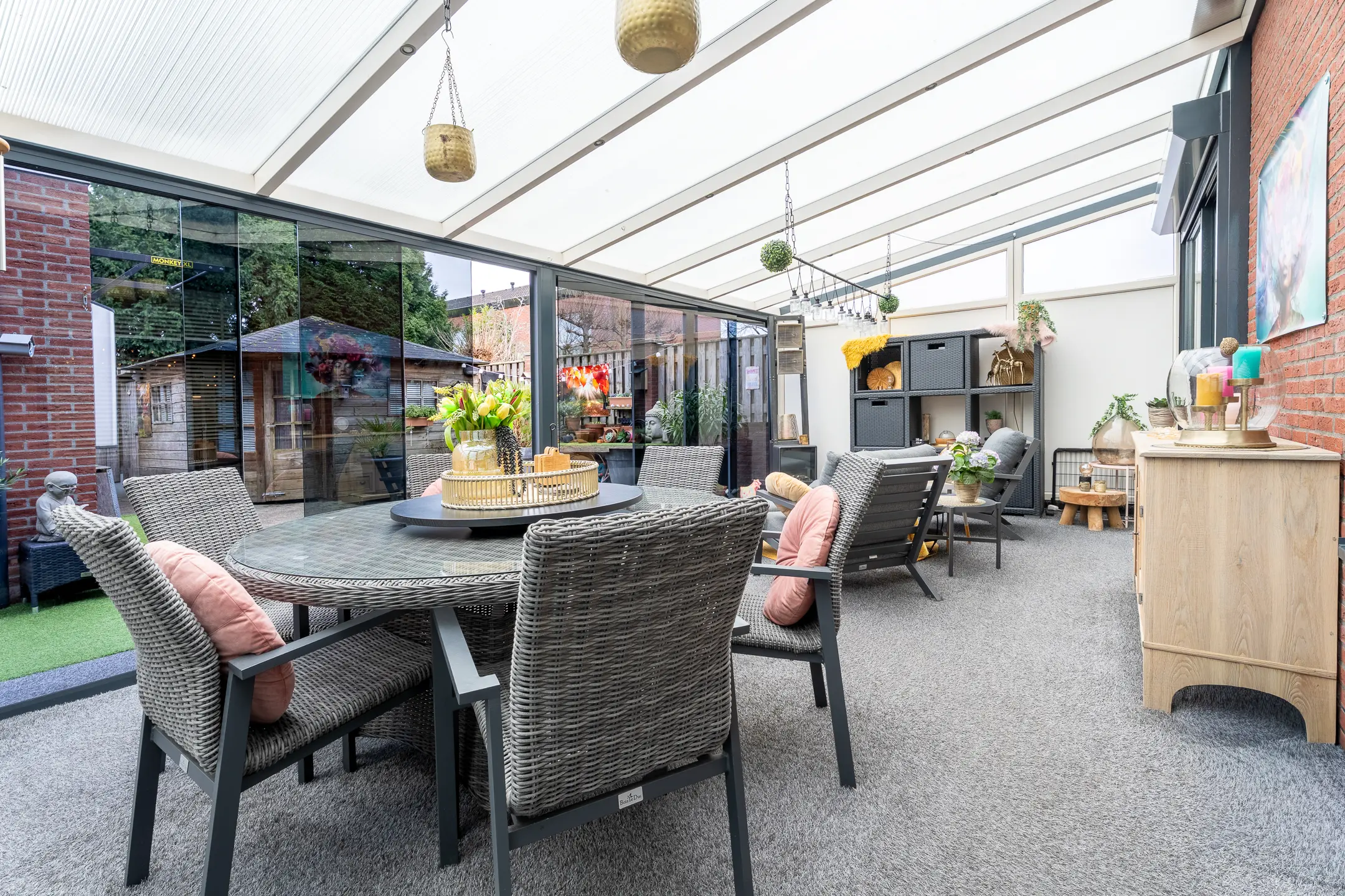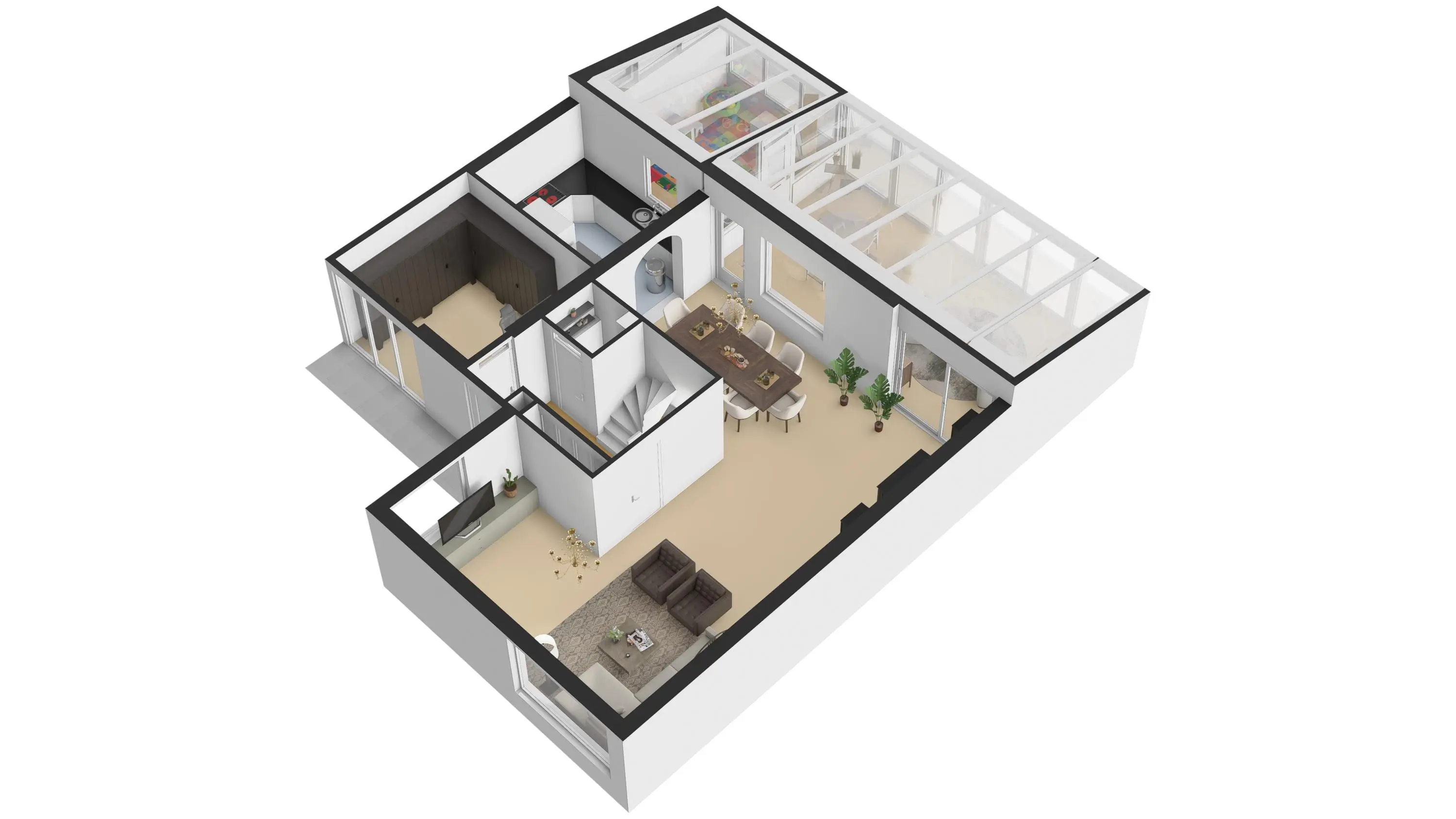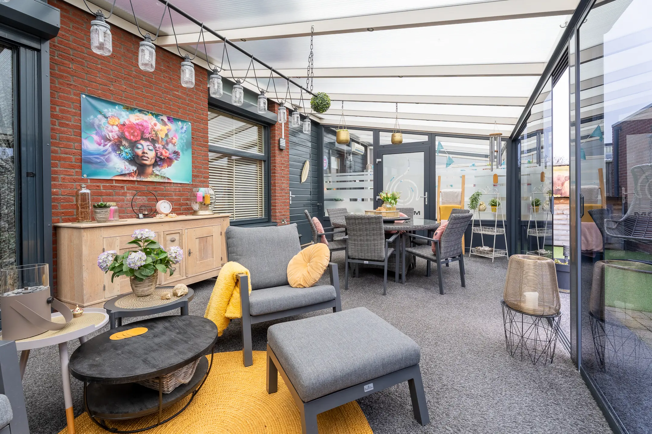 Entree, hal met meterkast, toilet, trapopgang en toegang tot de woonkamer. Van oorsprong was er een garage mogelijk, maar eigenaren hebben gekozen deze te splitsen in een werkruimte (aan de voorzijde van de woning) en een keuken (aan de achterzijde van de woning). Hierdoor is een magnifieke woonkamer ontstaan van 50m², een keuken van ruim 9m² en tel je daar dan nog de serre bij op, dan heb je een leefruimte van maar liefst 103m²!!! Keurig ingericht met lichte pvc vloer en gestukadoorde wand en plafondafwerking. De keuken is in een royale hoekopstelling met volop kastruimte en inbouwapparatuur; vaatwasmachine, keramisch koken, combi-oven, ingebouwde koffiemachine en vrijstaande Amerikaanse koel- vriescombinatie. Aansluitend de serre van aluminium en kunststof met glazen schuifpanelen en opgedeeld in twee ruimtes. De serre is aan de buitenzijde voorzien van screens. De kleine ruimte, voorzien van plissé raambekleding tegen het dak, kun je verwarmen en koelen met de airco-unit en de grote ruimte kun je middels de schuifpanelen in de zomer bij je tuin betrekken.