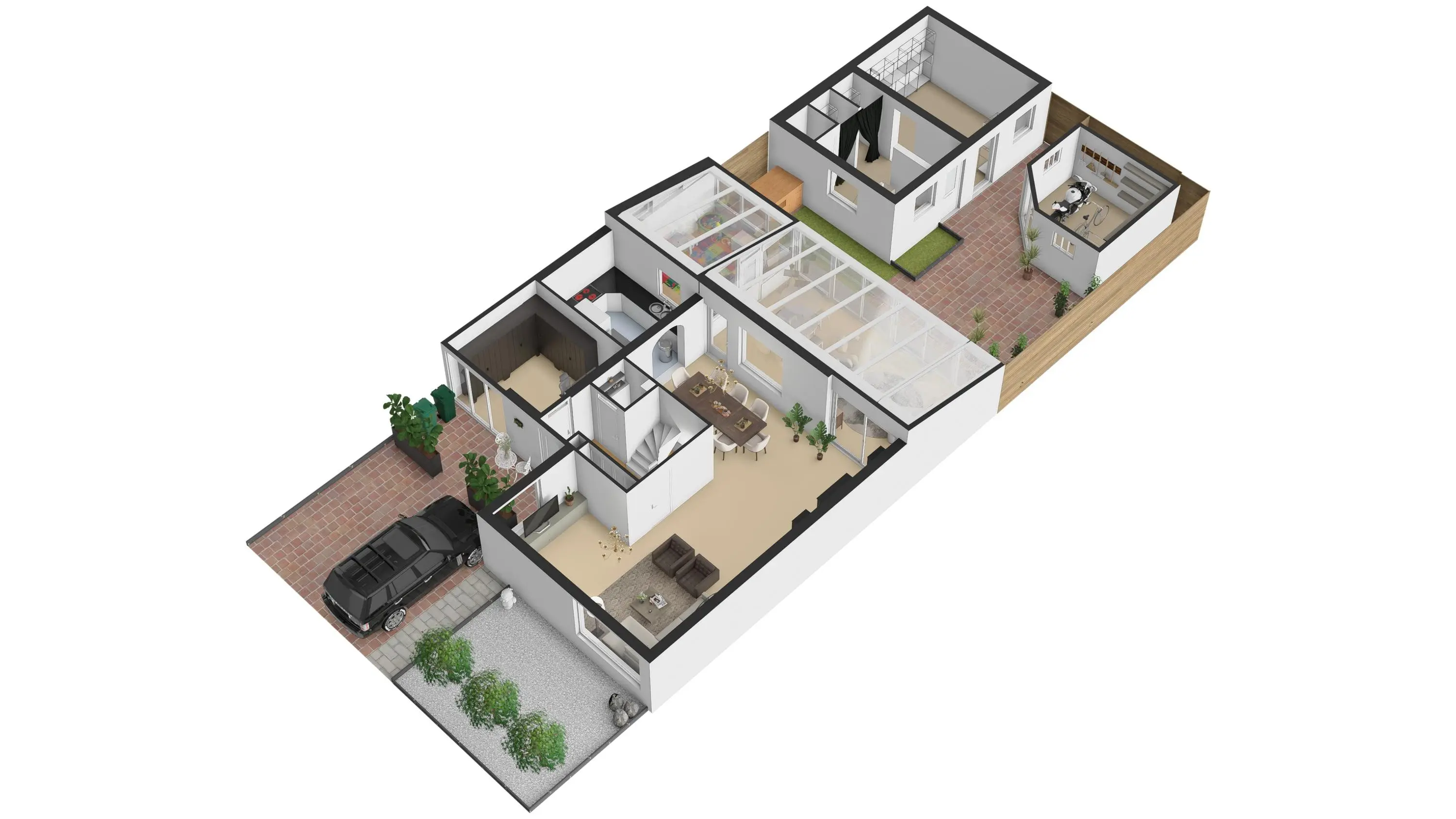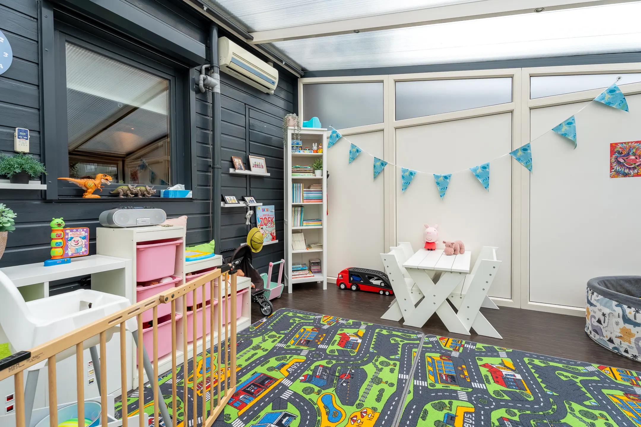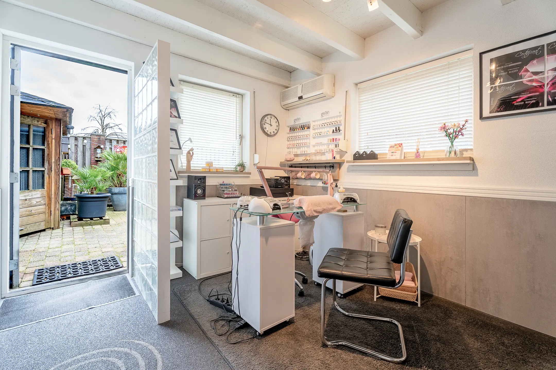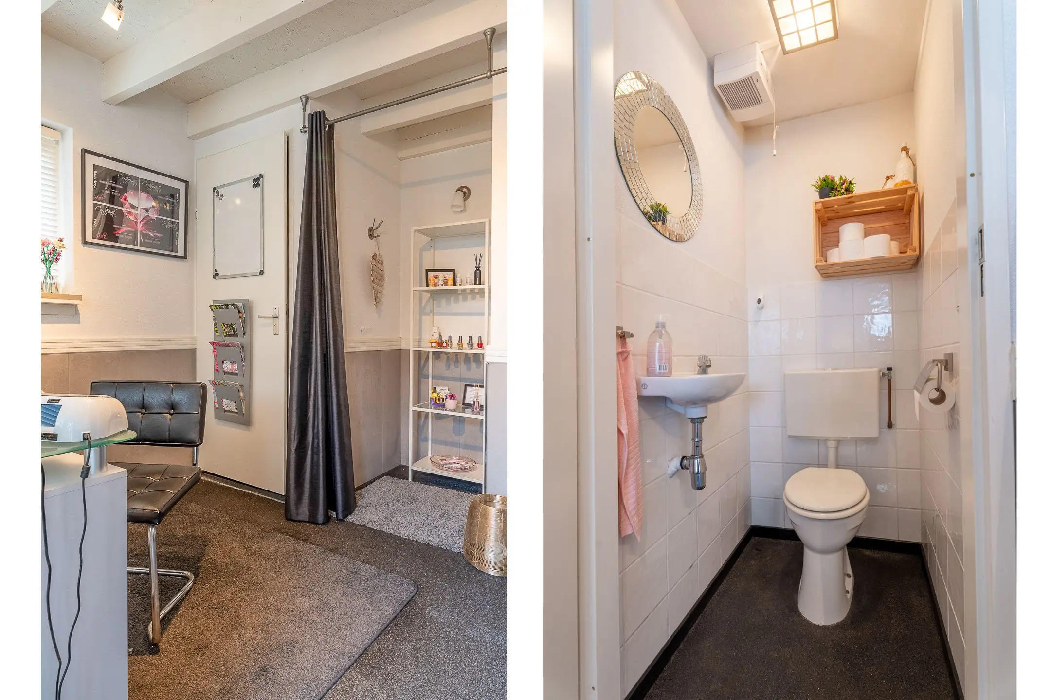 Vrijstaand stenen bijgebouw welke is opgedeeld in twee ruimtes, een eigen toilet en twee kasten. Middels de brandgang en eigen (voor)deur kun je wonen en werken (aan huis gebonden beroep) prachtig scheiden. Zo'n 30m² en voorzien van airco (verwarmen en koelen), toilet, water, stroom. Daarnaast is er ook een aansluiting voor de stadsverwarming aanwezig. Kortom, multifunctioneel!