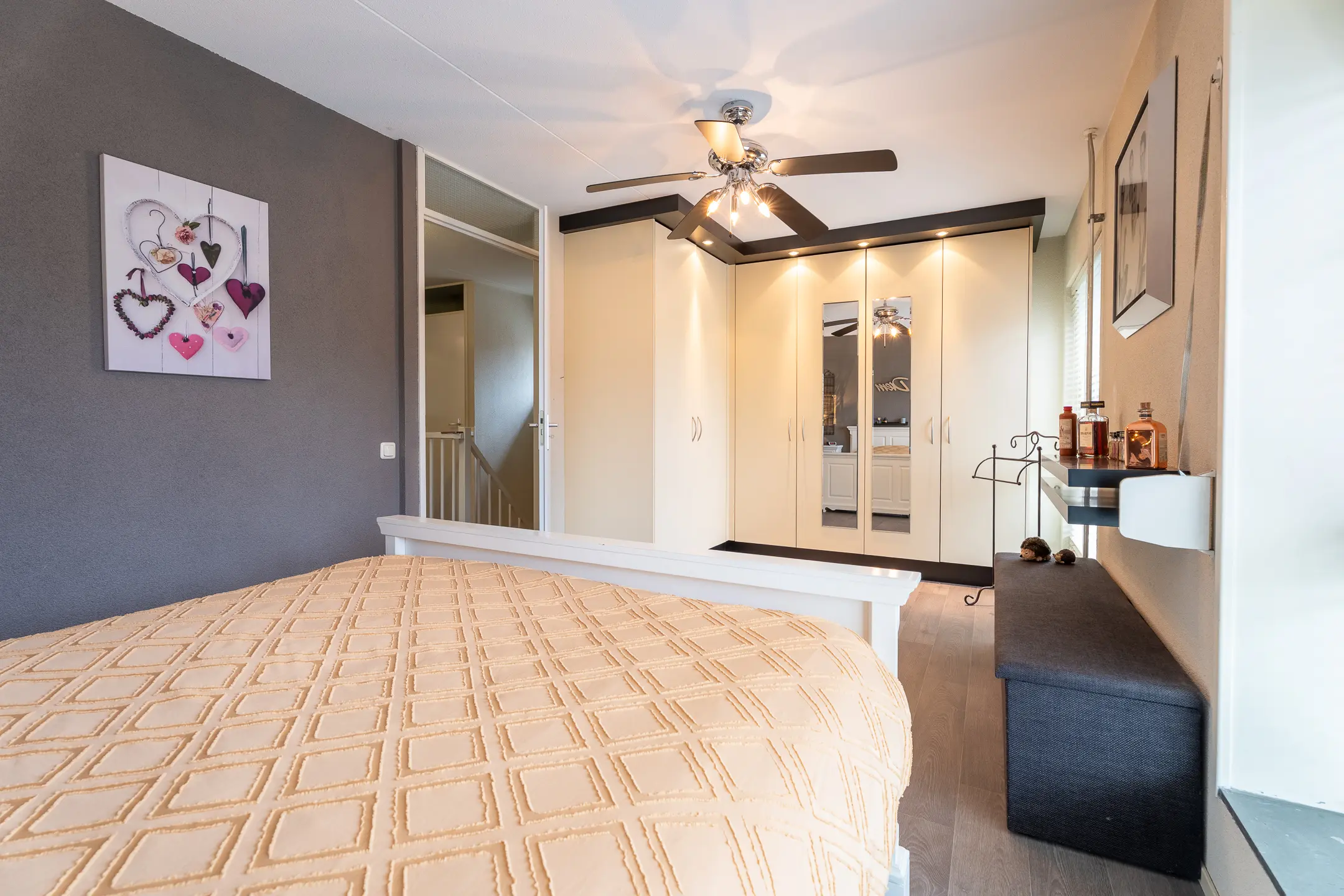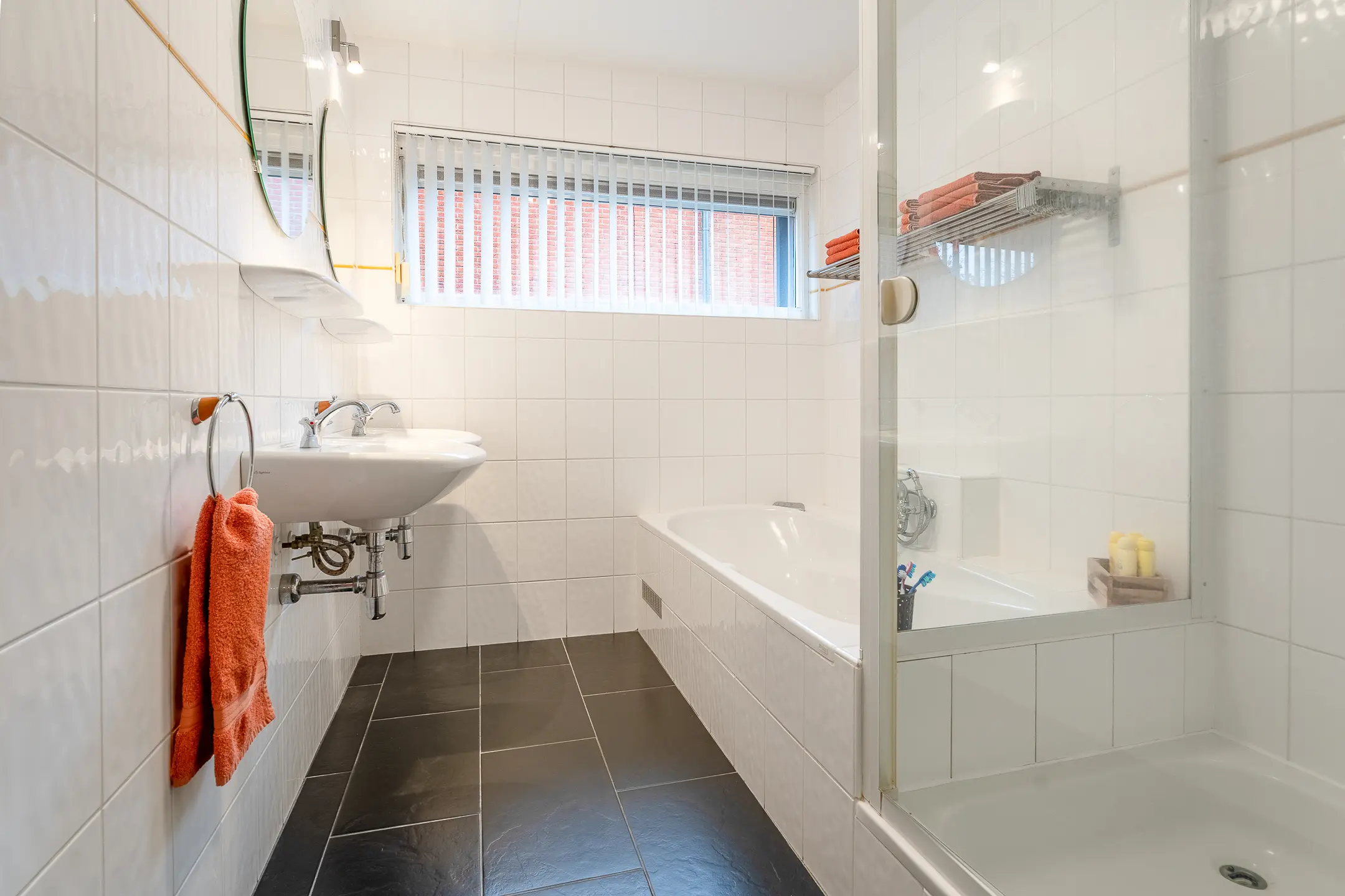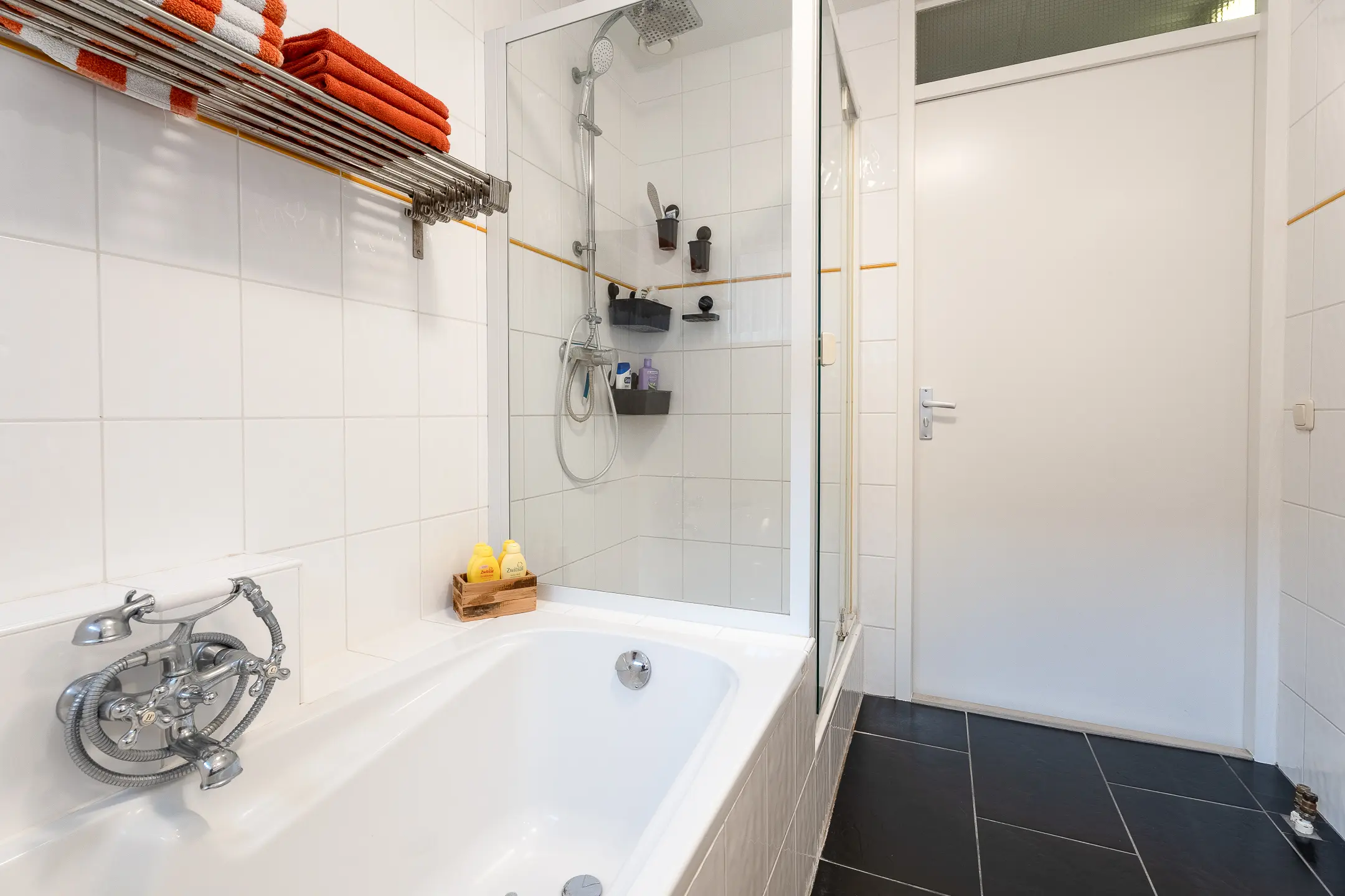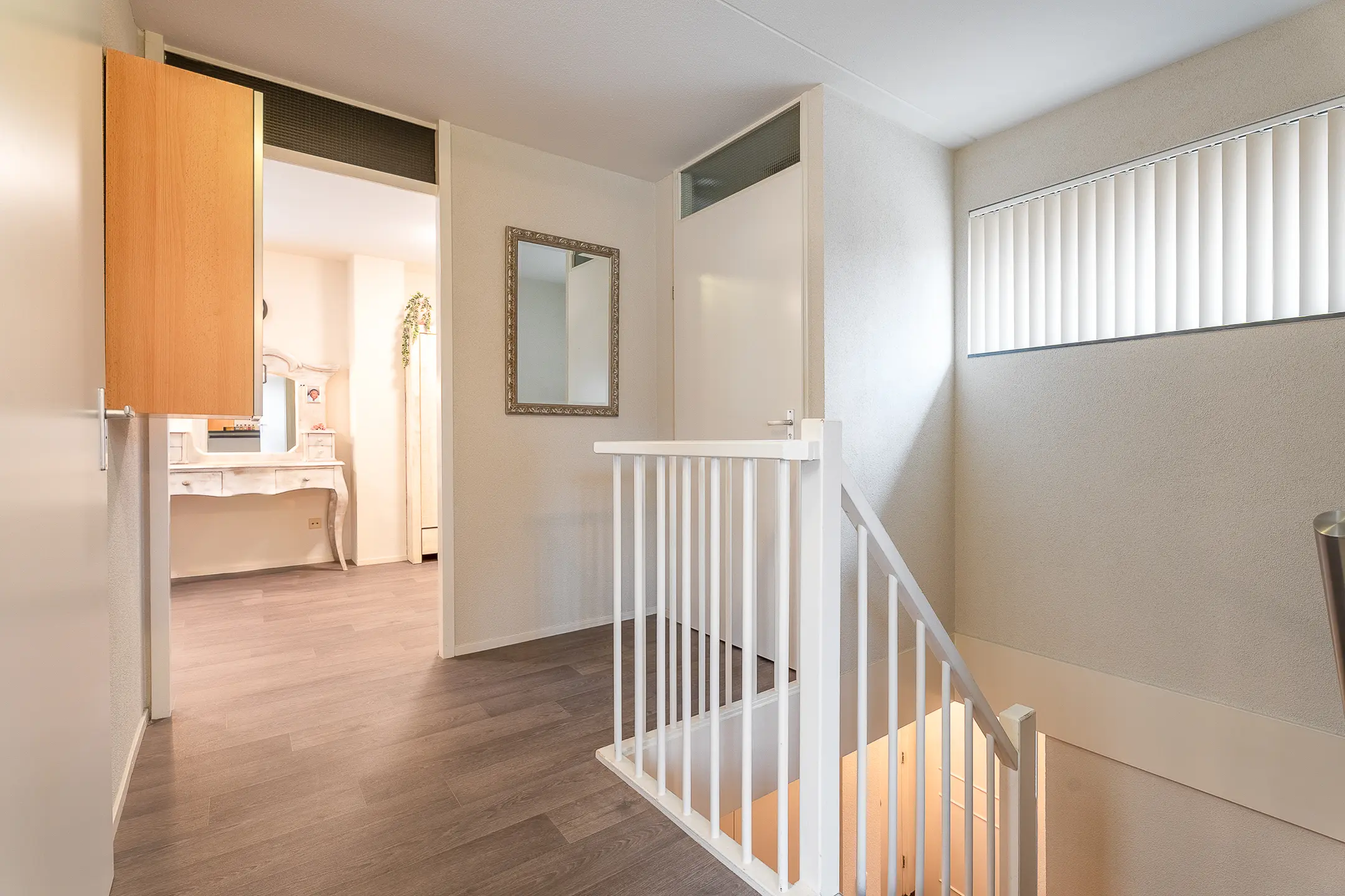 De overloop biedt toegang tot twee ruime slaapkamers, de badkamer en de trapopgang naar de 2e verdieping. De grootste slaapkamer is gelegen aan de achterzijde, bijna 18m² groot en voorzien van vaste kasten. Centraal in het midden zijn de badkamer, de overloop, het toilet en de trapopgang gelegen. De 2e slaapkamer is aan de voorzijde en doet niet onder voor de grootste met zijn 17m². De gehele verdieping is voorzien van een lichte vinyl vloer met houtlook en geschilderde wandafwerking. De badkamer is geheel betegeld en ruim van opzet, ingericht met dubbele wastafel, ligbad en douchecabine.
