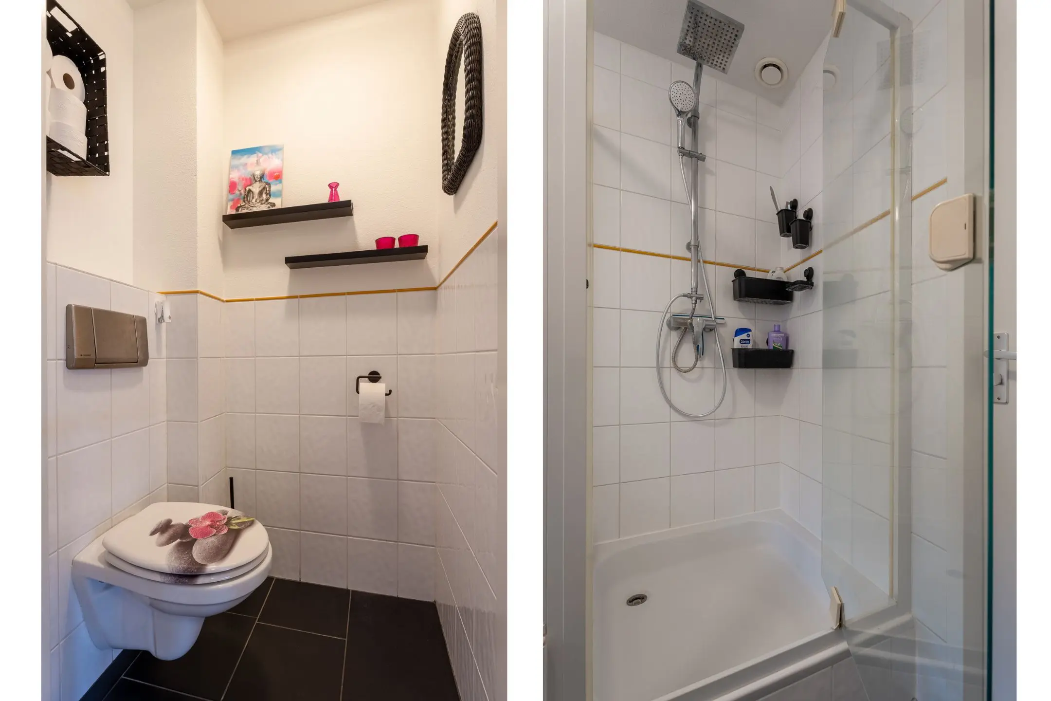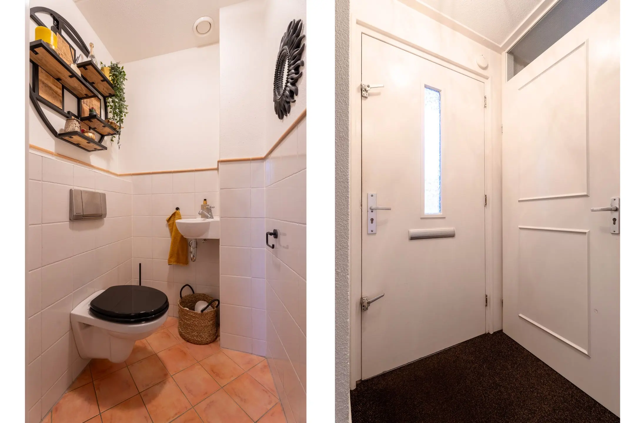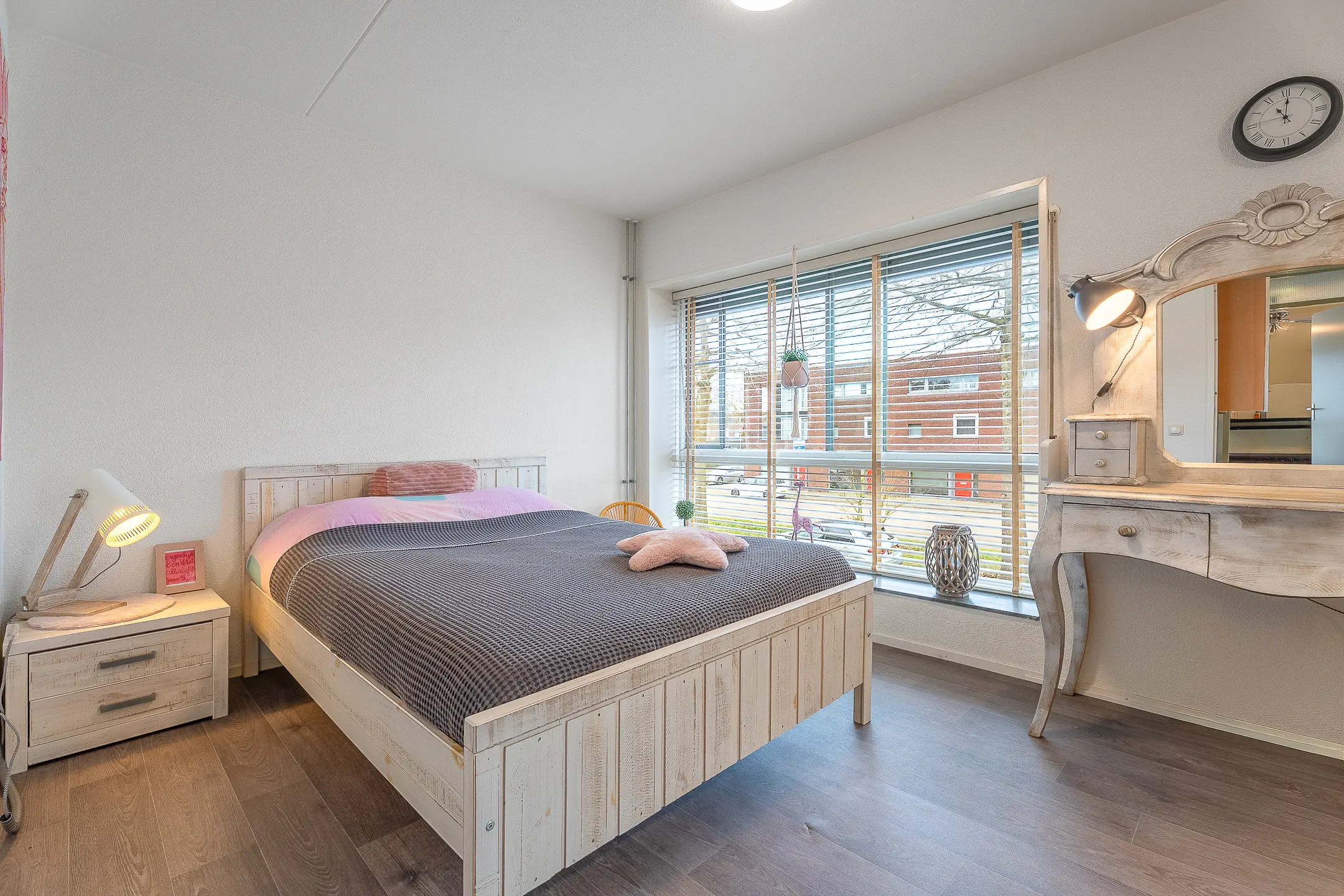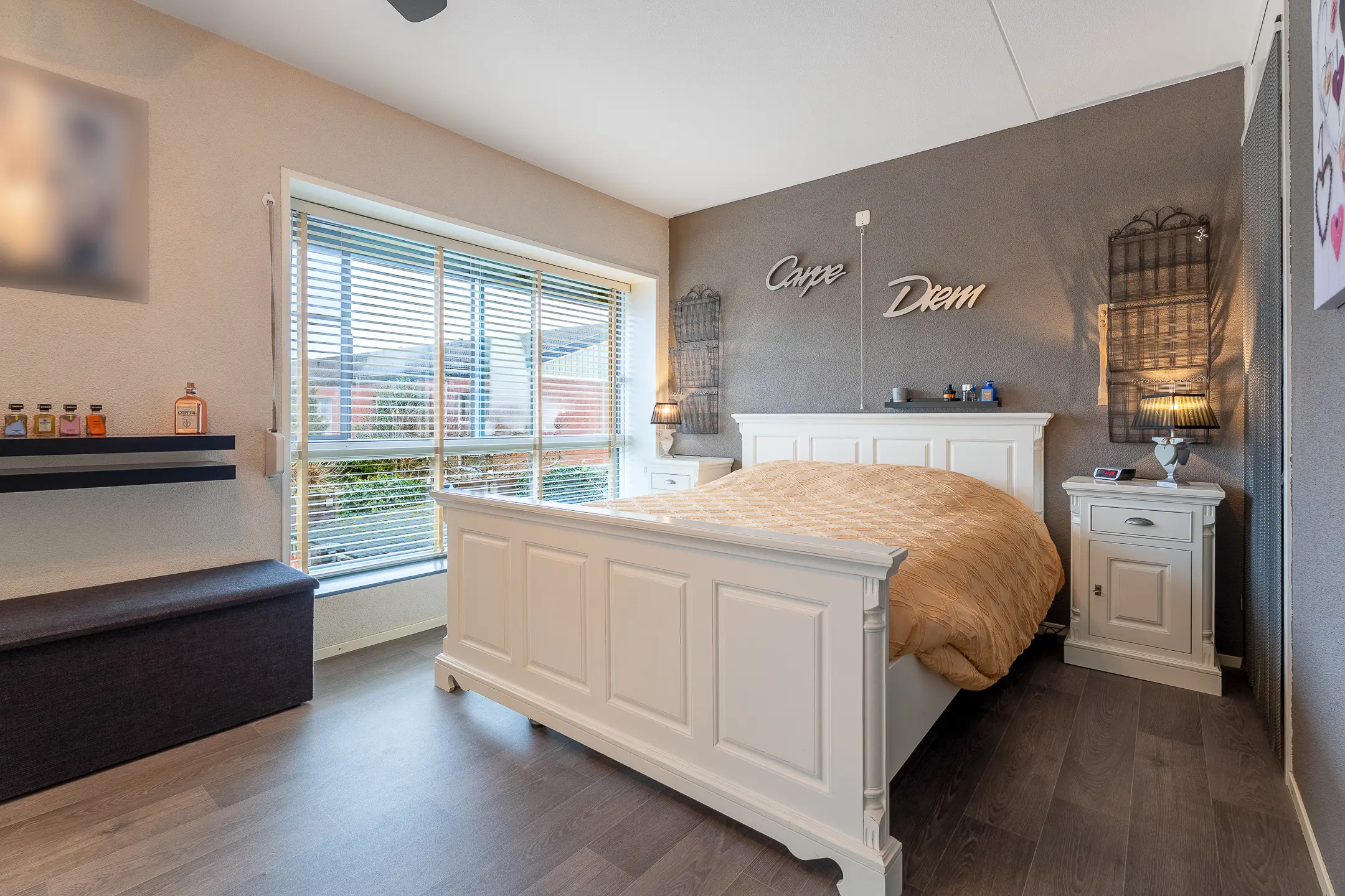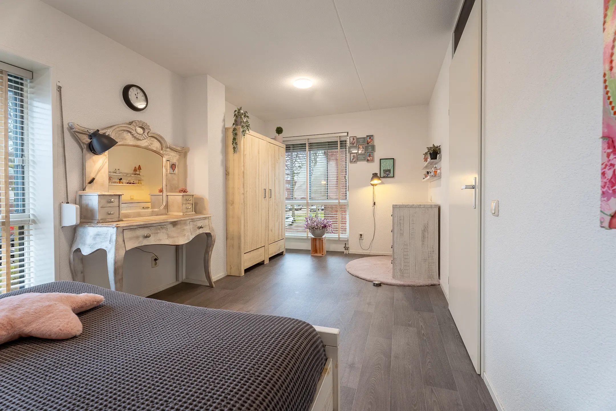 De overloop biedt toegang tot twee ruime slaapkamers, de badkamer en de trapopgang naar de 2e verdieping. De grootste slaapkamer is gelegen aan de achterzijde, bijna 18m² groot en voorzien van vaste kasten. Centraal in het midden zijn de badkamer, de overloop, het toilet en de trapopgang gelegen. De 2e slaapkamer is aan de voorzijde en doet niet onder voor de grootste met zijn 17m². De gehele verdieping is voorzien van een lichte vinyl vloer met houtlook en geschilderde wandafwerking. De badkamer is geheel betegeld en ruim van opzet, ingericht met dubbele wastafel, ligbad en douchecabine.