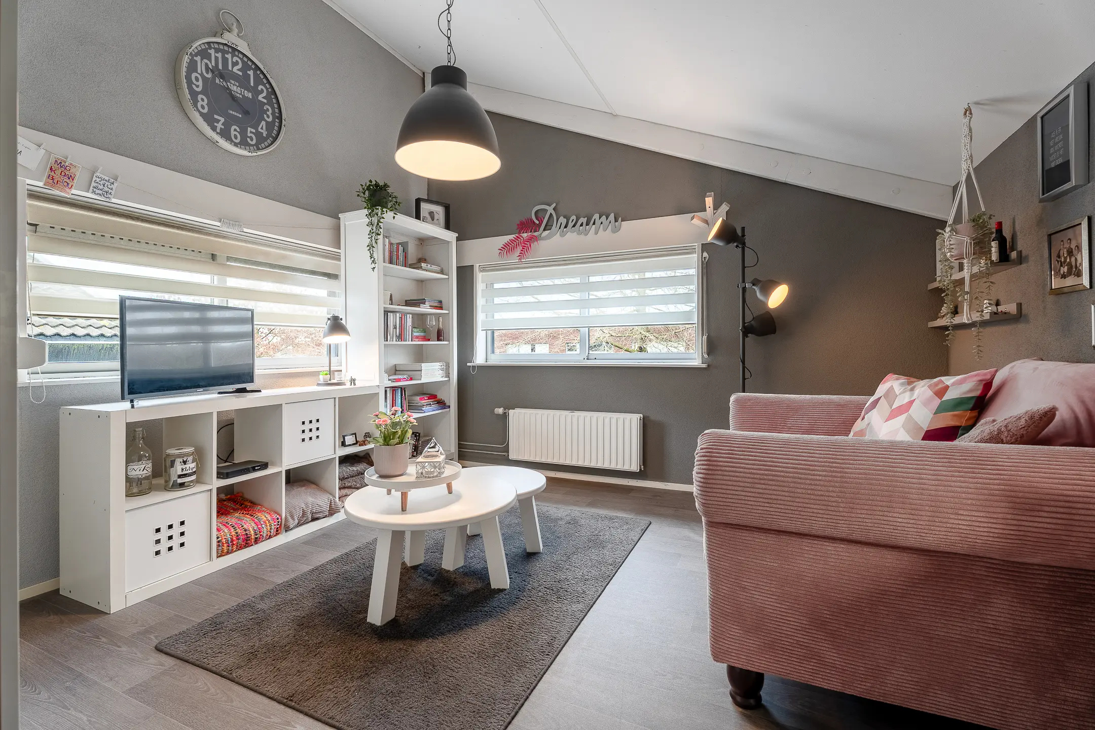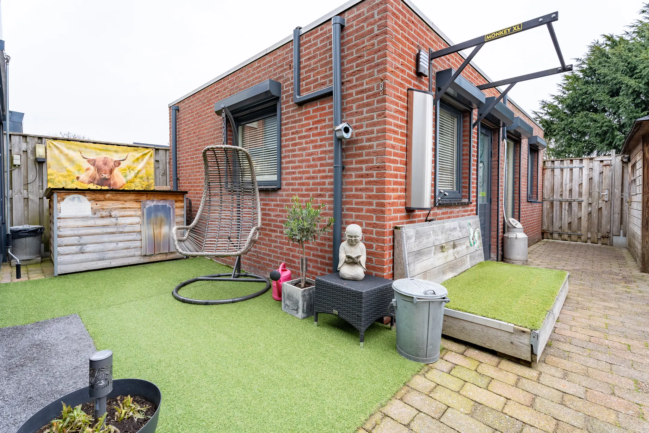 De achtertuin is op het oosten gelegen, maar door de breedte van de tuin de gehele dag zonnig. Volledig omheind en onderhoud(s) vriendelijk met kunstgras en bestrating. Middels de brandgang is er een achterom aanwezig. Het houten tuinhuis biedt je volop ruimte voor tuingereedschap en stalling van fiets, fatbike of scooter.