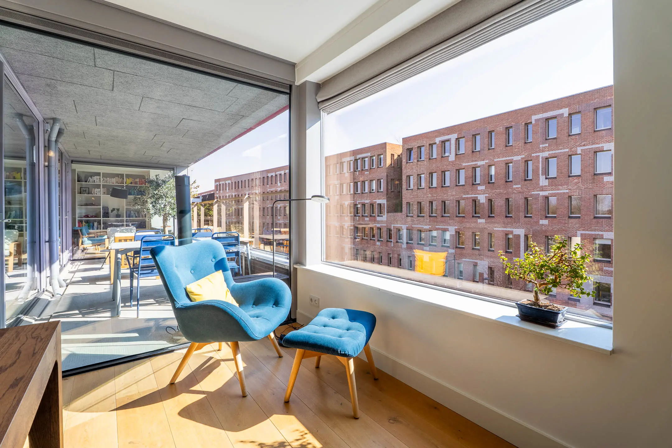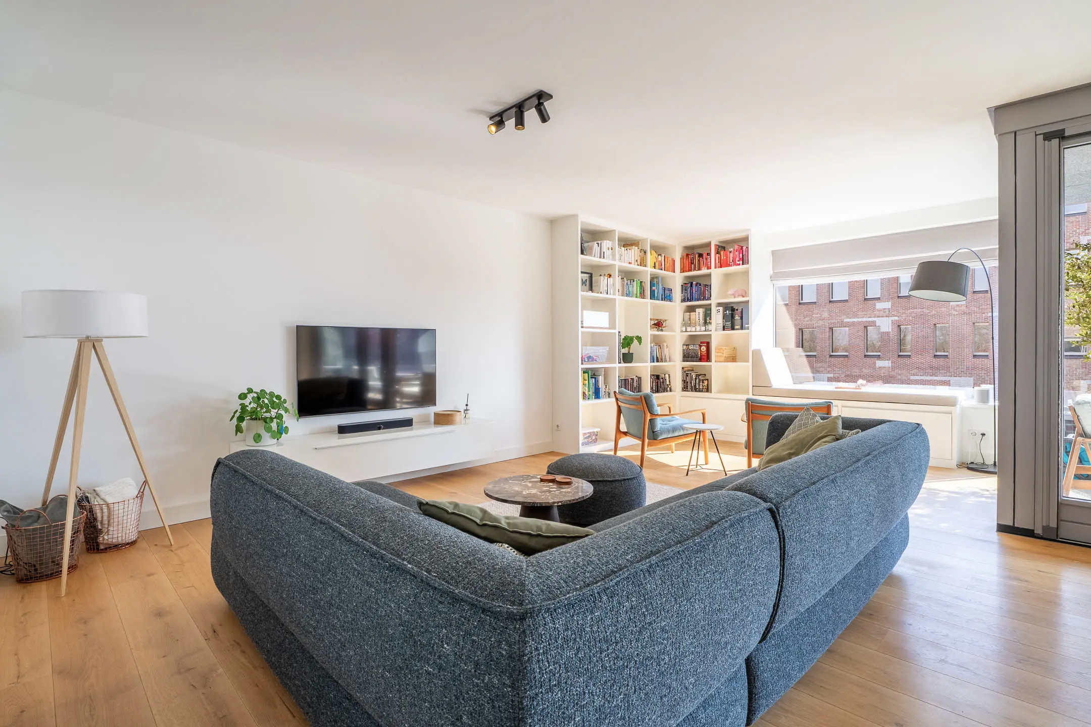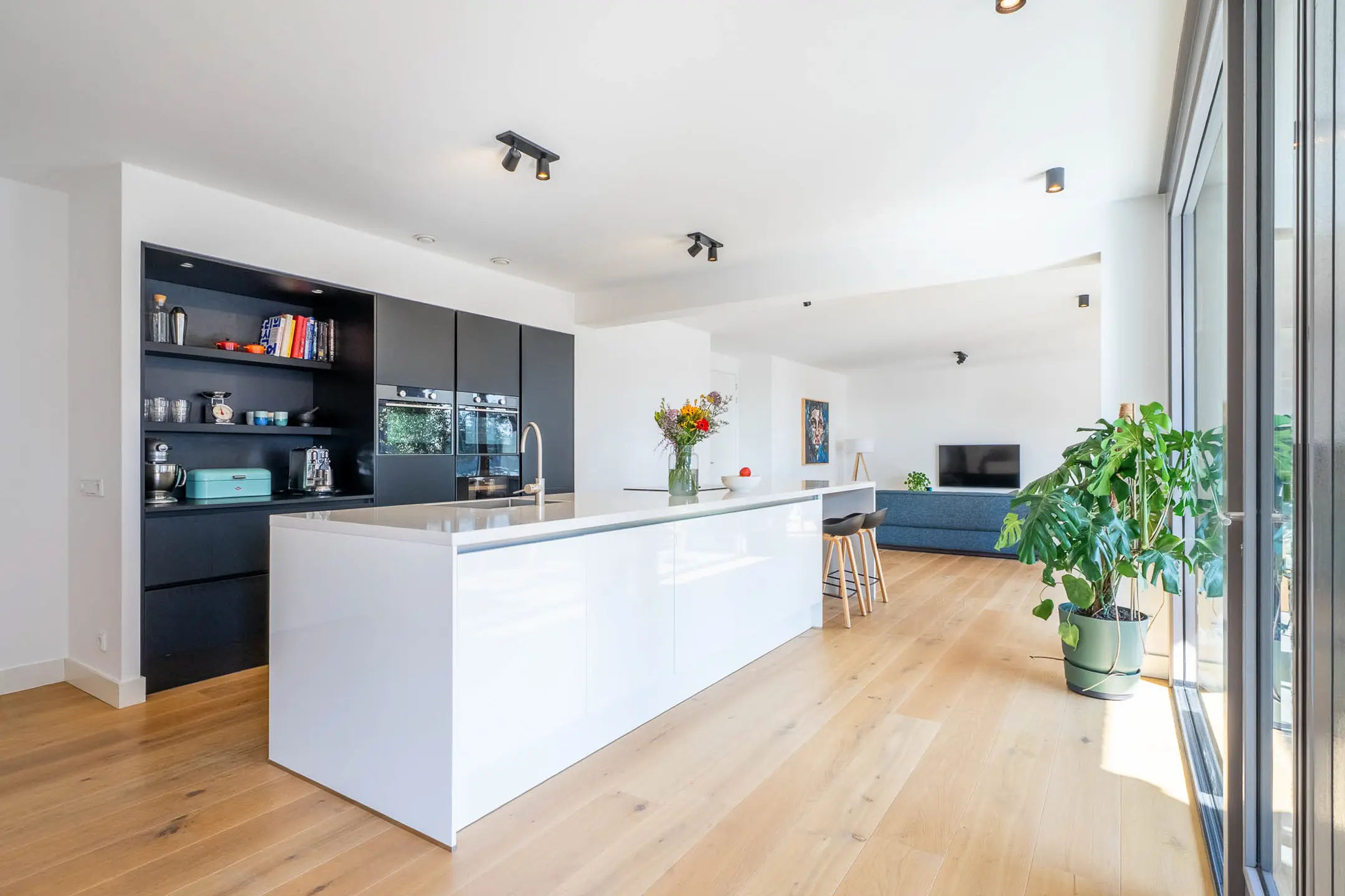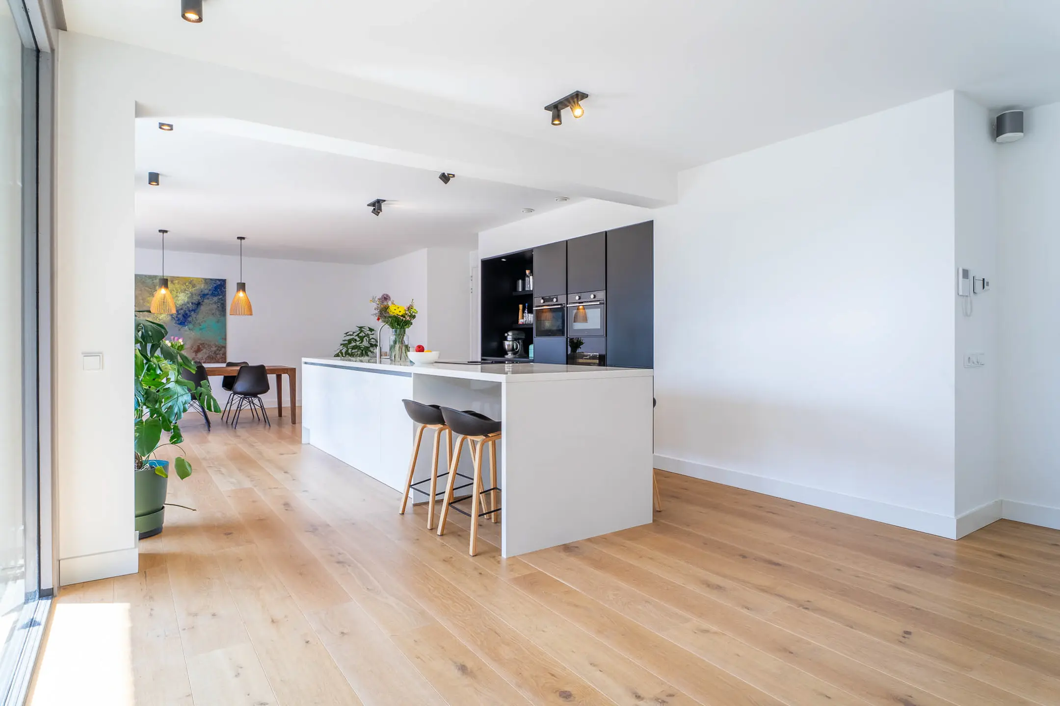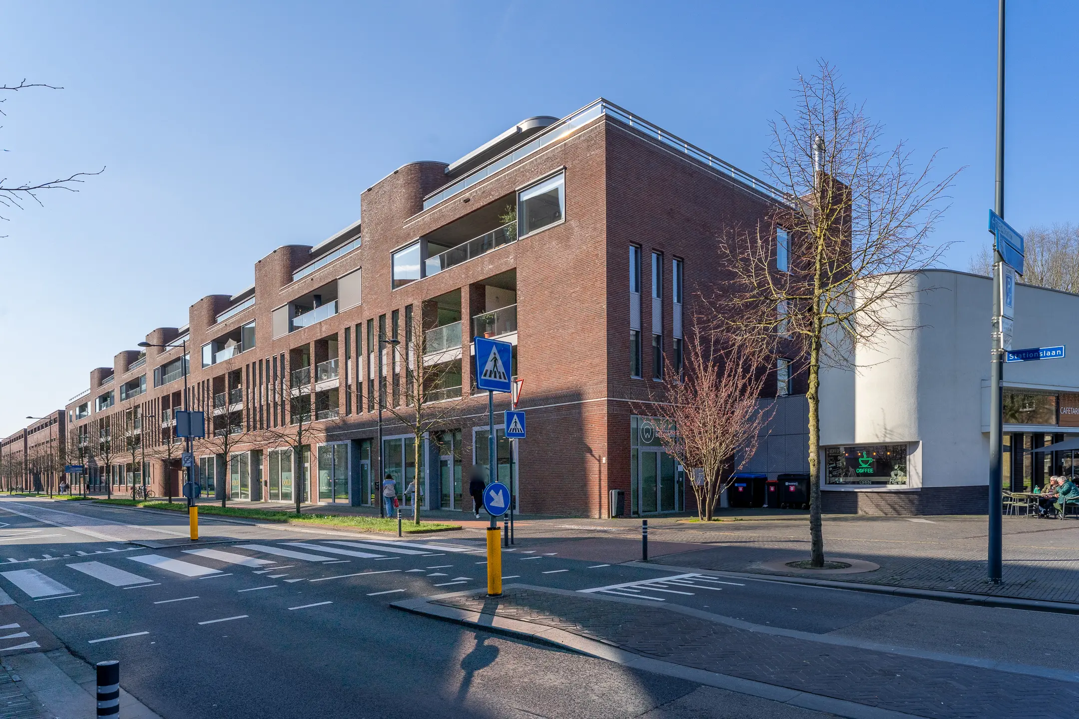 Bij binnenkomst in de woonkamer valt direct de riante en lichte leefruimte op. De royale woonkamer biedt volop mogelijkheden voor een stijlvolle zithoek en een grote eetkameropstelling, ideaal voor zowel ontspanning als het ontvangen van gasten. De grote raampartijen zorgen voor een prettige lichtinval en een ruimtelijk gevoel. Een fraai detail is de brede vensterbank met uitzicht over de Stationslaan – een perfecte plek om te ontspannen en te genieten van het levendige straatbeeld.