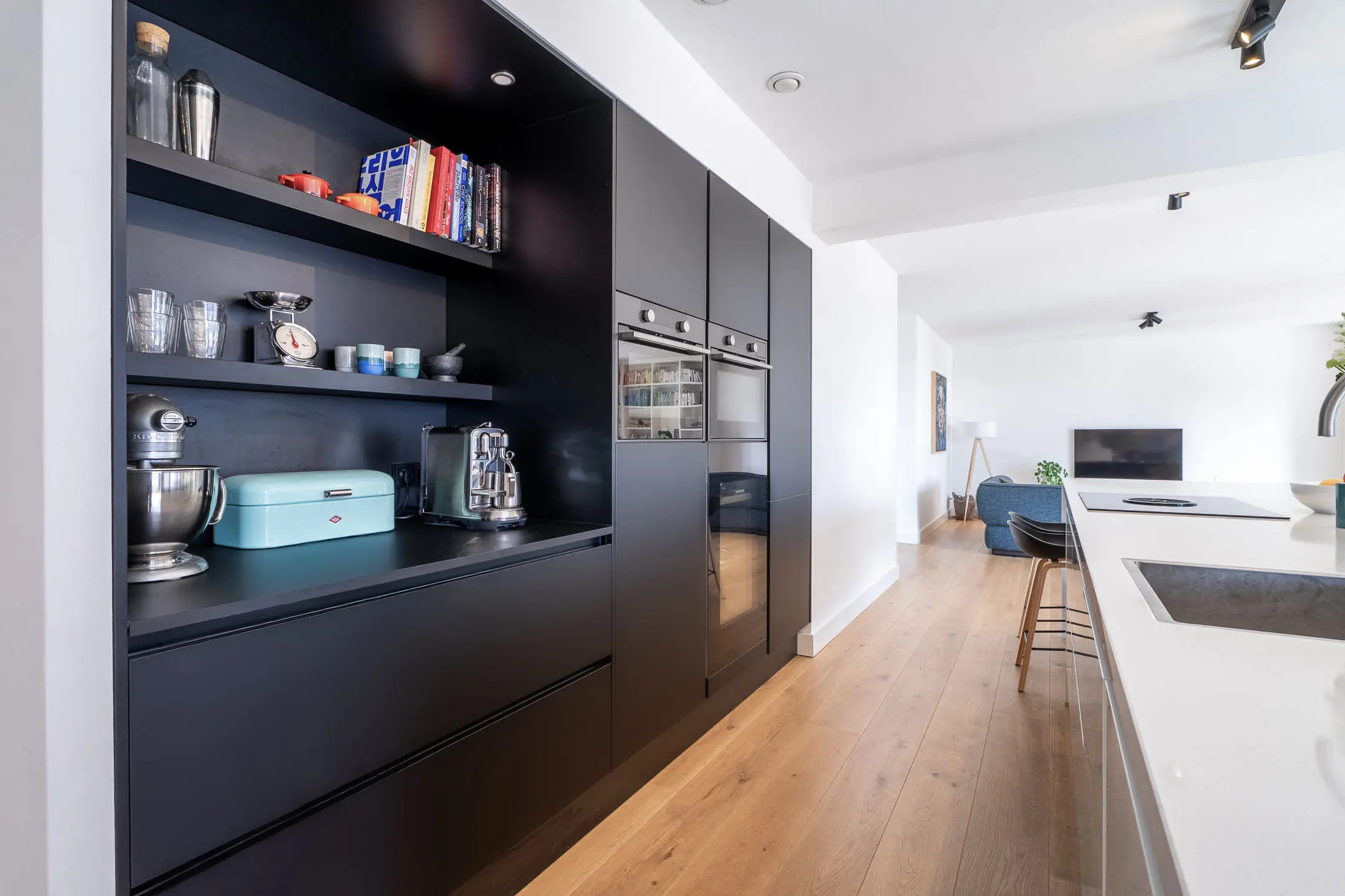 De centrale moderne keuken is uitgevoerd met hoogwaardige inbouwapparatuur en een strak design, waarmee deze naadloos aansluit bij het luxe karakter van het appartement. Een ideale plek voor de culinaire liefhebber. De keuken is voorzien van een kook- en spoeleiland met barzitje. De koffiecorner ontbreekt uiteraard ook niet alsmede een wijnkoelkast. Verder is er een koelkast, stoomoven, combioven, vaatwasser en Bora inductie kookplaat met downdraft.