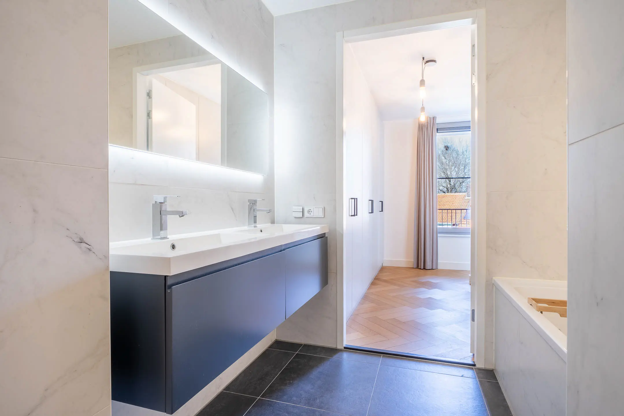 De master bedroom vormt een luxe privéverblijf en beschikt over een royale walk-through closet en een en-suite badkamer. Deze badkamer is hoogwaardig uitgevoerd en voorzien van een ligbad, dubbele wastafel en een ruime inloopdouche.