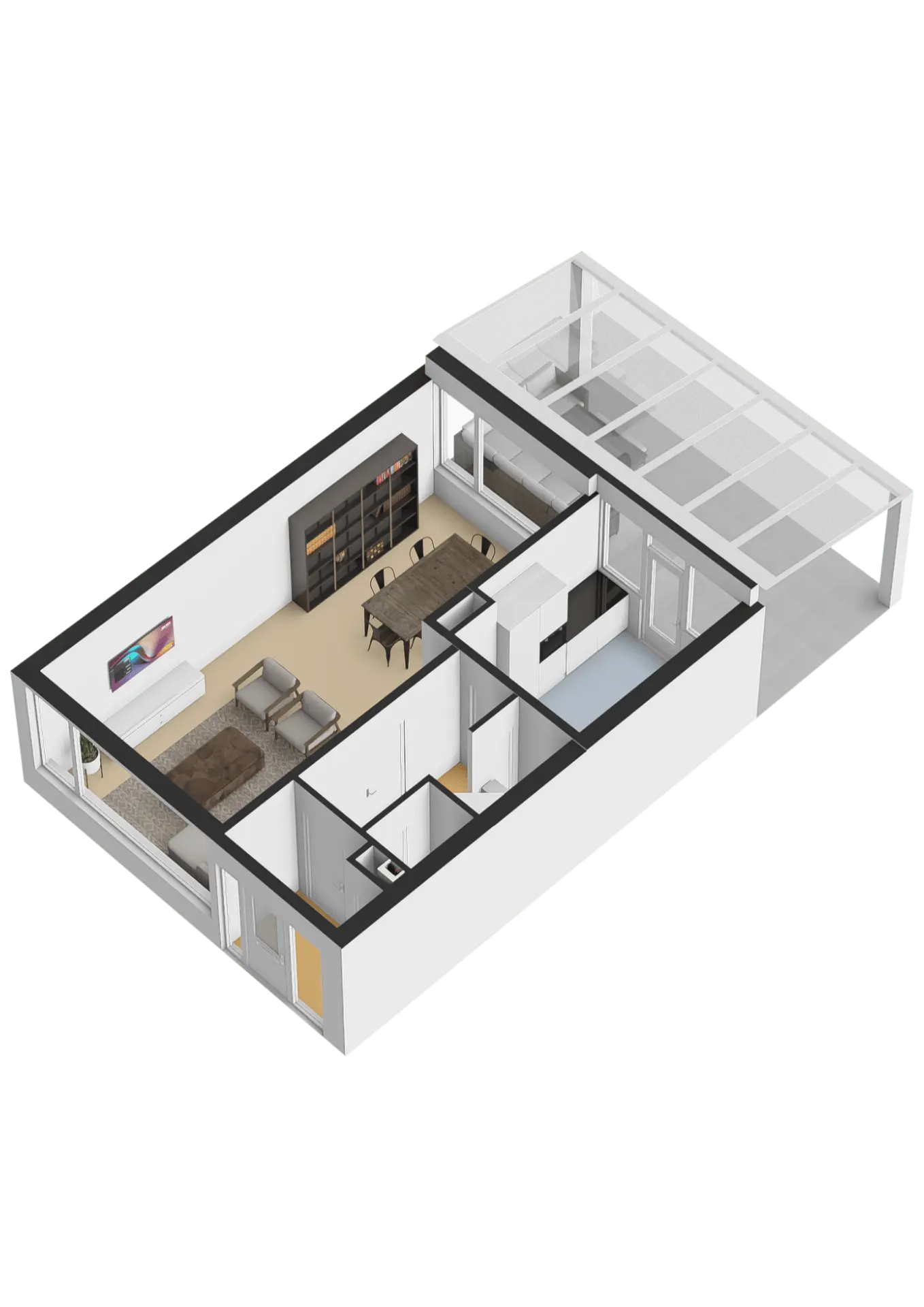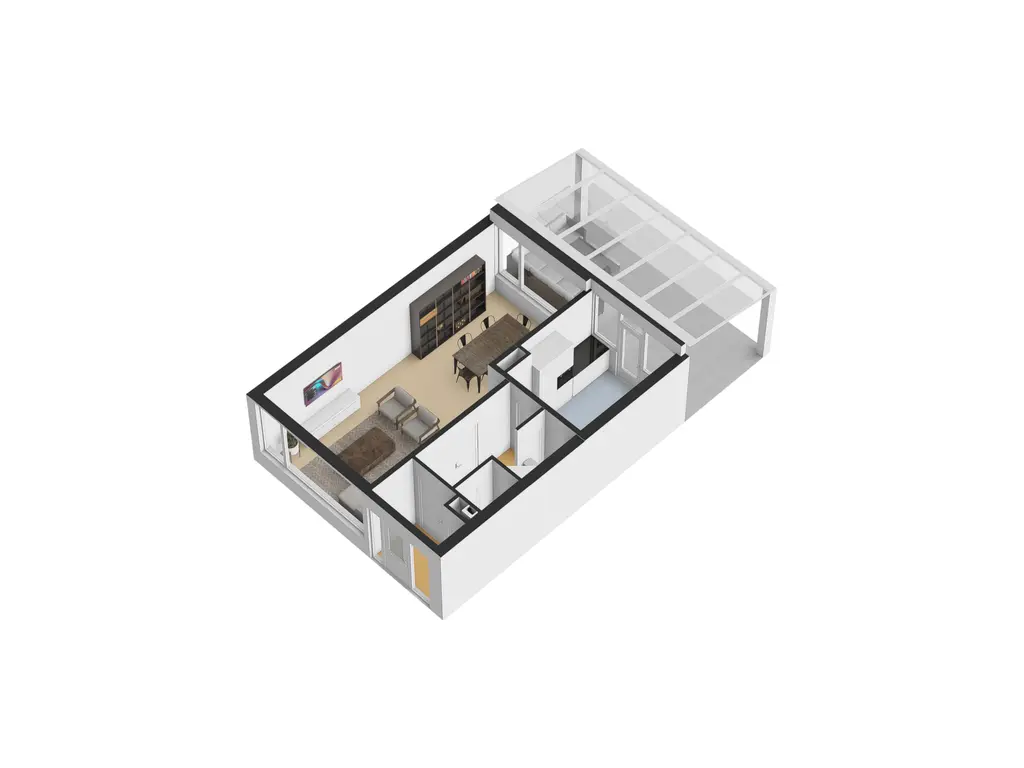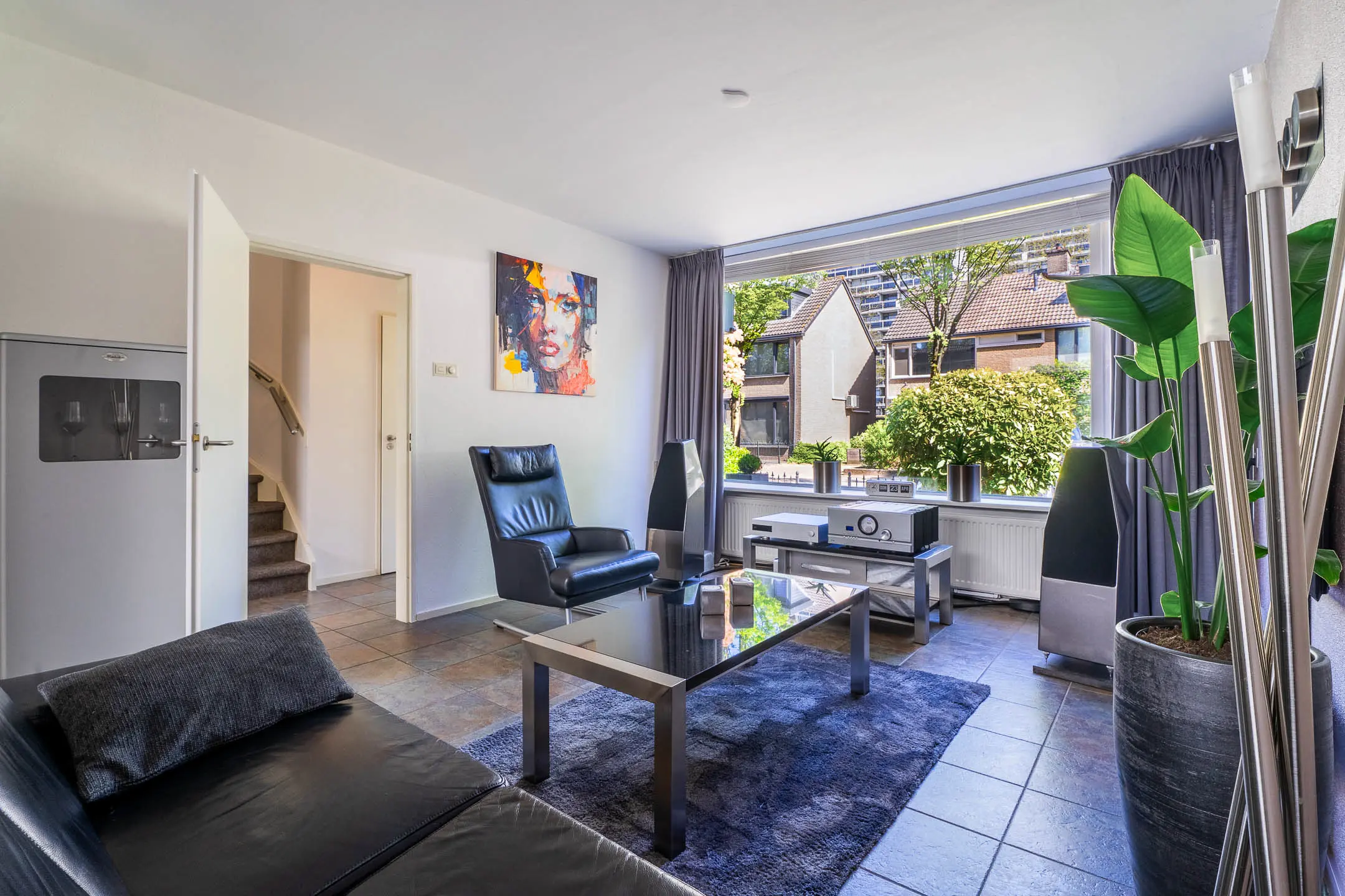 De woonkamer is voorzien van een tegelvloer met vloerverwarming en de wanden zijn afgewerkt met spachtelputz. Er is makkelijk een open verbinding met de keuken te maken via de vast inbouwkast.