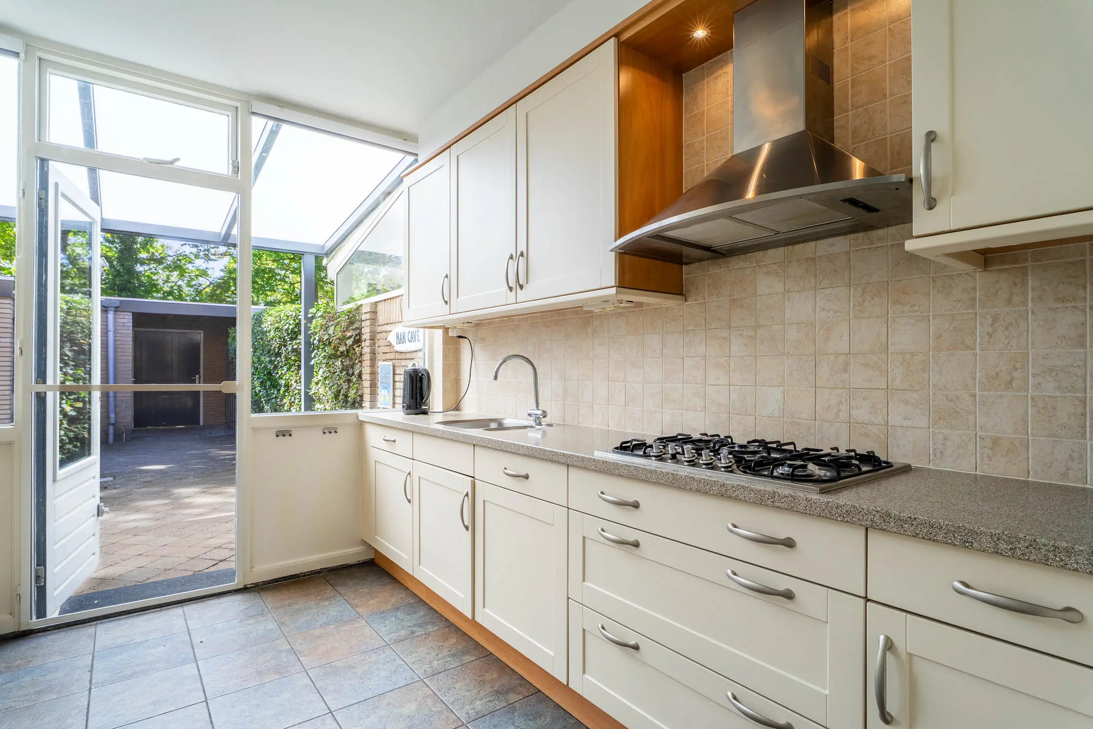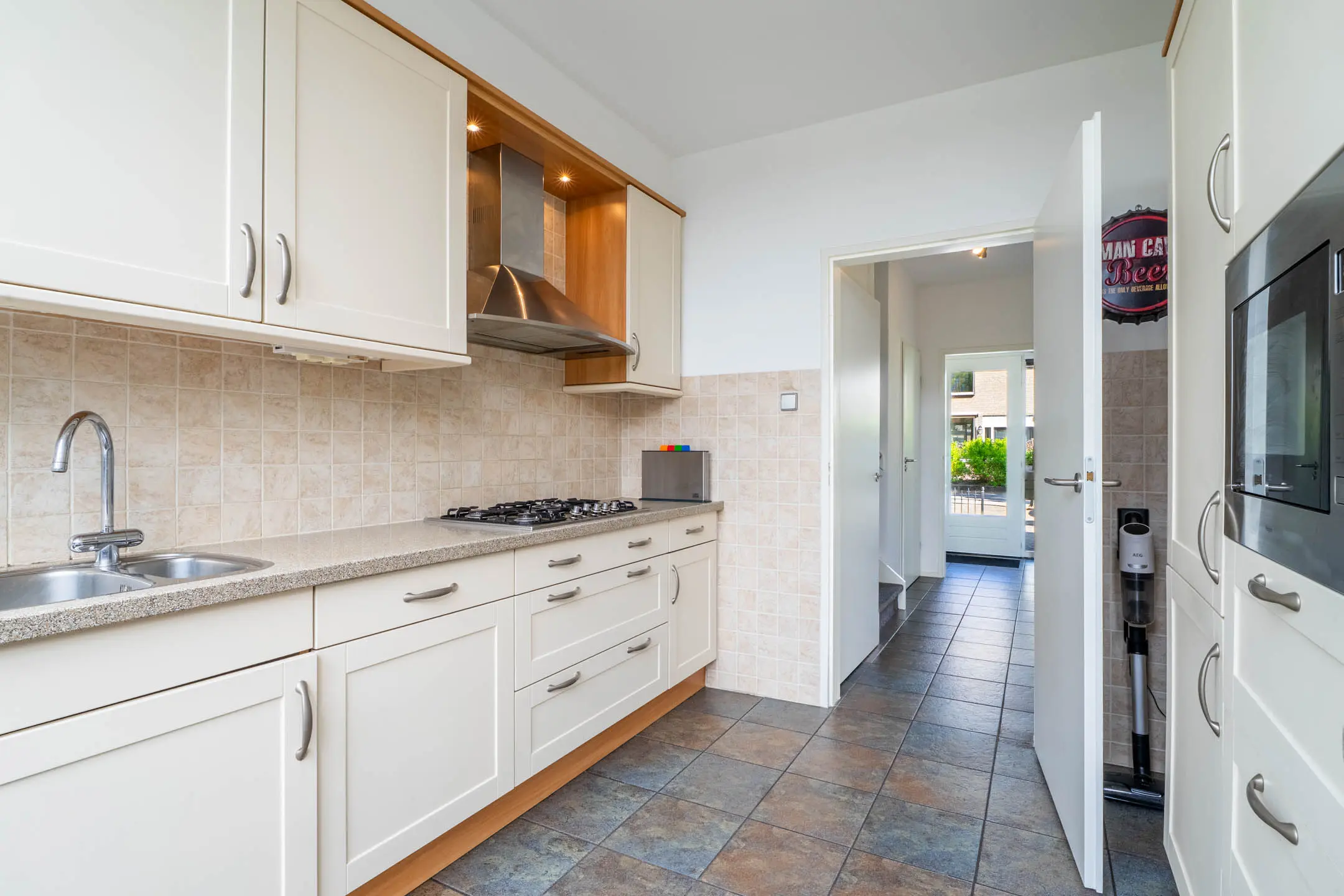 De keuken bevindt zich aan de achterzijde van de woning en is voorzien van een 5-pits gaskookplaat met afzuigkap, vaatwasser, koelkast, vriezer en combioven. Er zijn diverse onder en bovenkasten en een praktische koffiecorner. De keuken heeft een tegelvloer en via een loopdeur is de achtertuin bereikbaar.