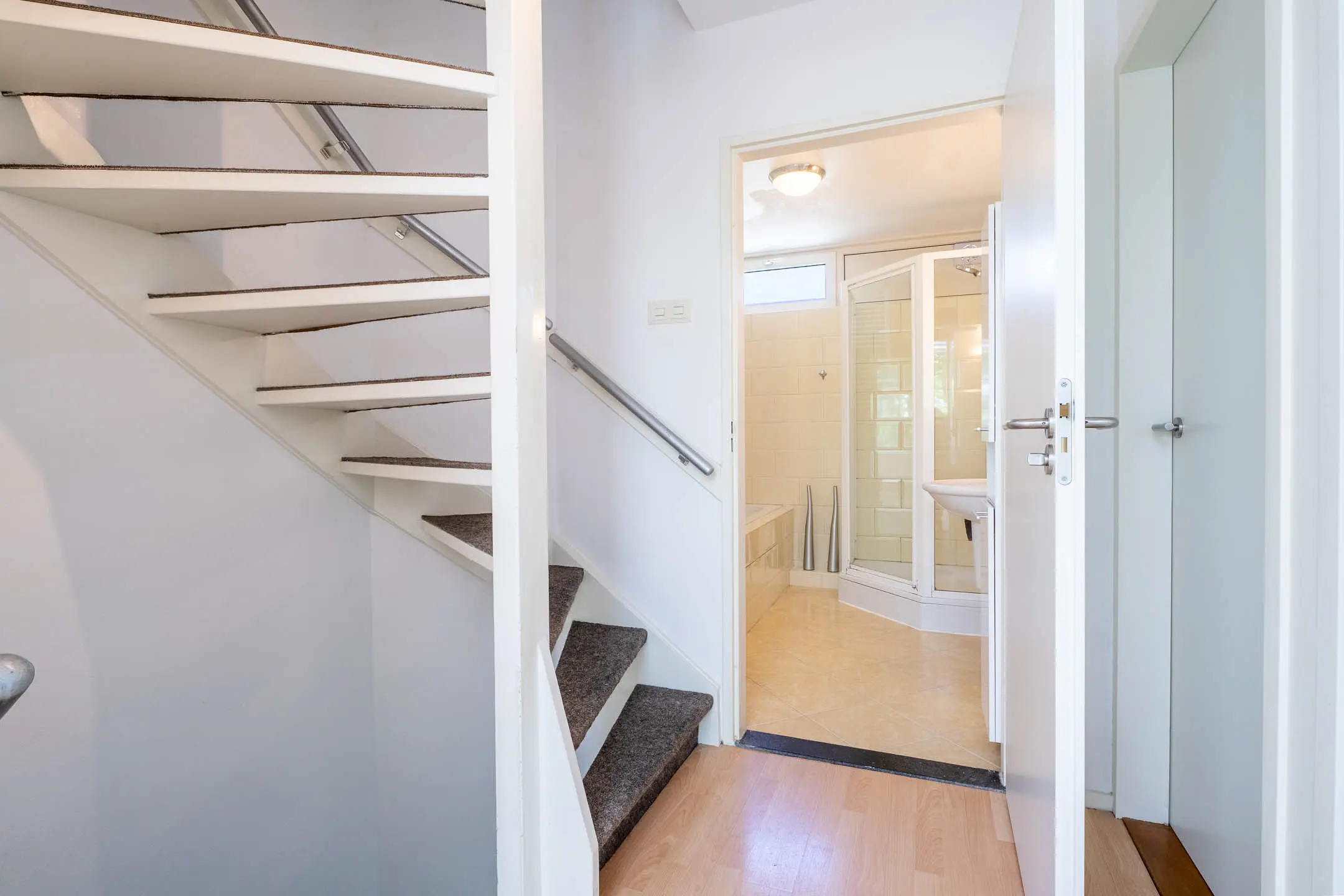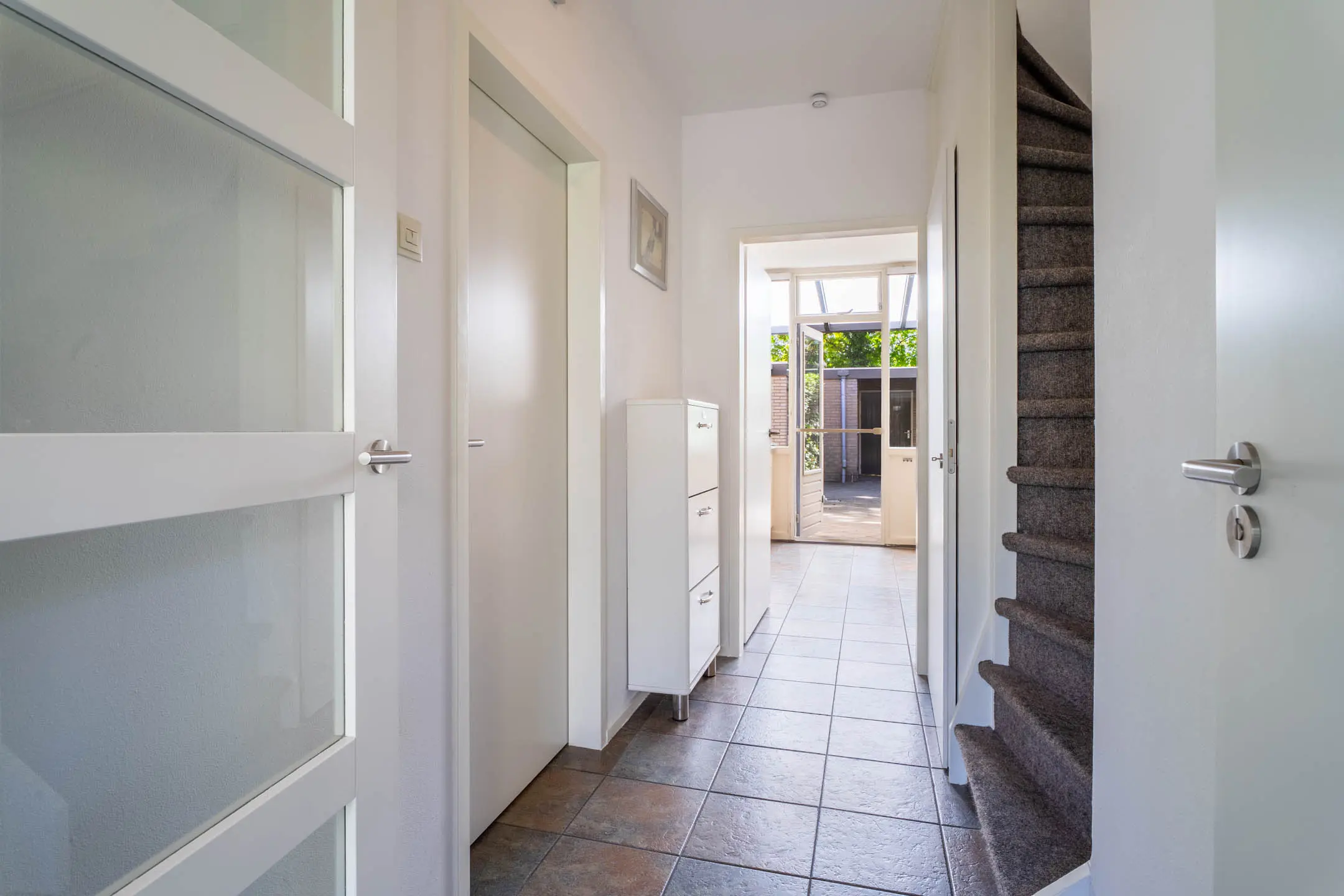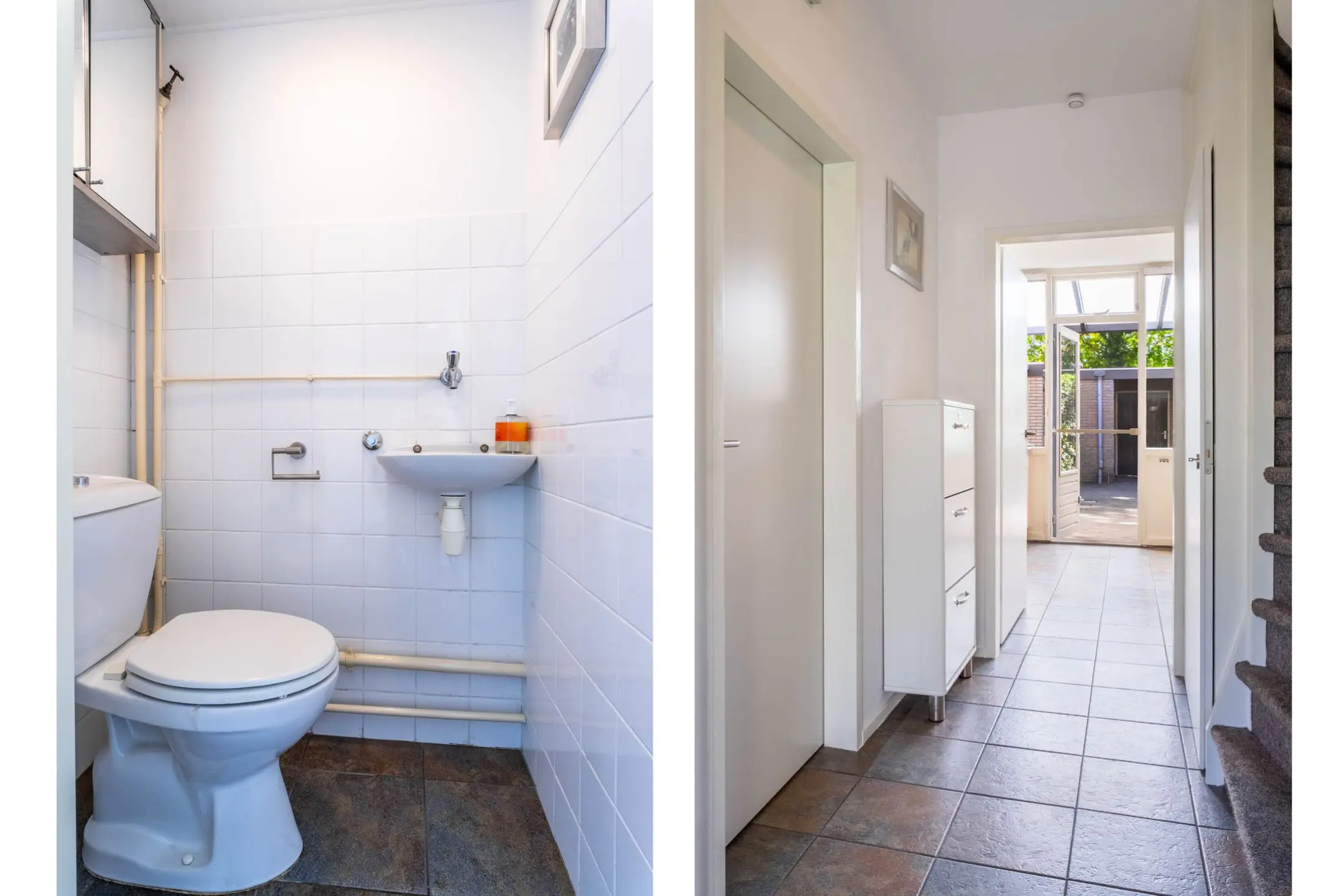 Via de entree bereik je de hal van de woning. De toiletruimte is deels betegeld en voorzien van een staand toilet met fonteintje. De vernieuwde meterkast heeft 8 groepen met aardlekschakelaars. Verder is er een praktische trapkast.