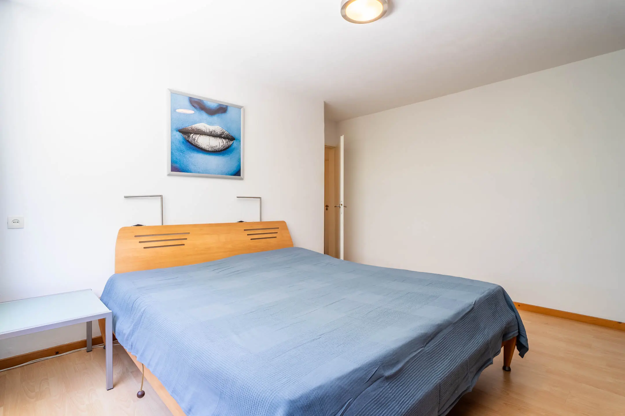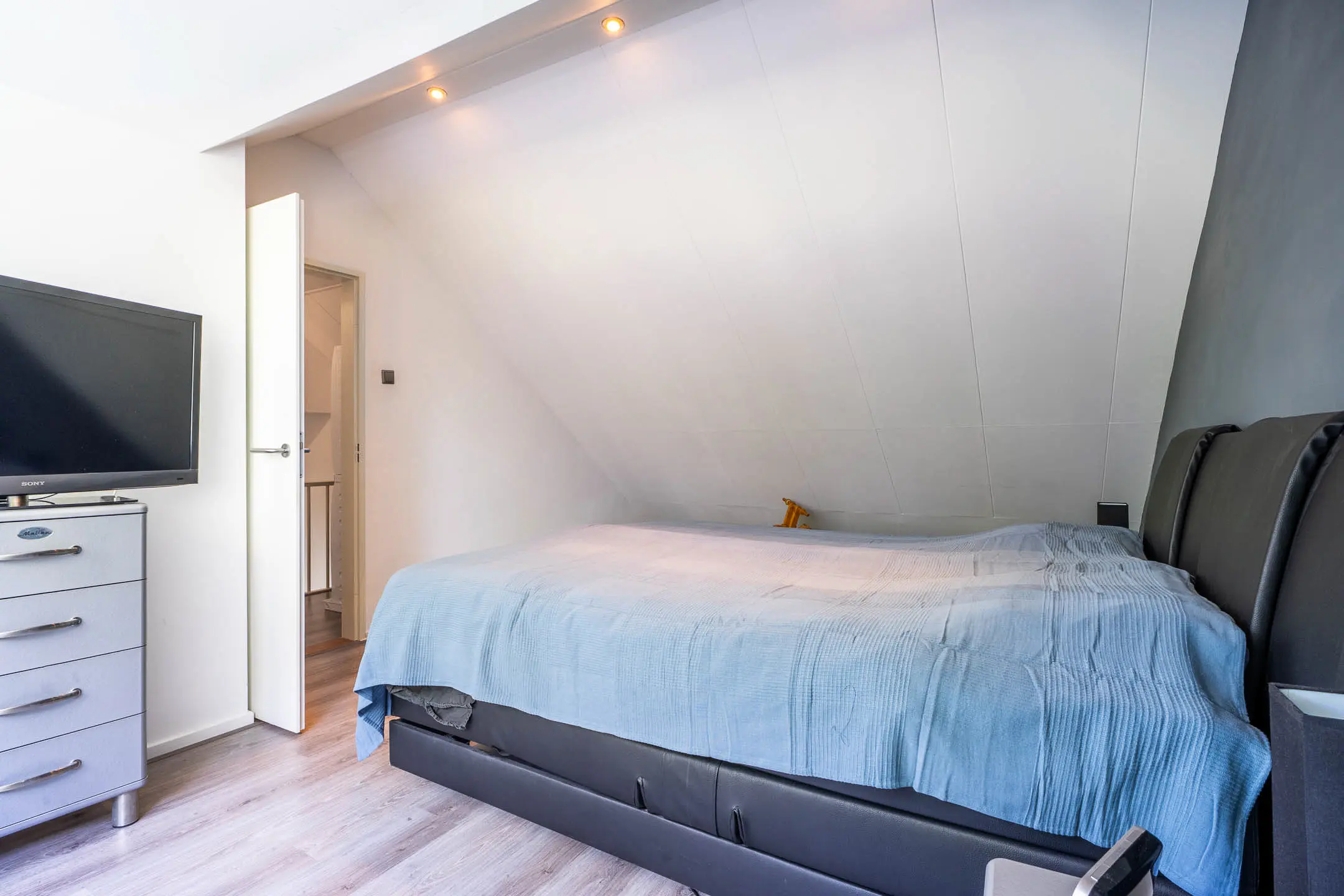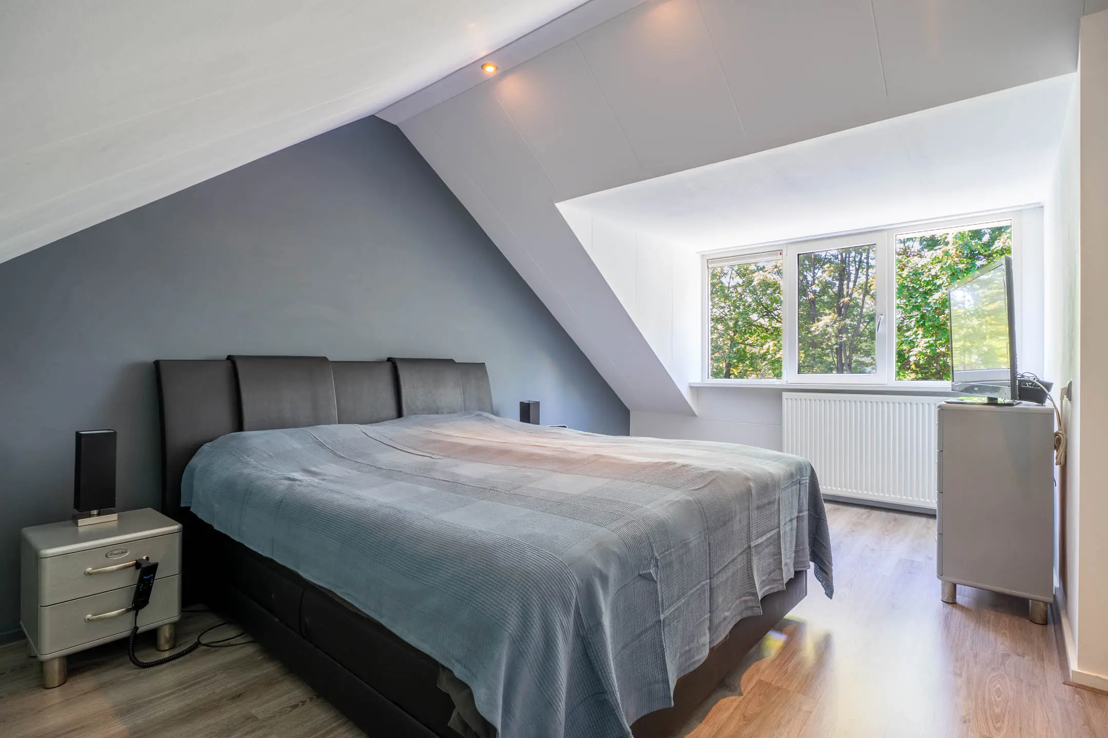 De royale slaapkamer is afgewerkt met stucwerk en een laminaatvloer.