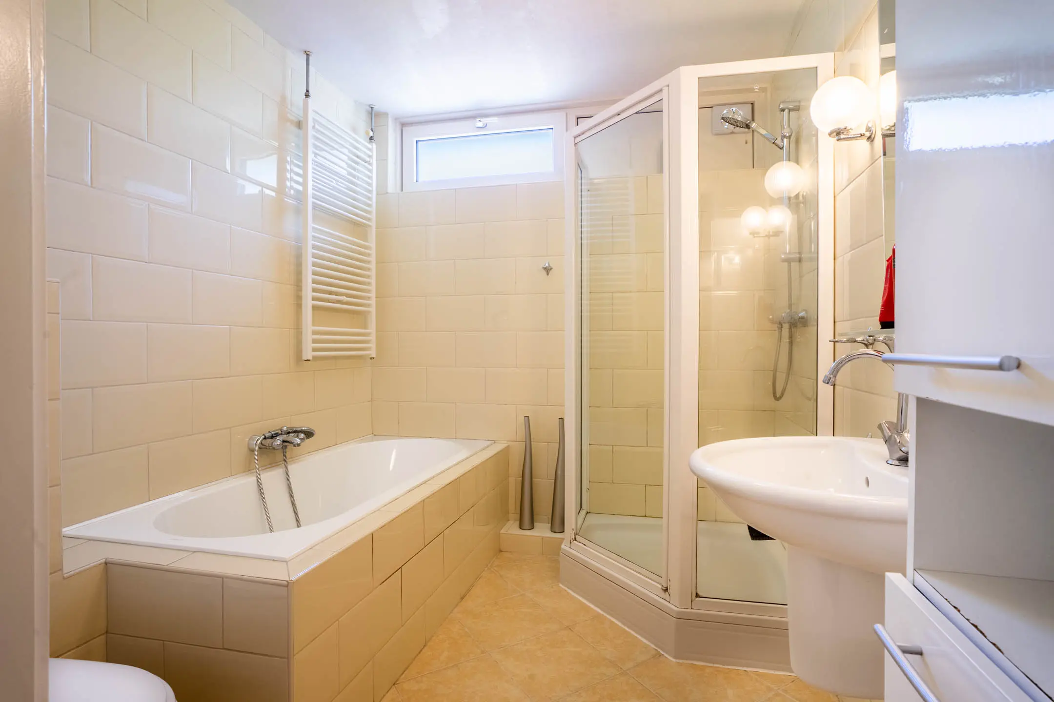 De badkamer is geheel betegeld en uitgerust met een ligbad, aparte douchecabine, toilet en wastafel.