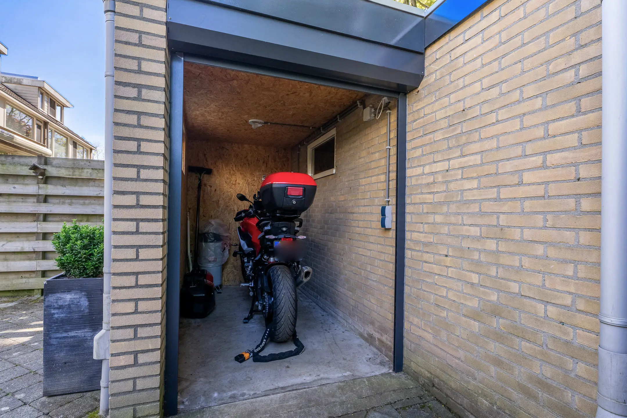 De tuin is gelegen op het westen en voorzien van bestrating en een achterom. Onder de veranda kun je al snel comfortabel buiten zitten door de extra beschutting. De vrijstaande stenen berging is gelegen achter in de tuin. Hier is eveneens een motorgarage met elektrische roldeur. De tuin is goed onderhouden en biedt veel privacy.