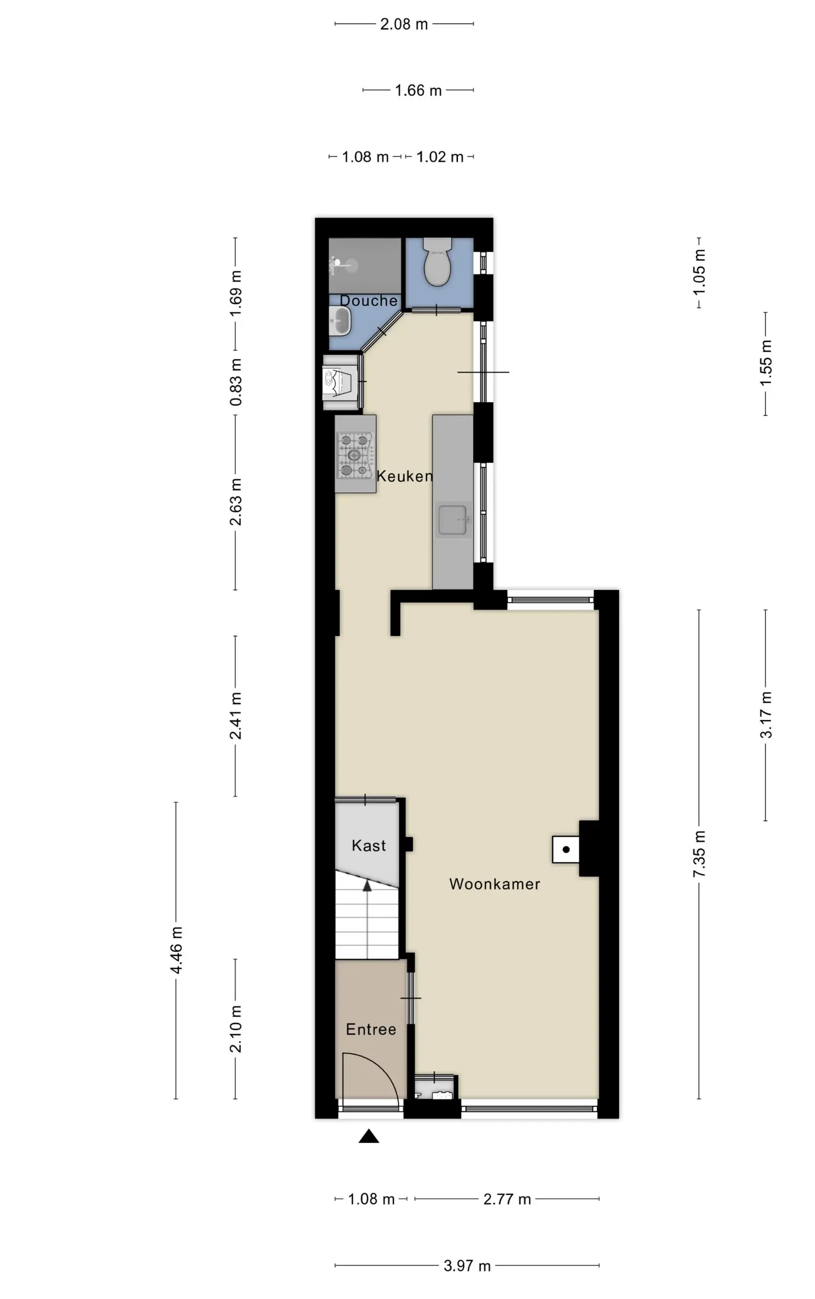 Via de voortuin kom je bij de entree van de woning met hier de hal met trapopgang naar de 1e verdieping en toegang tot de woonkamer.