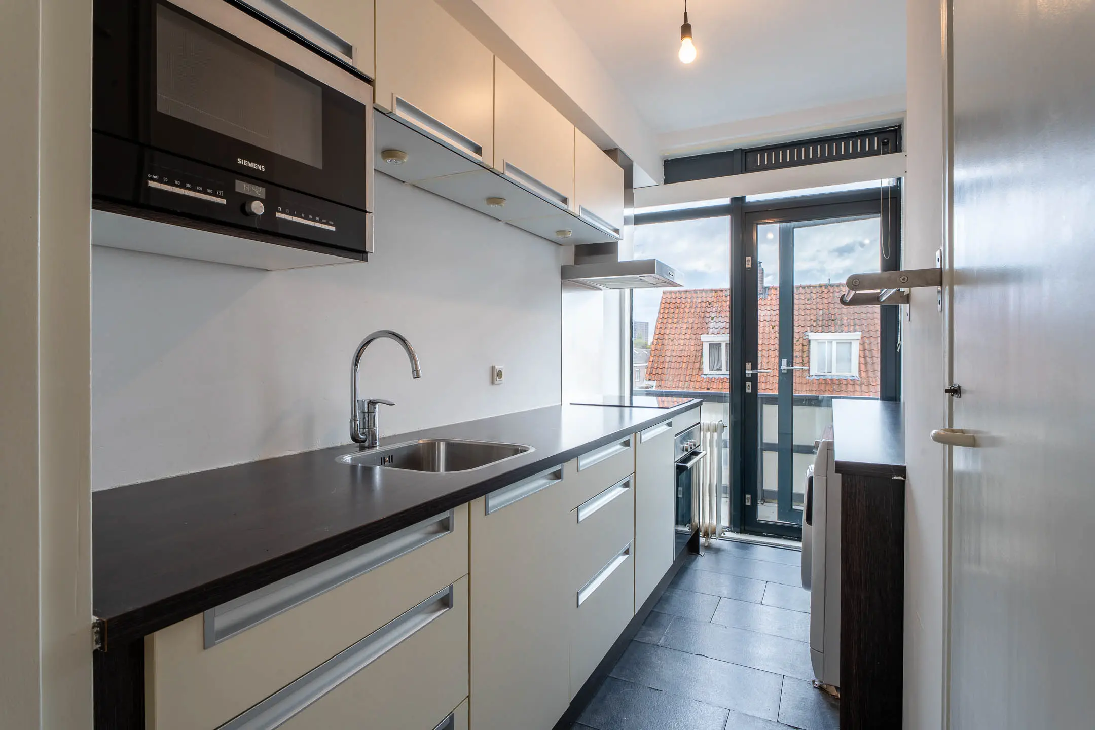 In de moderne keuken zijn twee werkbladen met veel werkruimte. De keuken is ingericht met diverse kasten, lades en inbouwapparatuur, zoals: een keramische kookplaat, afzuigkap, koelkast, magnetron en een elektrische oven. Onder het tweede werkblad is de aansluiting van de vaatwasmachine en de wasmachine. Ook vanuit de keuken heb je via een loopdeur toegang tot het balkon.