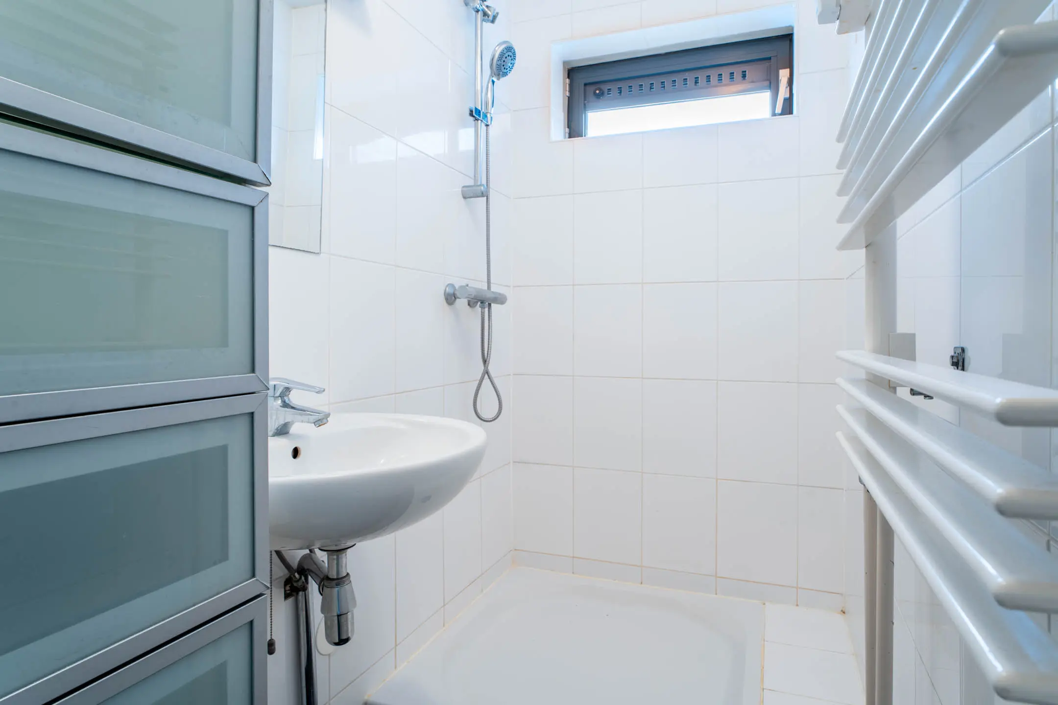 Geheel betegelde badkamer, ingericht met een douche, wastafel en designradiator.