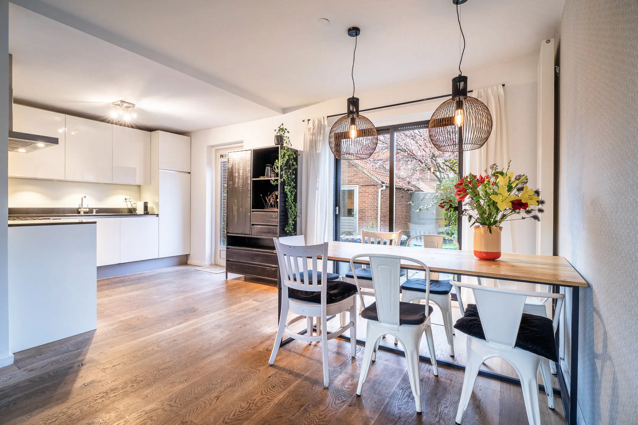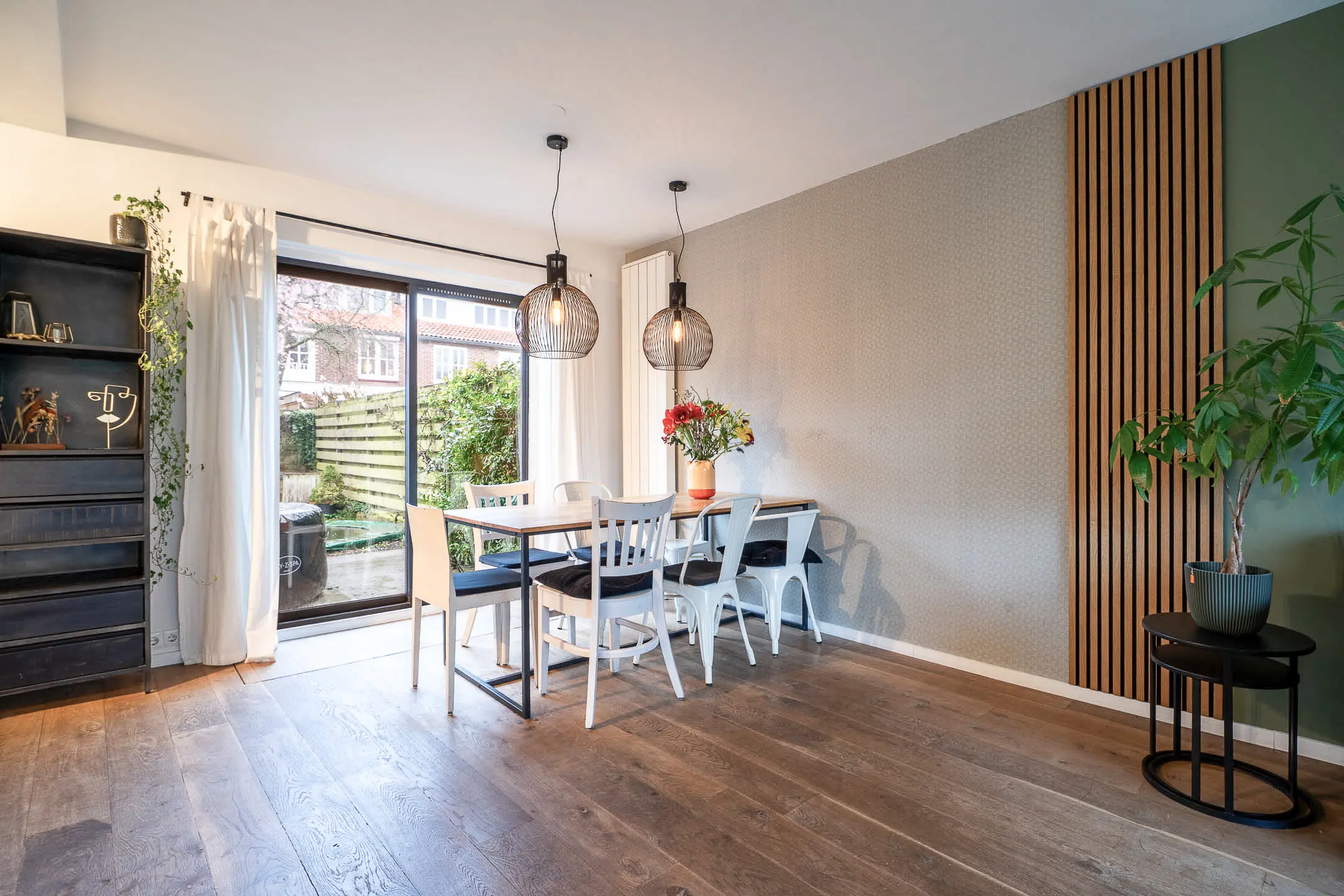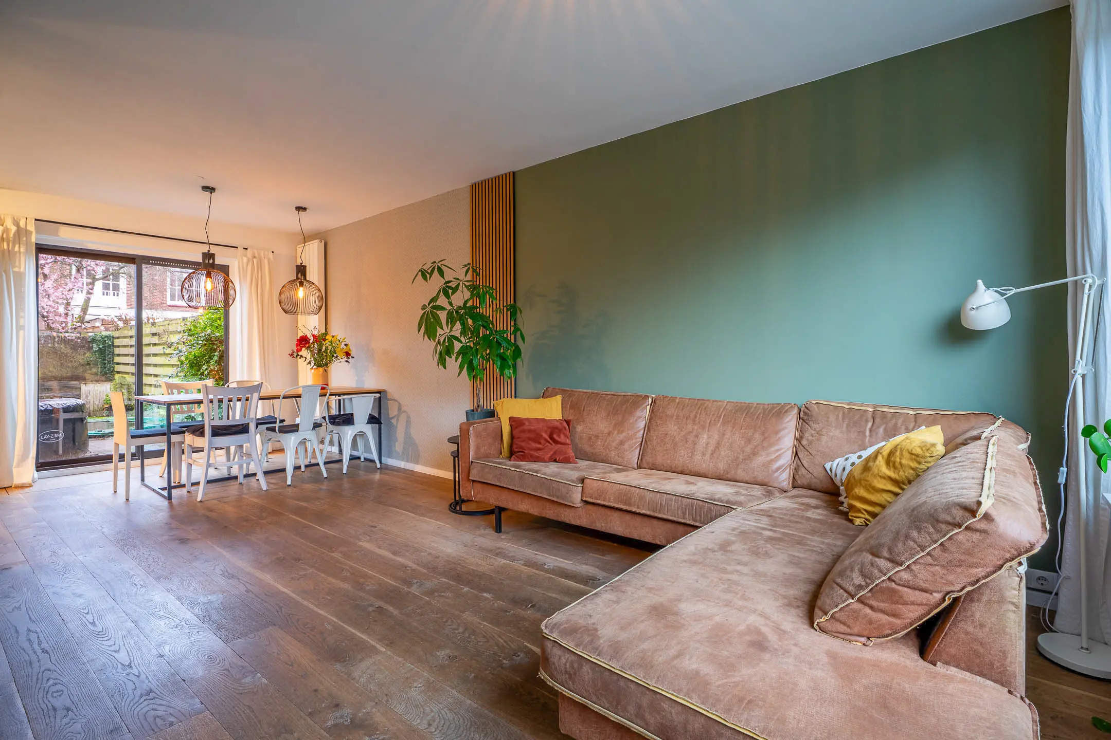 De sfeervolle woonkamer is heerlijk licht dankzij de grote raampartijen en is afgewerkt met een warme houten planken vloer. De ruimte biedt volop mogelijkheden voor een gezellige zit- en eethoek. Via de schuifpui of de deur in de keuken stap je zo de achtertuin in – perfect voor binnen-buiten leven.