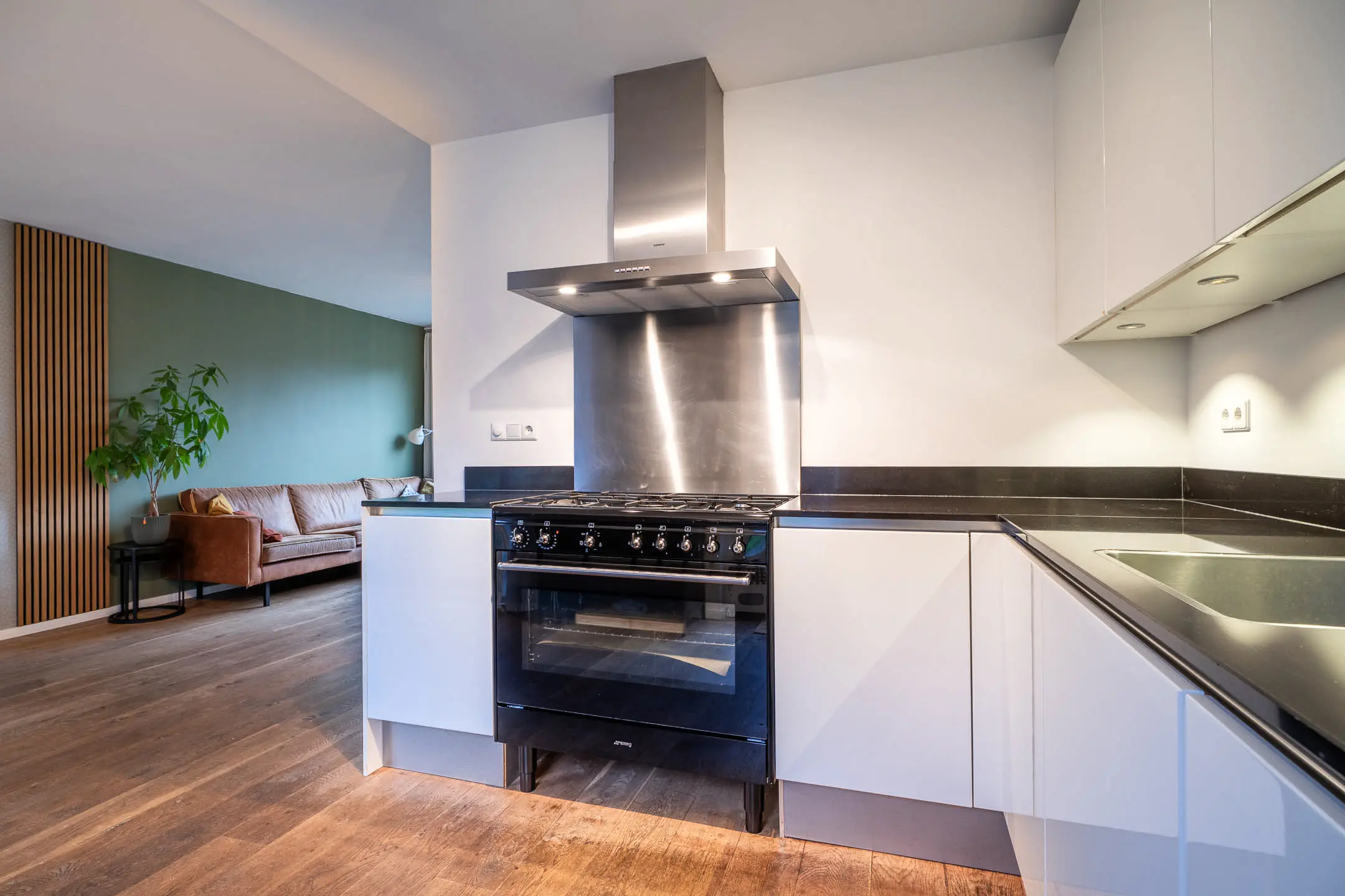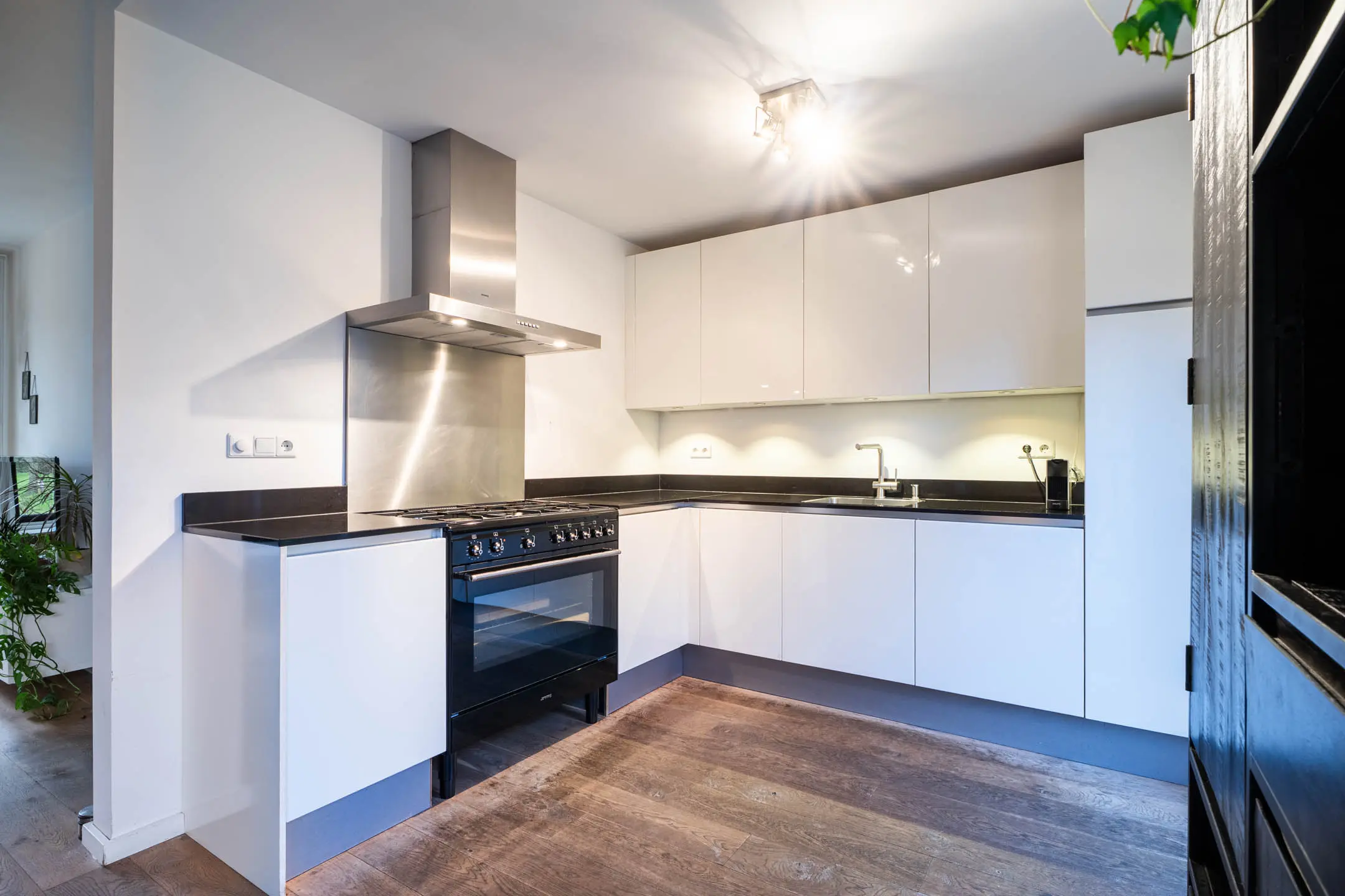 Aan de achterzijde bevindt zich de moderne, lichte keuken in hoekopstelling. Deze is voorzien van veel werk- en bergruimte en uitgerust met diverse inbouwapparatuur, waaronder een 5-pits gaskookplaat met oven, afzuigkap, vaatwasser en koelkast.