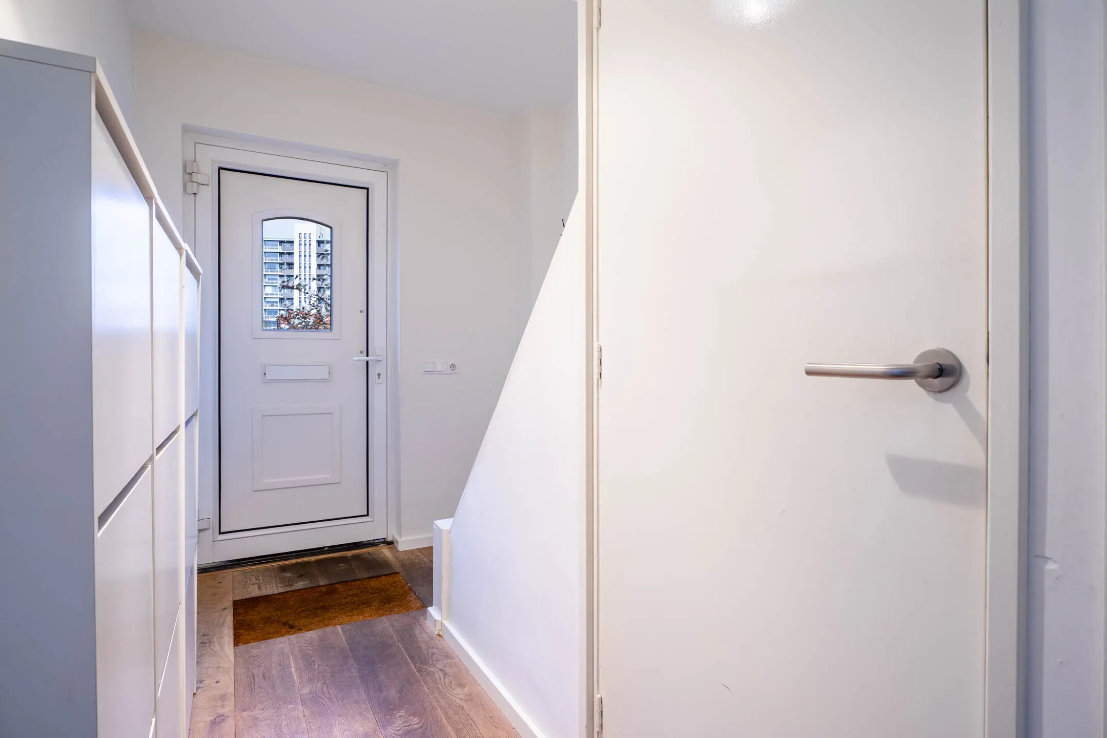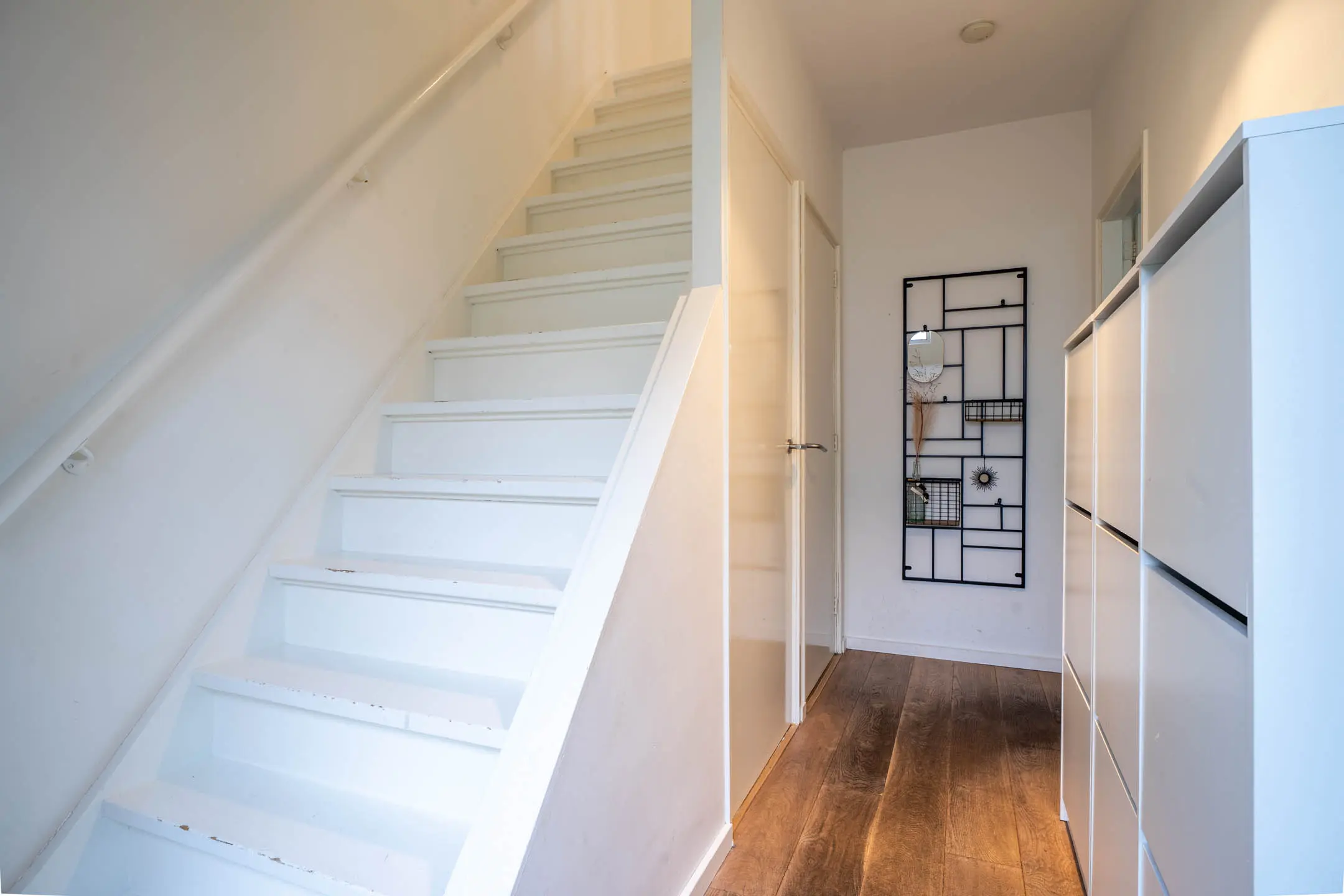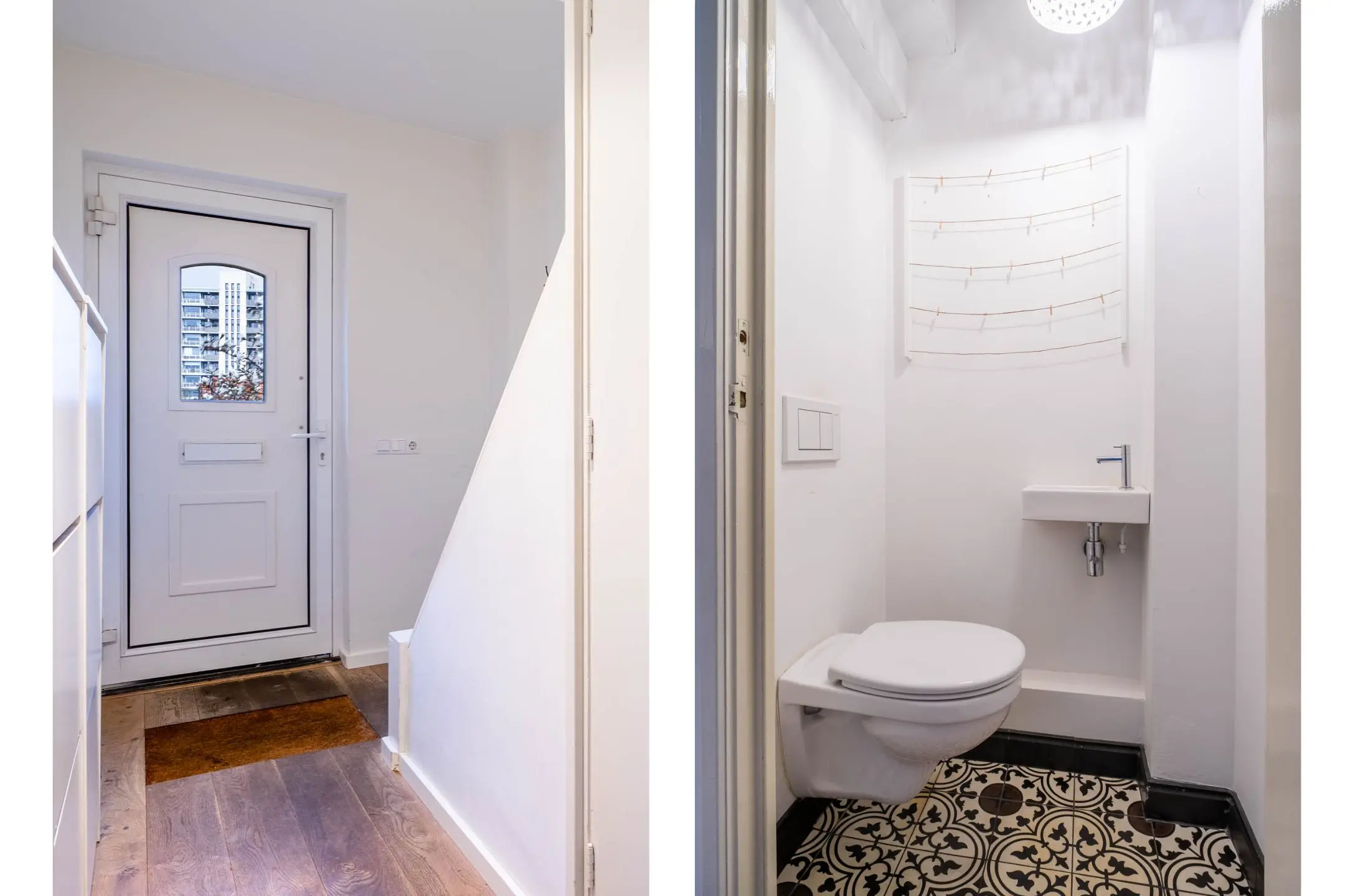 Via de privacy biedende voortuin bereik je de entree van de woning. In de hal vind je de moderne toiletruimte met zwevend toilet en fonteintje, evenals een praktische kelderkast met groepenkast. Vanuit hier heb je toegang tot de woonkamer en de eerste verdieping.