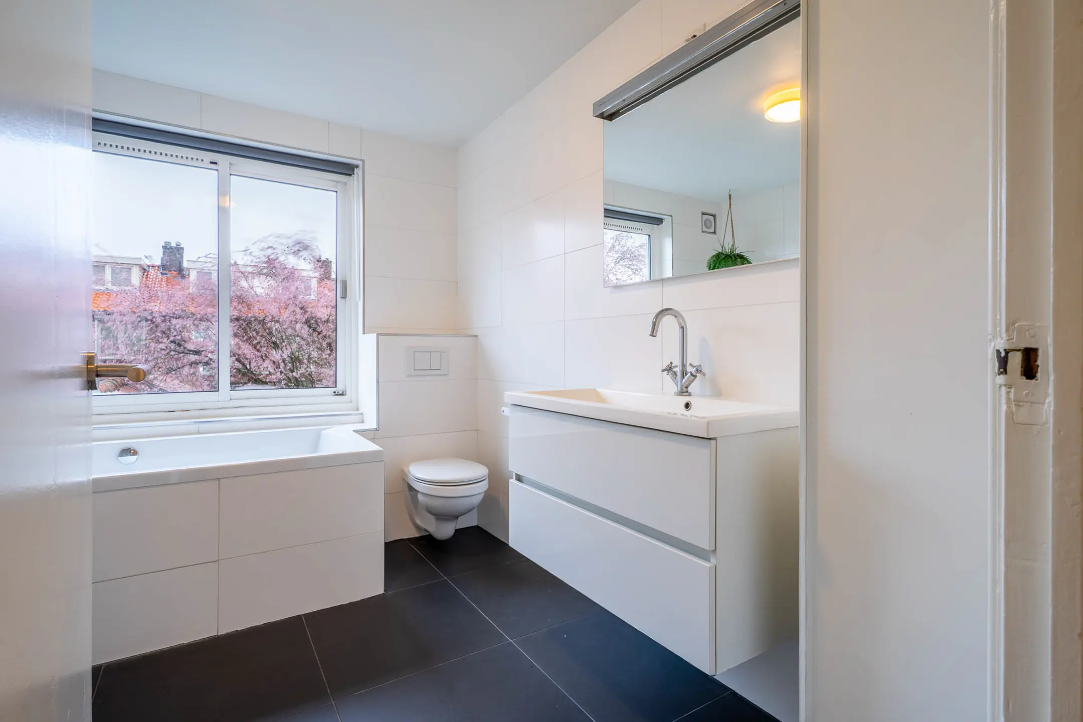 De volledig betegelde badkamer is compleet ingericht met een ligbad, douche, zwevend toilet en wastafel.