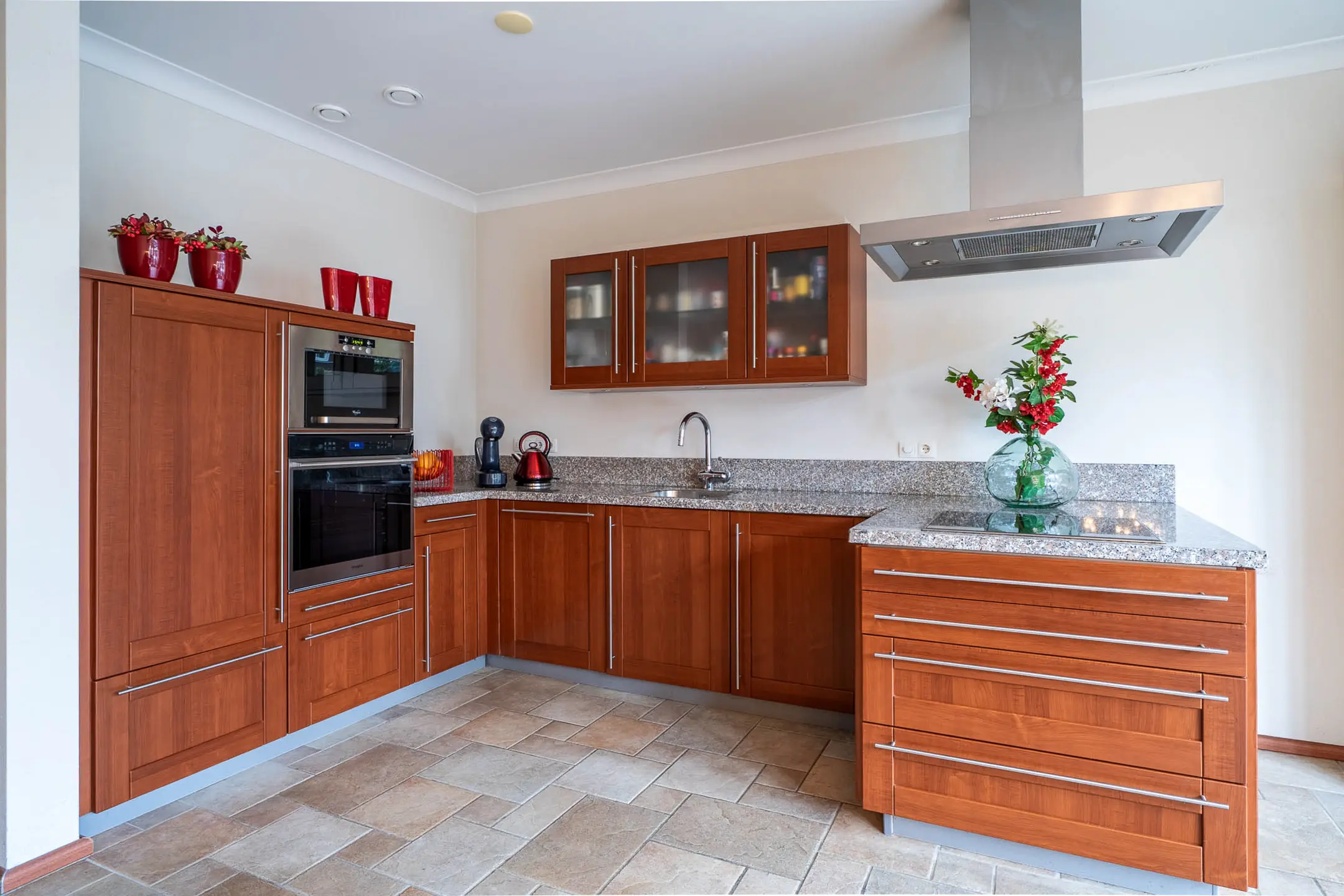 • Royale open keuken in een U-opstelling met diverse inbouwapparatuur.