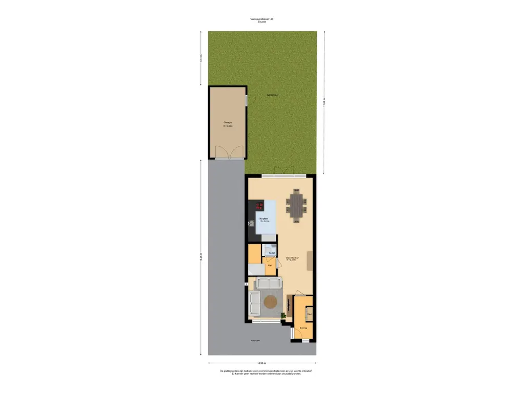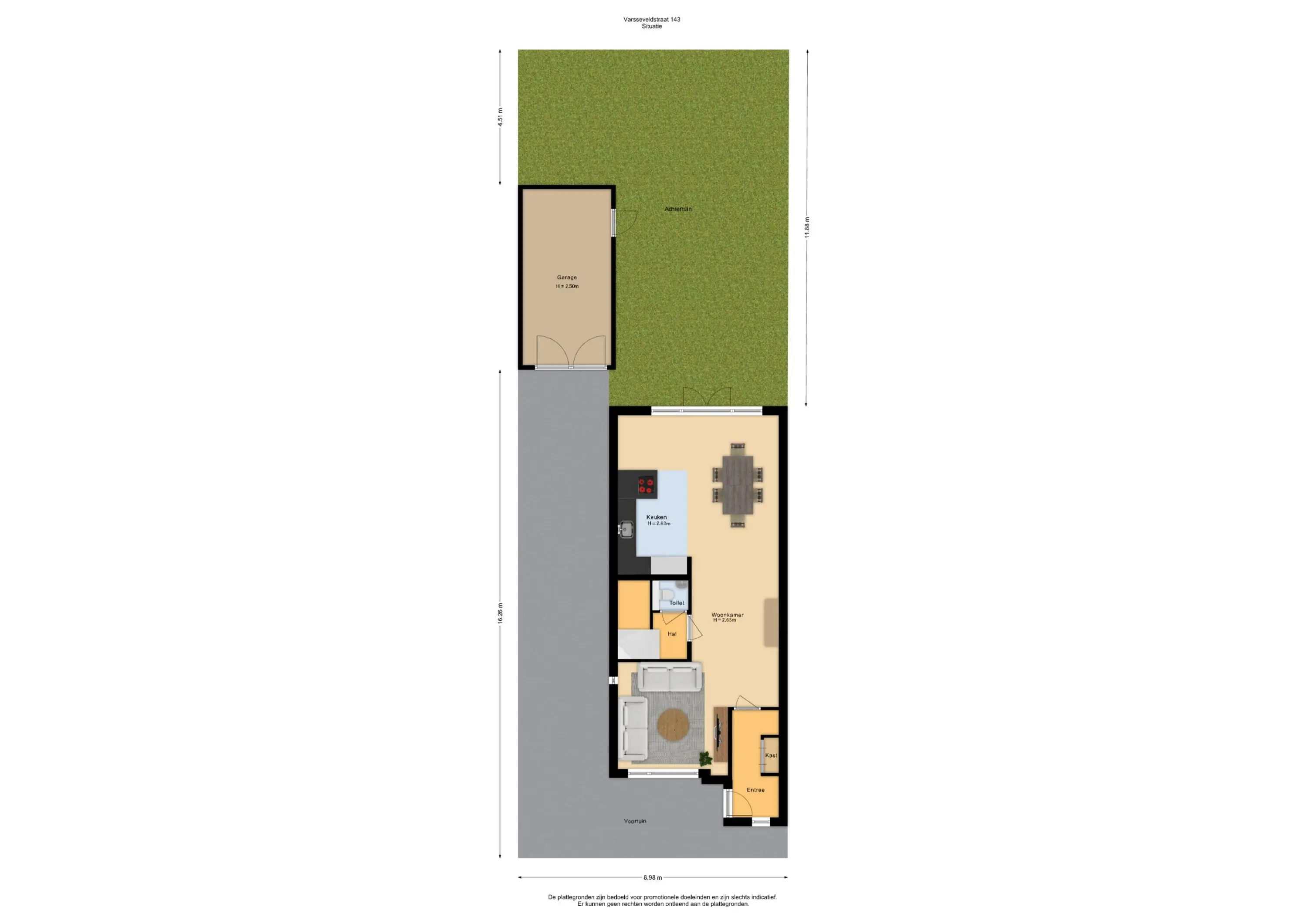 Buiten: Een voortuin en achtertuin met vrijstaande stenen garage.