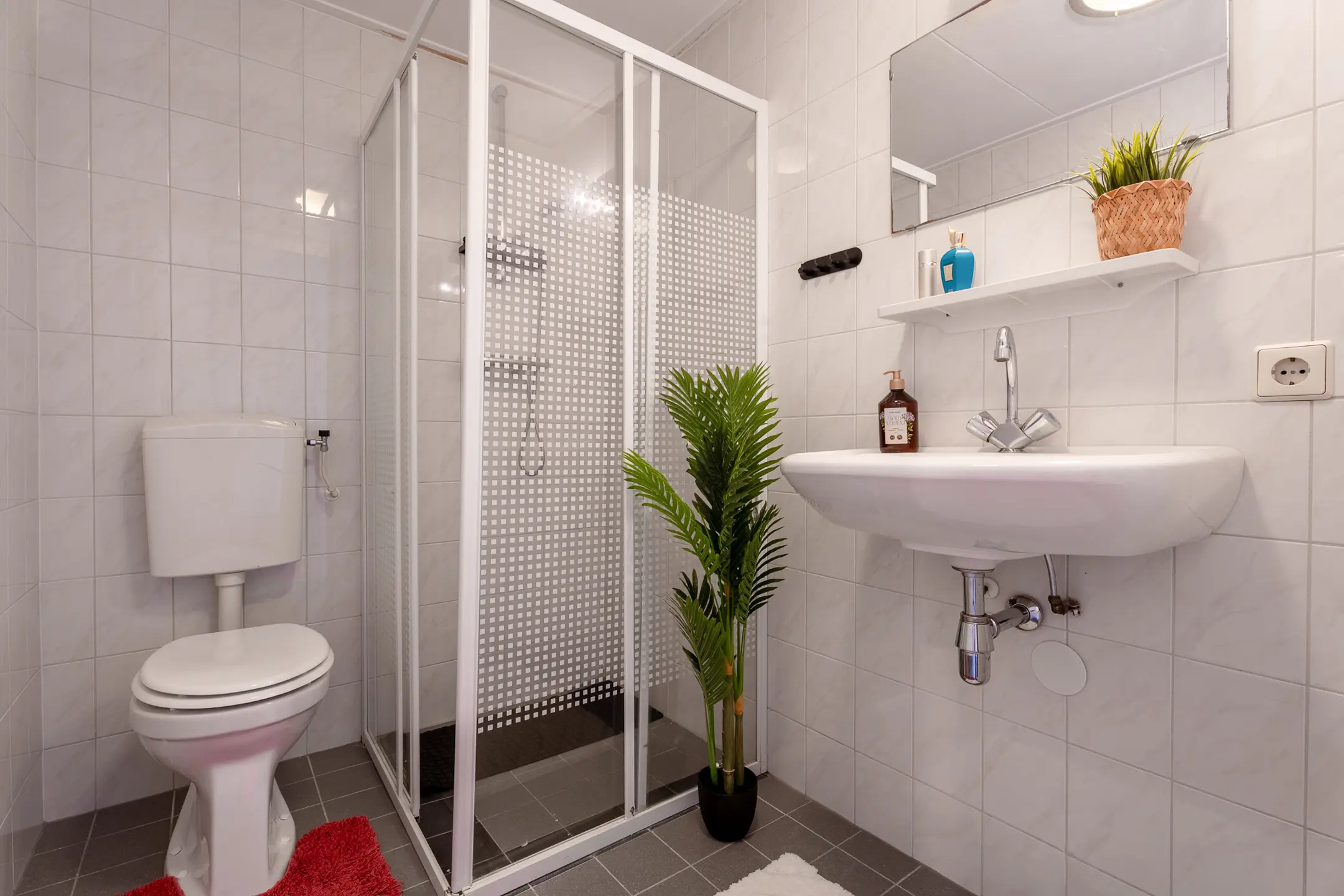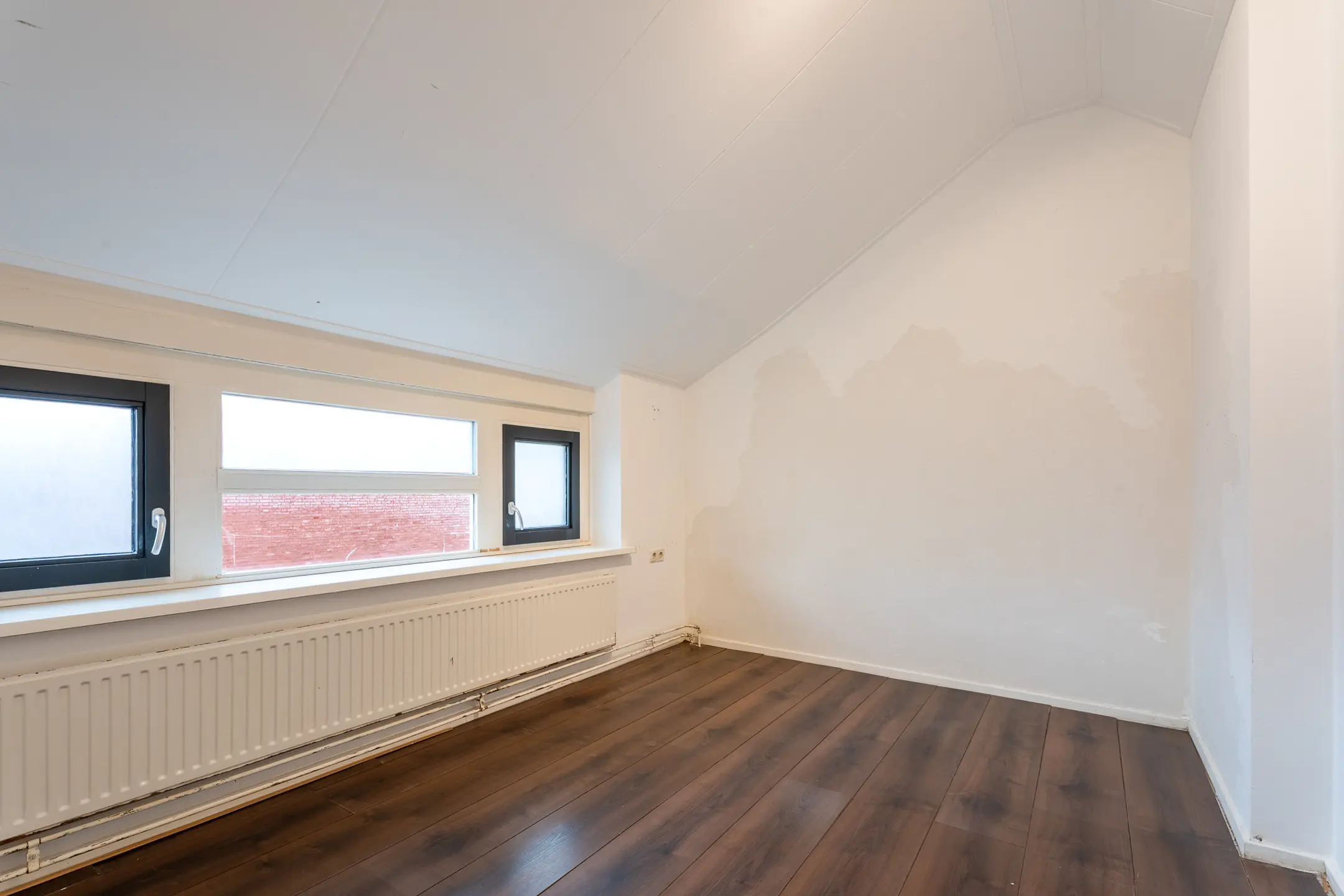 Overloop met toegang tot twee mooie slaapkamers van ca. 10 m² en bijna 13 m², de badkamer en een vaste kast. Ook deze verdieping is voorzien van een laminaatvloer en gestucte wandafwerking. De compacte badkamer beschikt over een douche, een tweede toilet en een wastafel. De ruimte is keurig betegeld met witte wandtegels en voorzien van mechanische ventilatie.