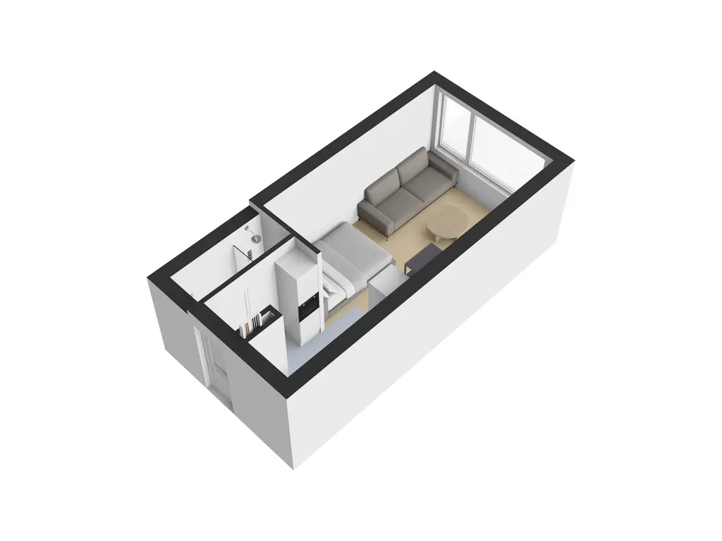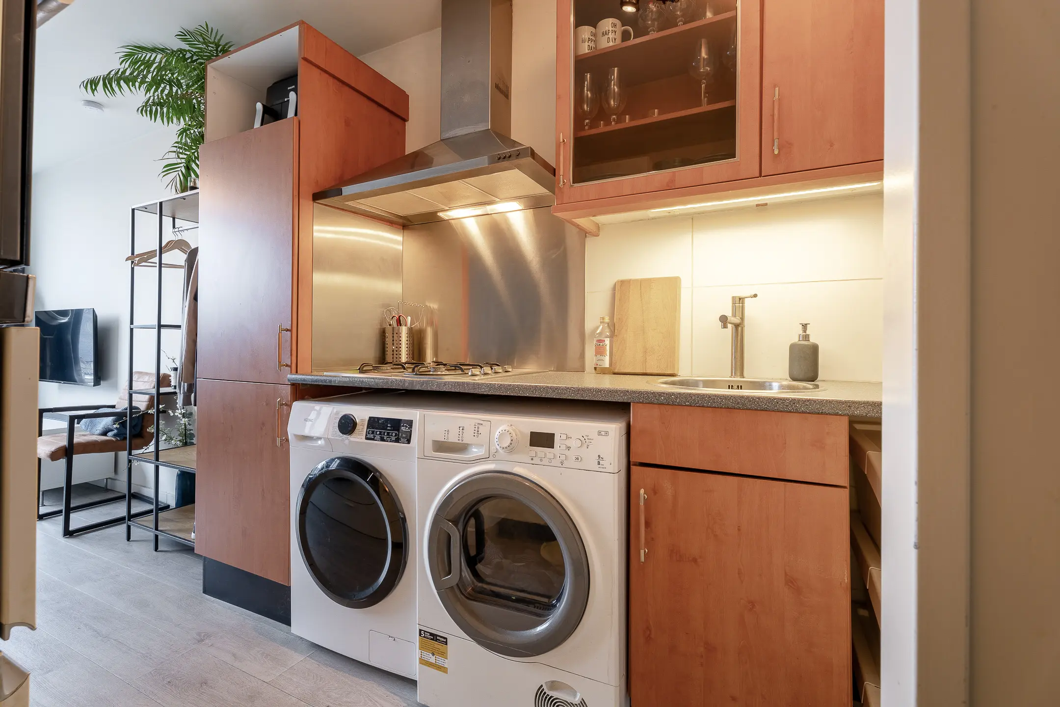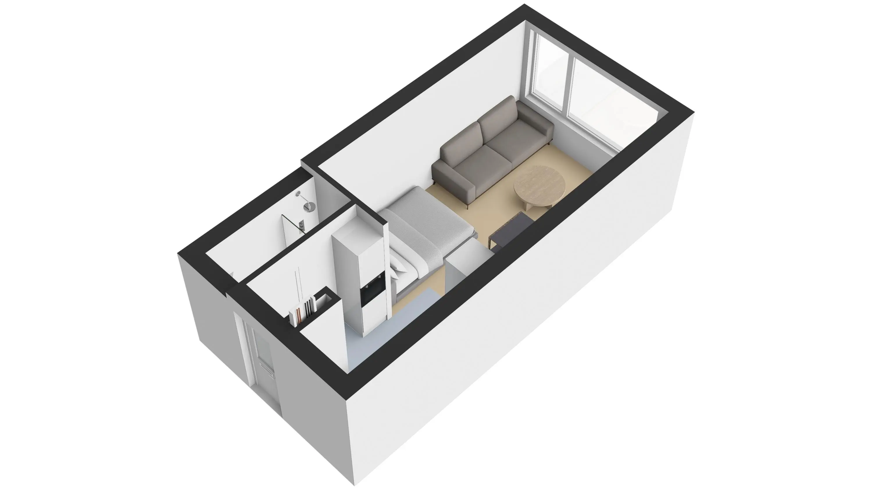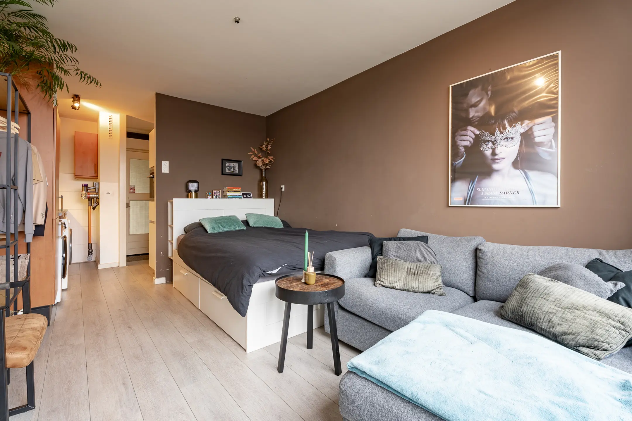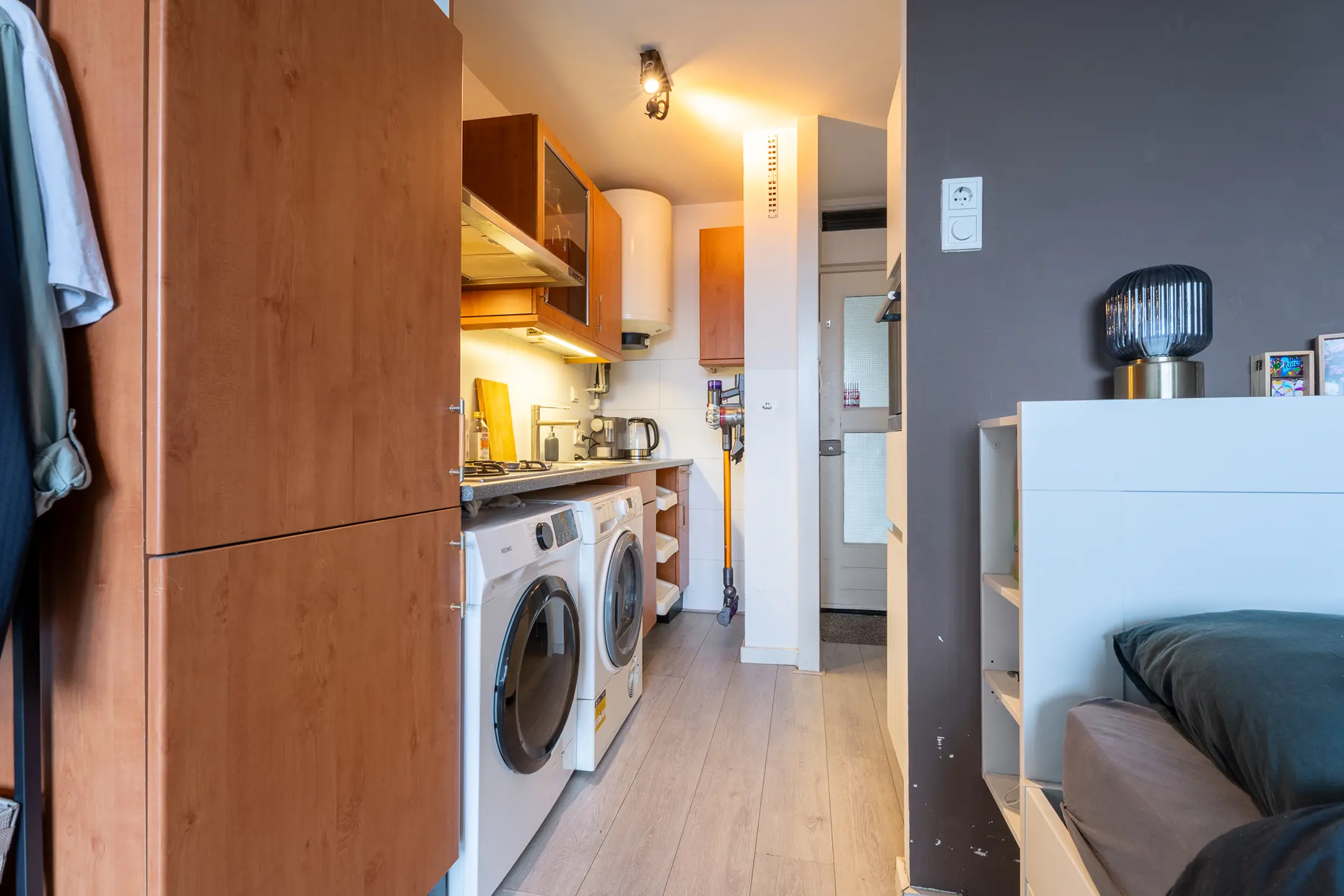 De keuken is voorzien van koelkast, gas koken, afzuigkap, spoelbak met mengkraan en aansluitingen voor wasmachine en droger. Daarnaast zijn er volop boven- en onderkastjes voor de nodige opbergruimte. Het woon-/slaapgedeelte is van goed formaat en heerlijk licht door aanwezigheid van het grote gevelraam en strak afwerkt met stucwerk wanden en een lichte laminaatvloer..