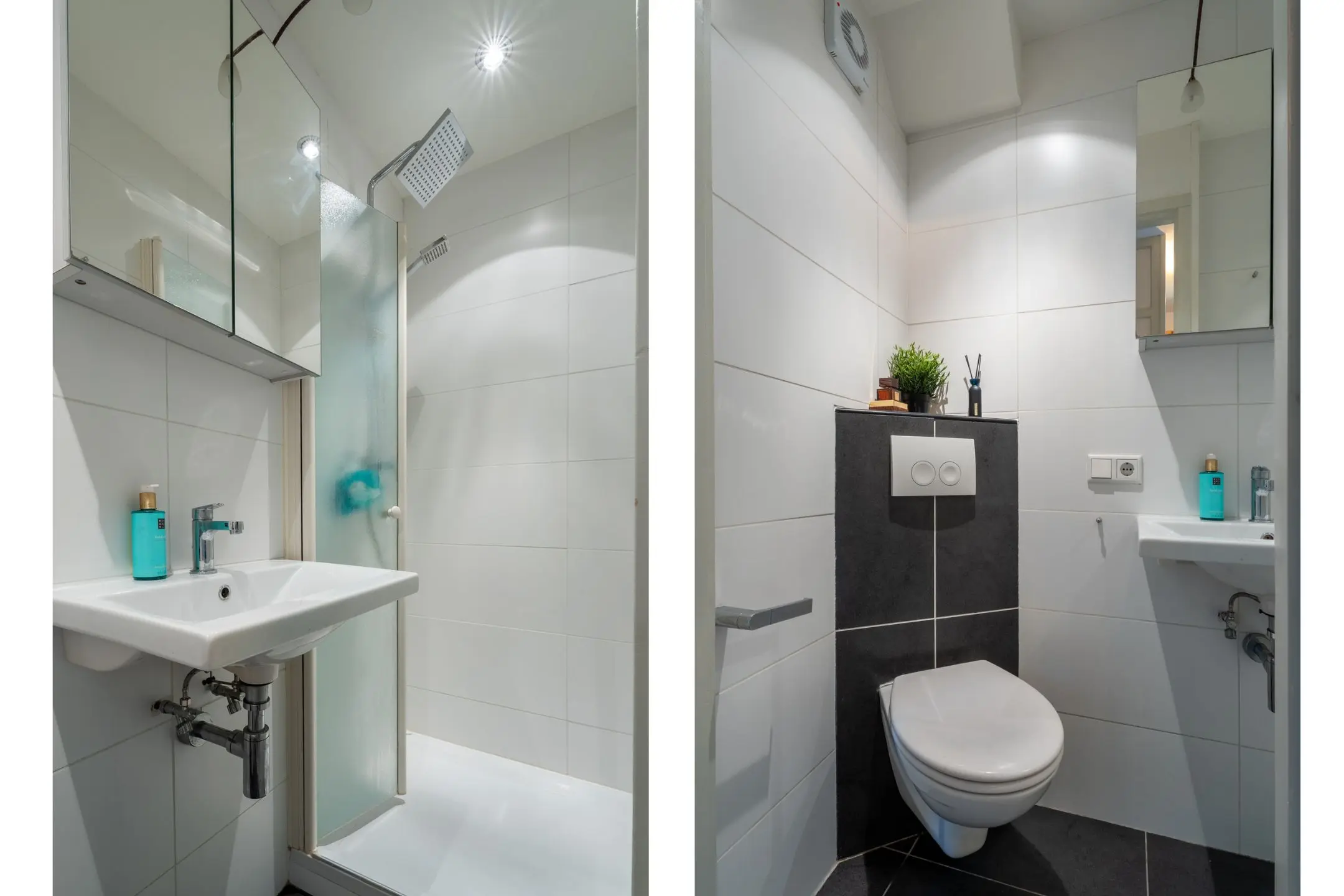 We beginnen bij de entree. Links bevindt zich de badkamer met een moderne ingerichte ruimte met het toilet, wastafel en een fijne douchecabine.