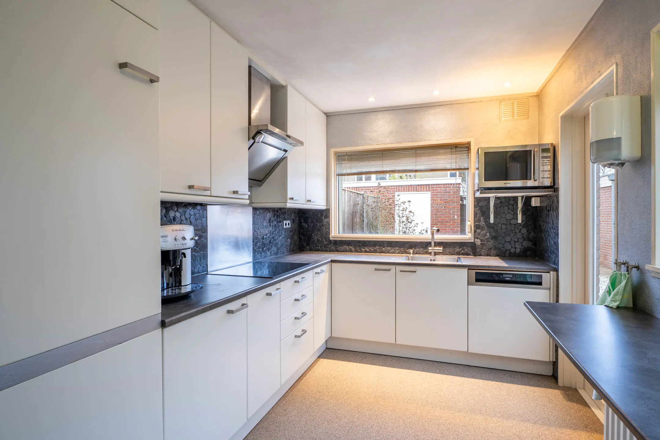 De nette keuken is in de aanbouw van de woning. De keuken heeft diverse inbouw apparatuur waaronder een koelkast, inductie kookplaat met afzuigkap en een vaatwasser. Via een loopdeur is de achtertuin bereikbaar.