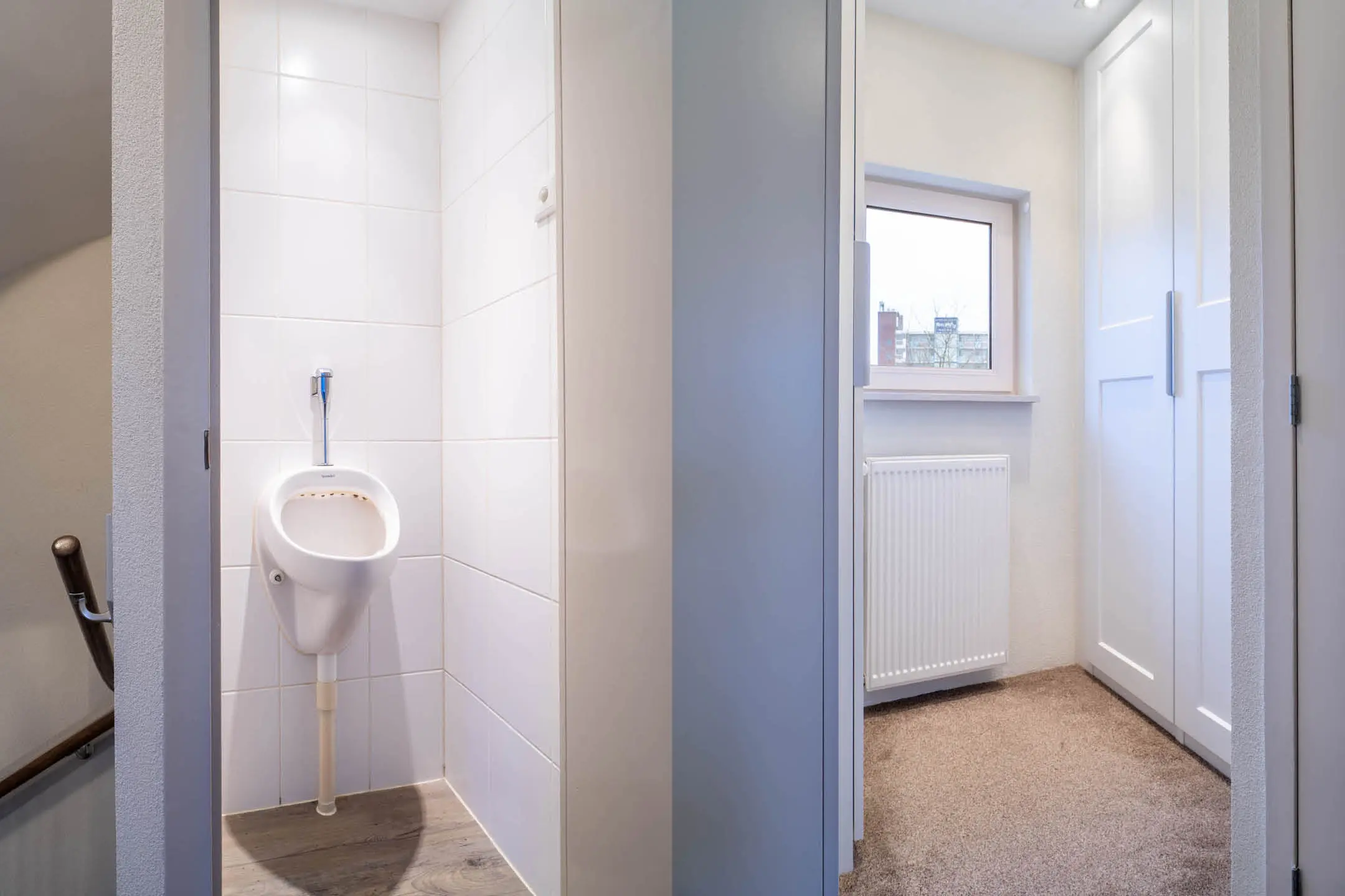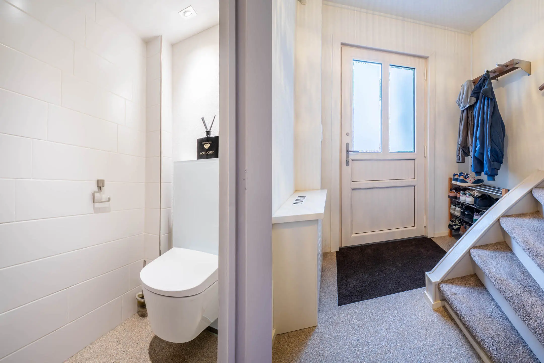 Via de entree kom je in de hal van de woning. Hier is de vernieuwde meterkast met 12 groepen en 3 aardlekschakelaars. De toiletruimte heeft een zwevend toilet met fonteintje, de toiletruimte is vergroot dus ideaal als je wat langer bent.