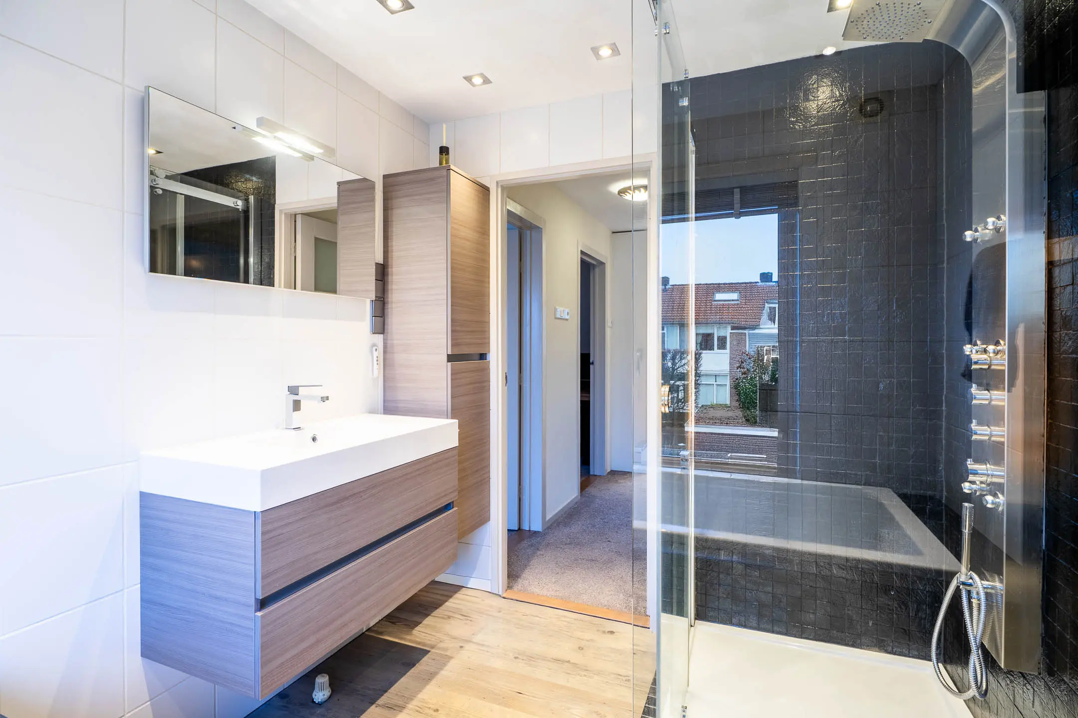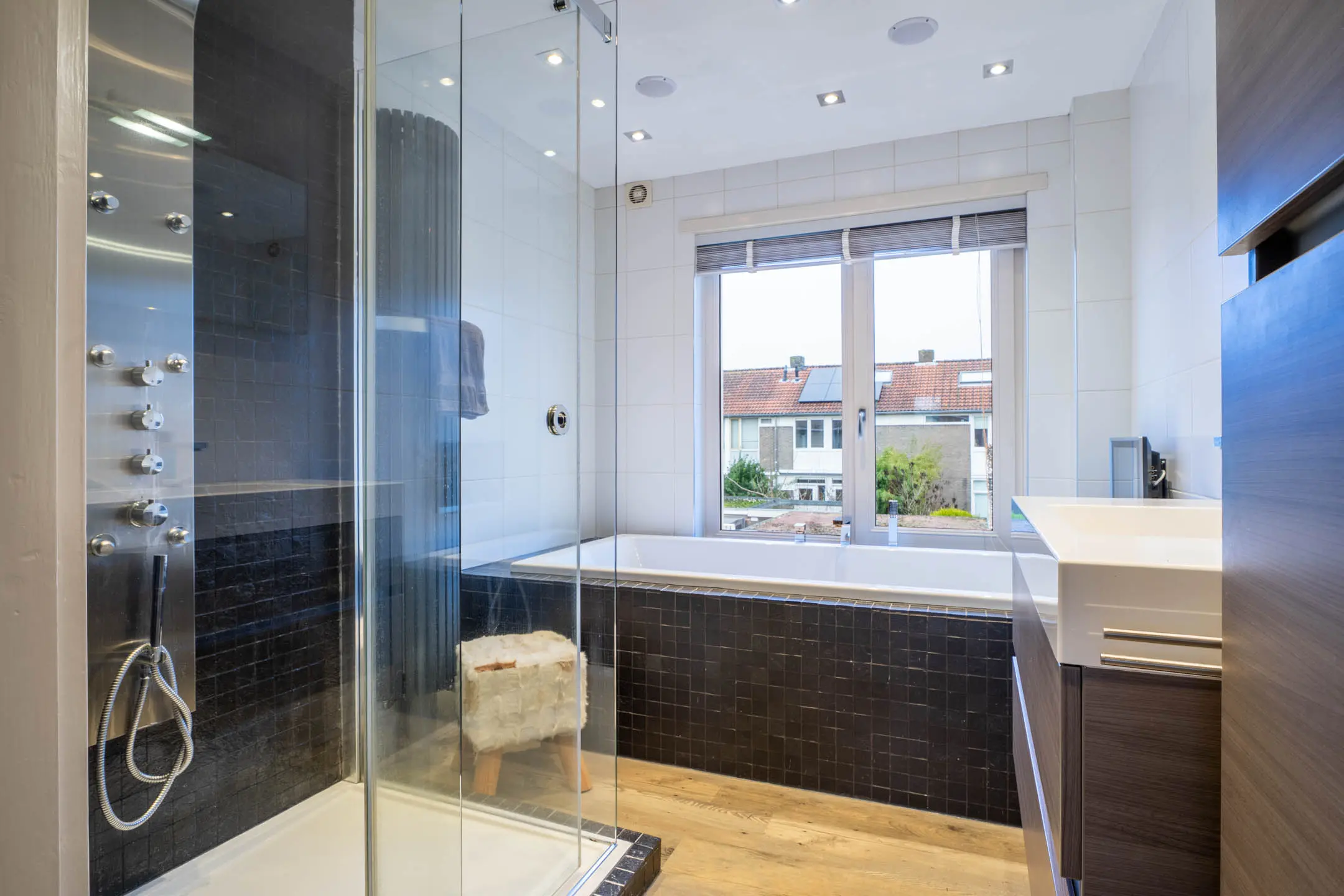 De moderne badkamer is voorzien van een royaal ligbad en aparte douchecabine. Er is een wastafelmeubel en de vloer is afgewerkt met pvc en heeft vloerverwarming.